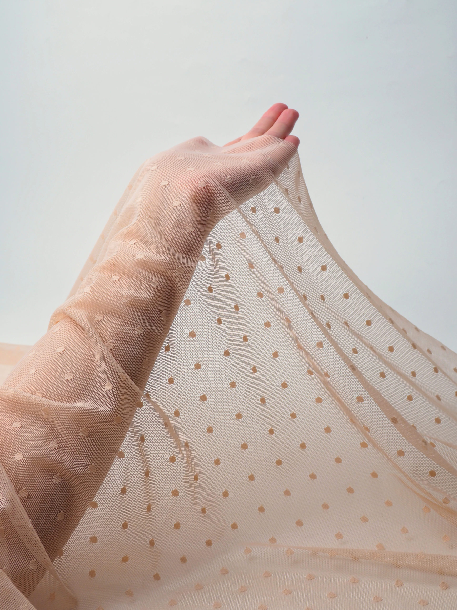 Эластичная сетка бежевая великолепно держит форму, хорошо тянется в обе стороны, не осыпается по краям, служит в течение многих лет. Стрейч сетка универсальный материал. Её можно использовать для пошива нижнего белья, платьев, костюмов, купальников (для вставок и подклада).