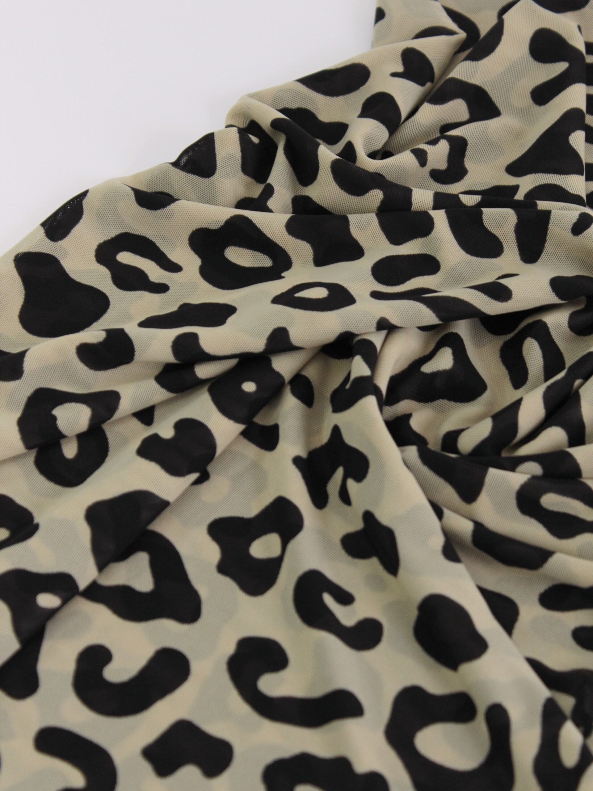 Эластичная сетка стрейч бежевого оттенка c принтом барс. Бежевая сетка для нижнего белья с черным анималистическим принтом.