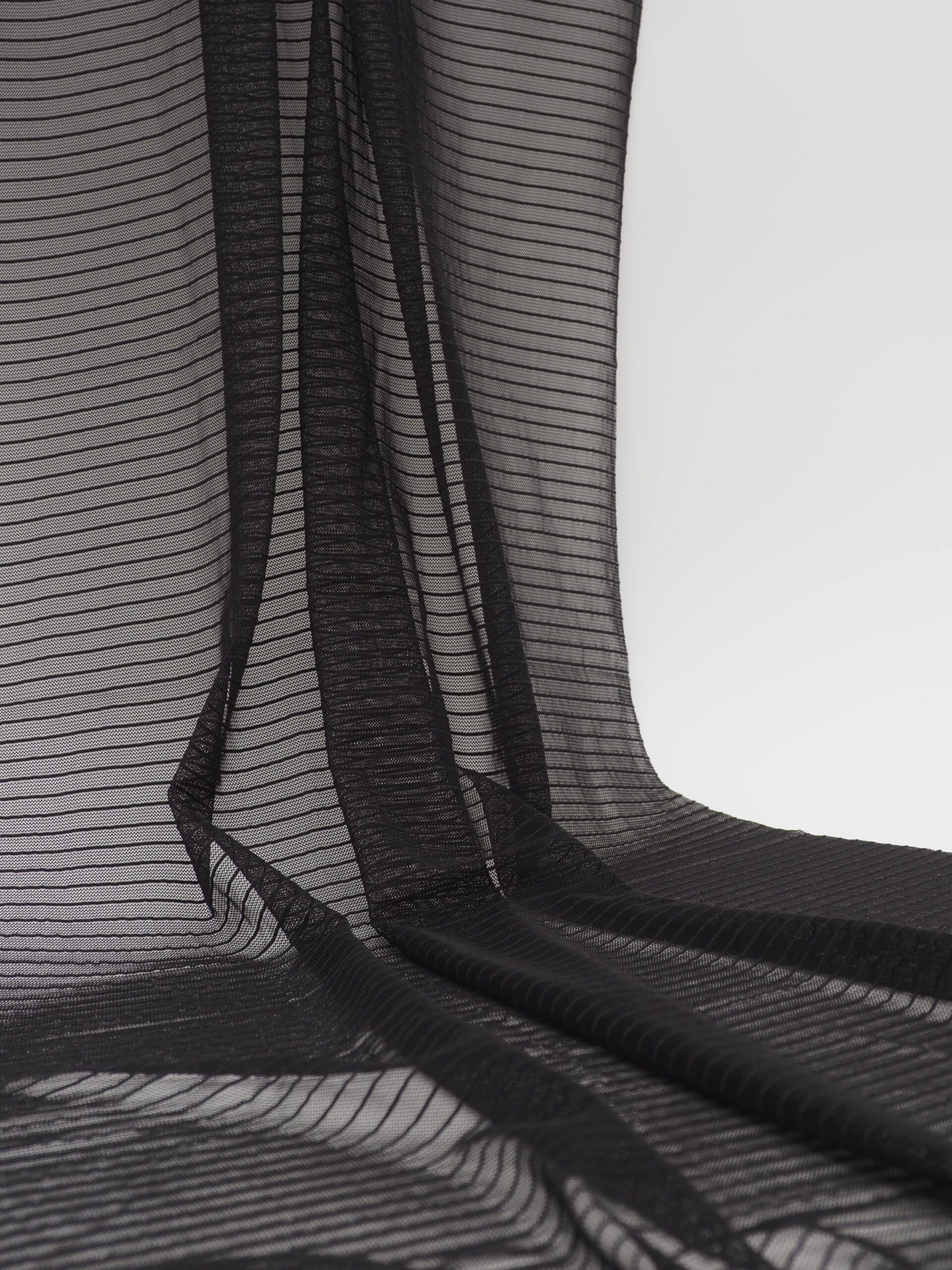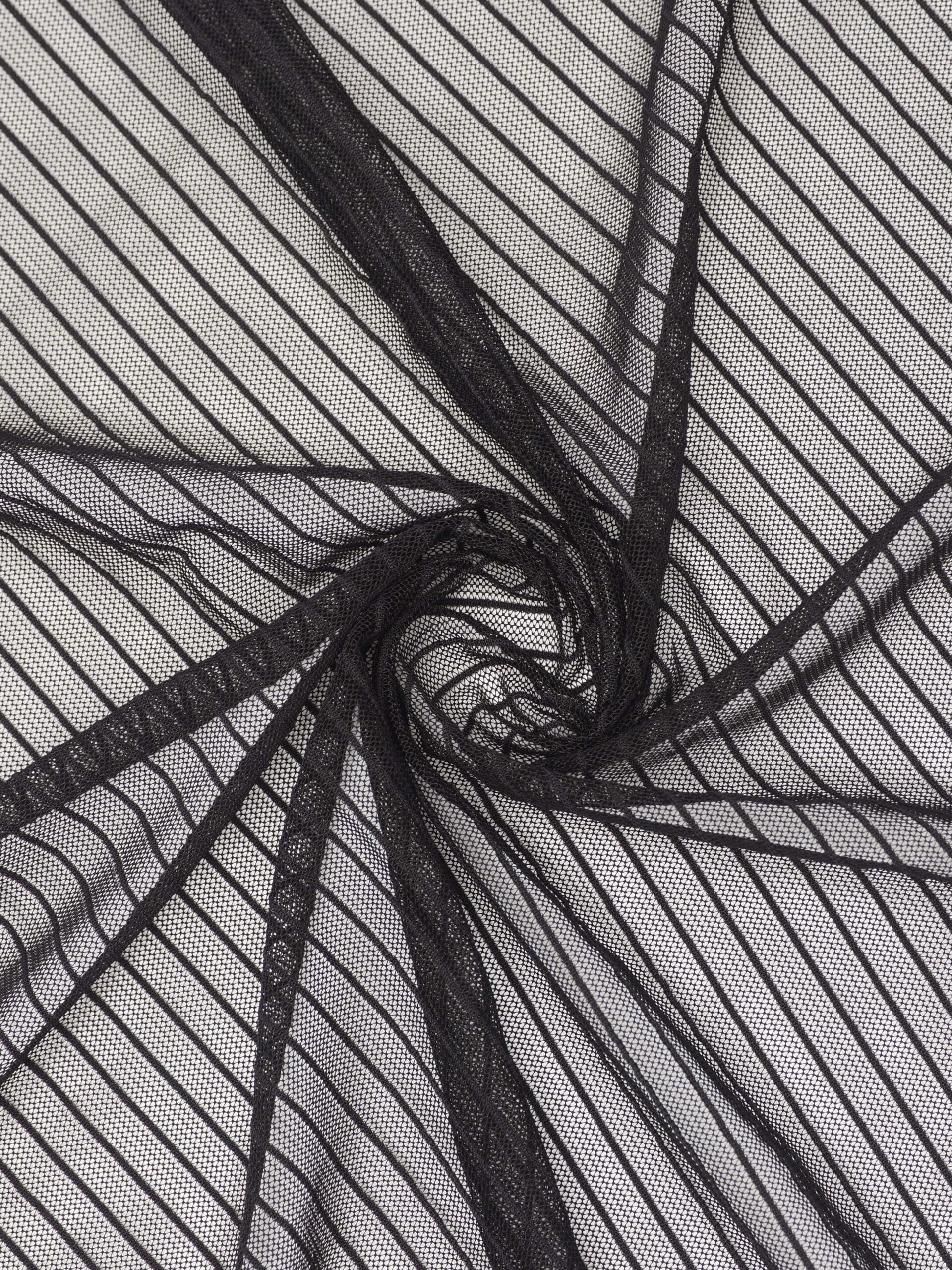 Сетка в полоску черная эластичная великолепно держит форму, слабо тянется в обе стороны, не осыпается по краям, служит в течение многих лет. Сетка универсальный материал. Её можно использовать для пошива нижнего белья, платьев, костюмов, купальников (для вставок и подклада).