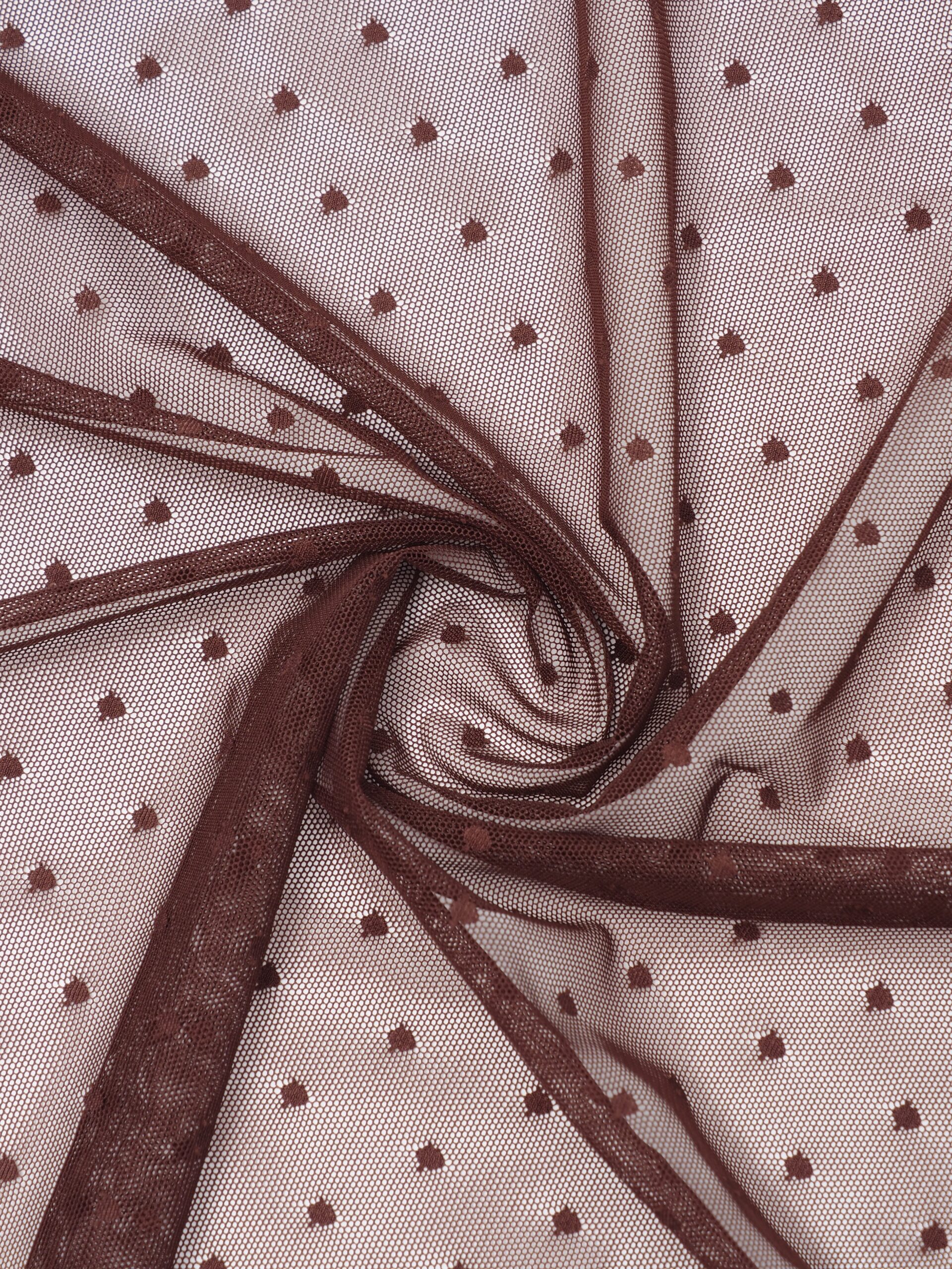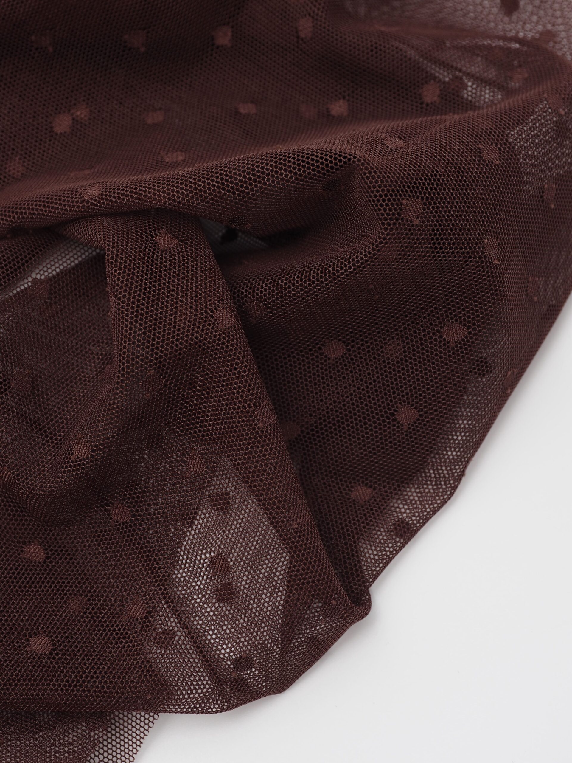 Эластичная сетка горошек шоколад великолепно держит форму, хорошо тянется в обе стороны, не осыпается по краям, служит в течение многих лет. Стрейч сетка универсальный материал. Её можно использовать для пошива нижнего белья, платьев, костюмов, купальников (для вставок и подклада).
