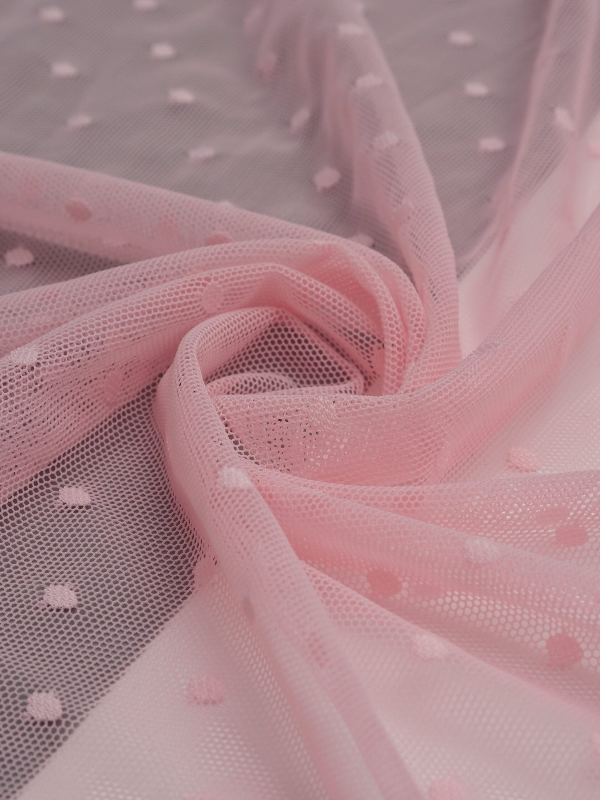 Эластичная сетка нежно-розовая в горошек великолепно держит форму, хорошо тянется в обе стороны, не осыпается по краям, служит в течение многих лет. Стрейч сетка универсальный материал. Её можно использовать для пошива нижнего белья, платьев, костюмов, купальников (для вставок и подклада).