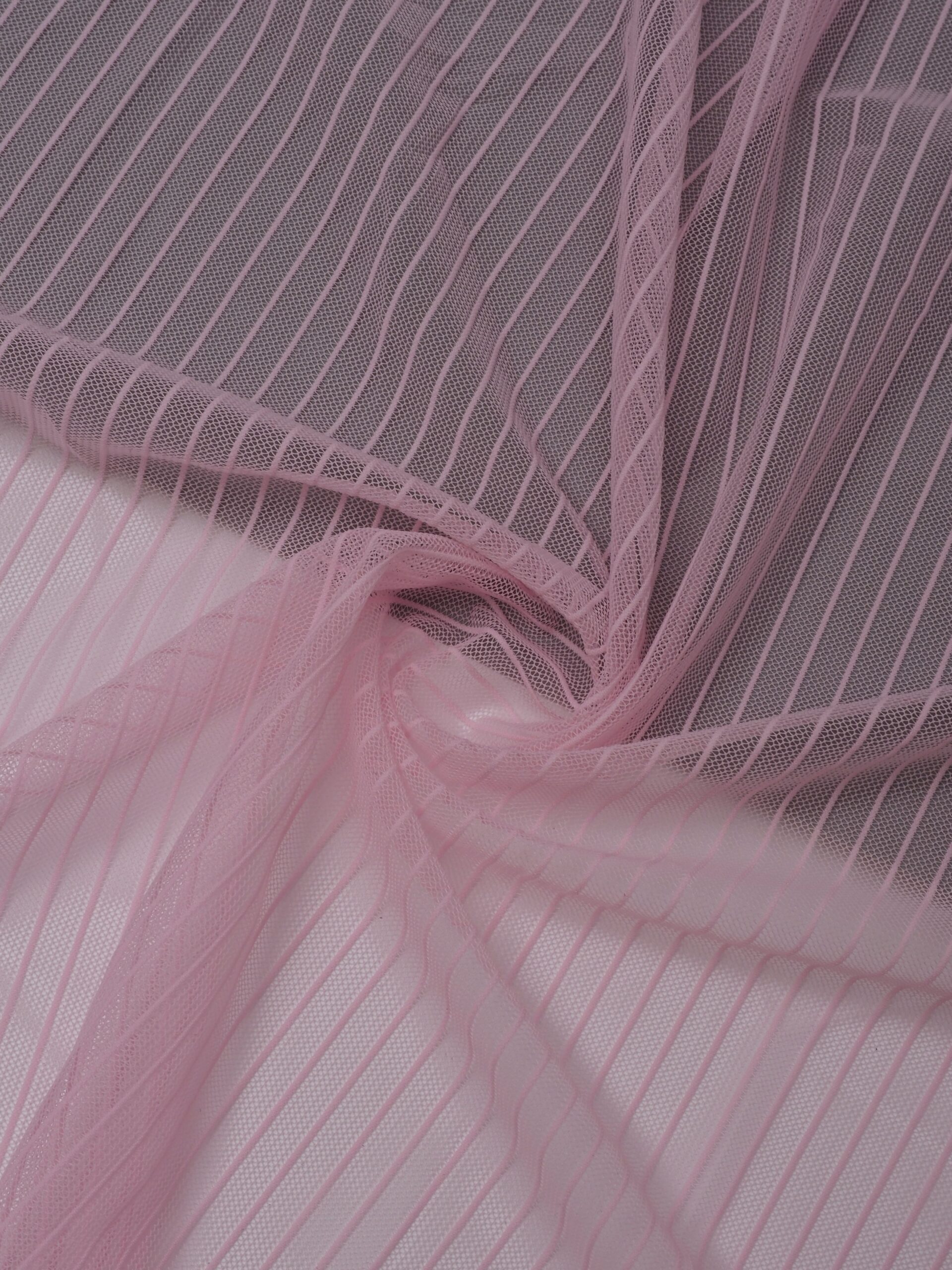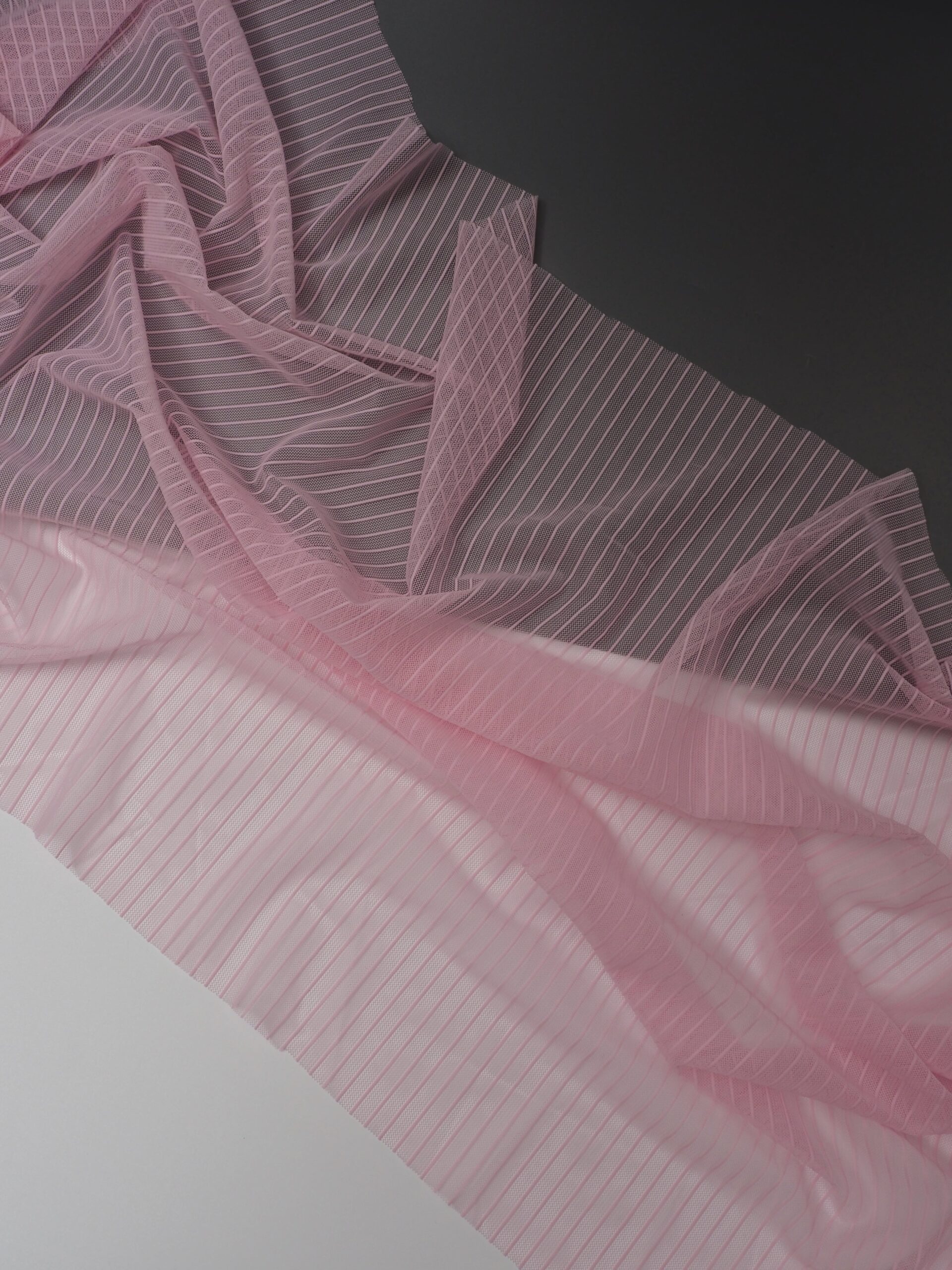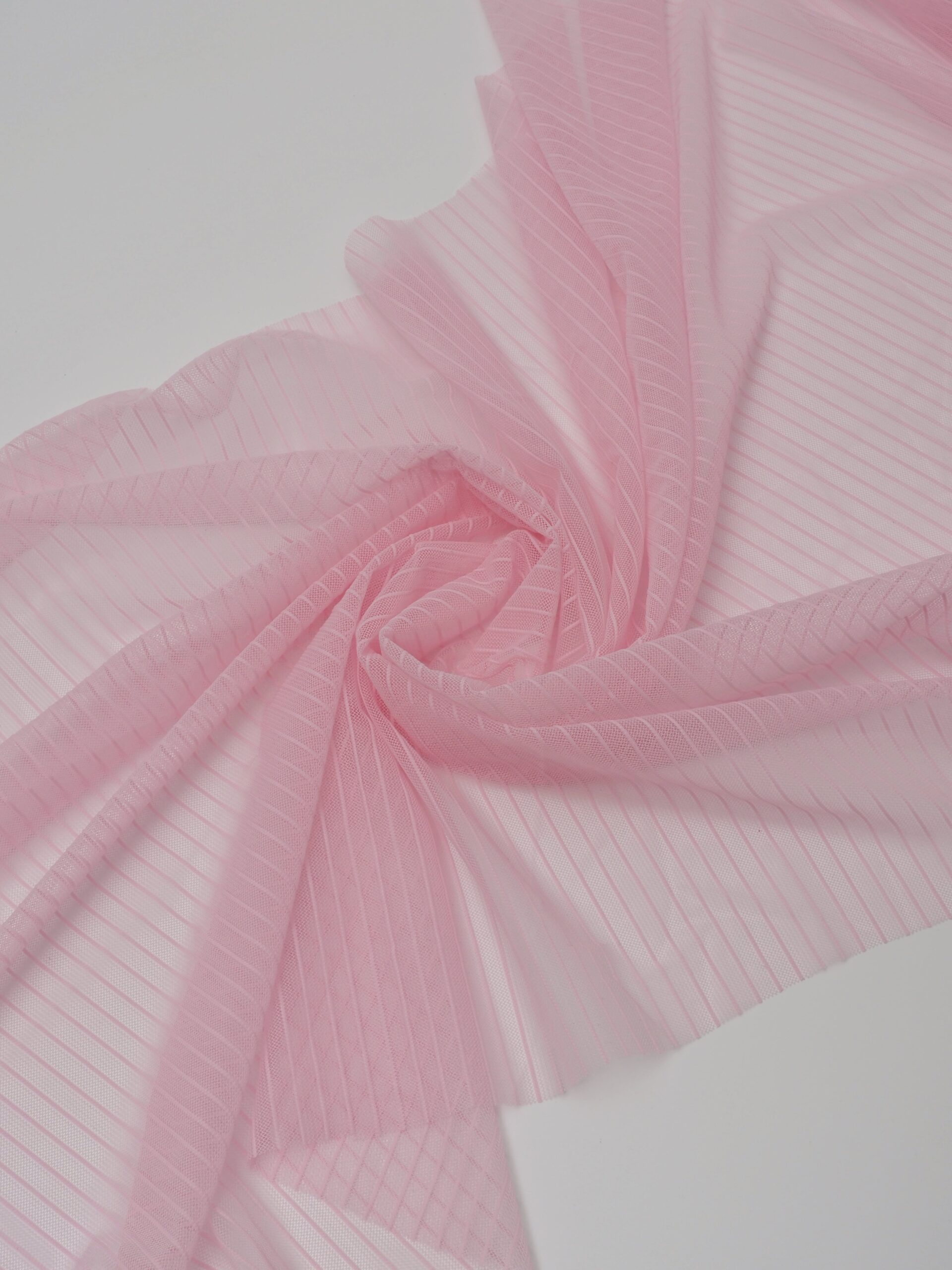 Эластичная сетка нежно-розовая в полоску великолепно держит форму, хорошо тянется в обе стороны, не осыпается по краям, служит в течение многих лет. Стрейч сетка универсальный материал. Её можно использовать для пошива нижнего белья, платьев, костюмов, купальников (для вставок и подклада).