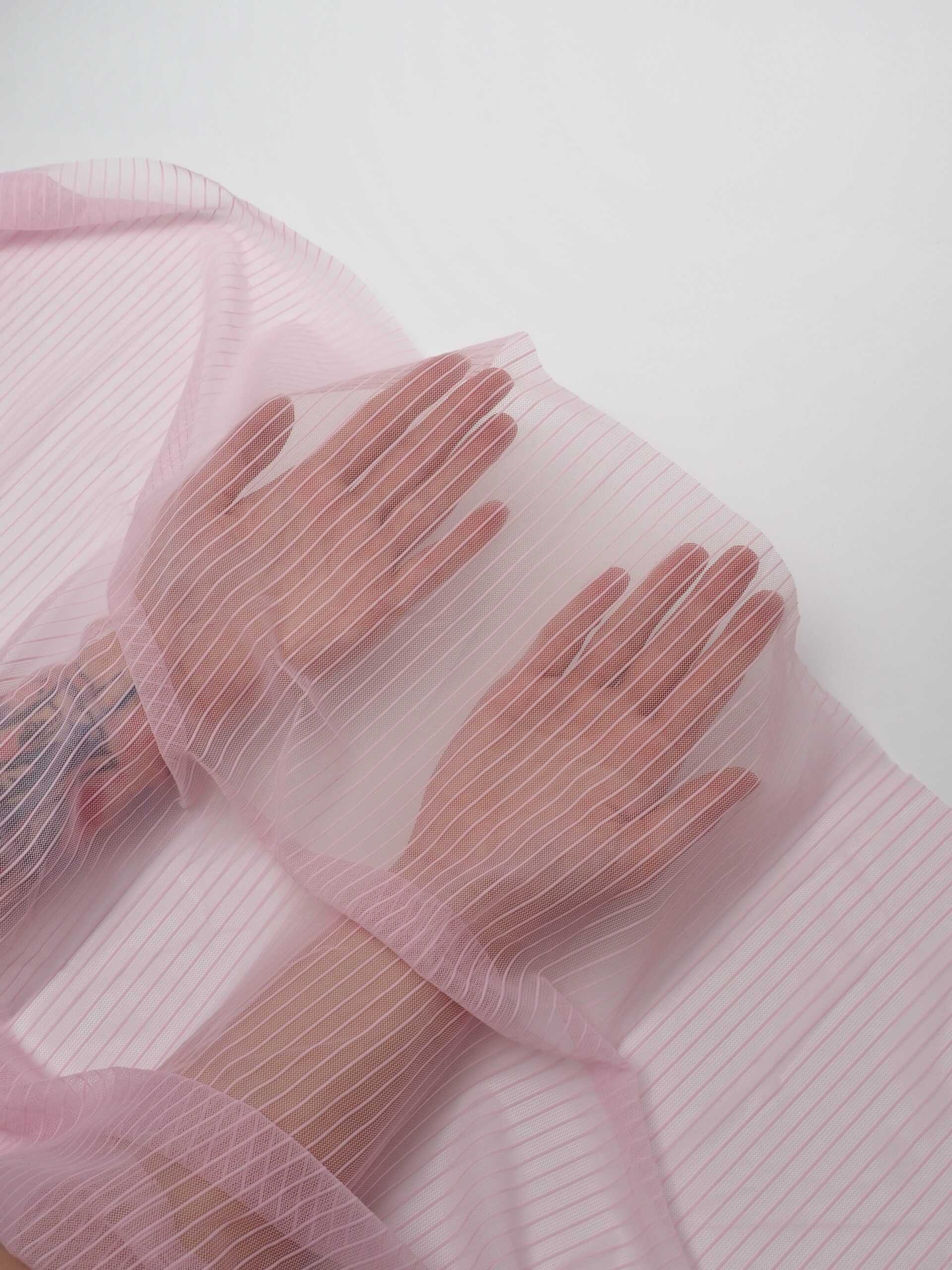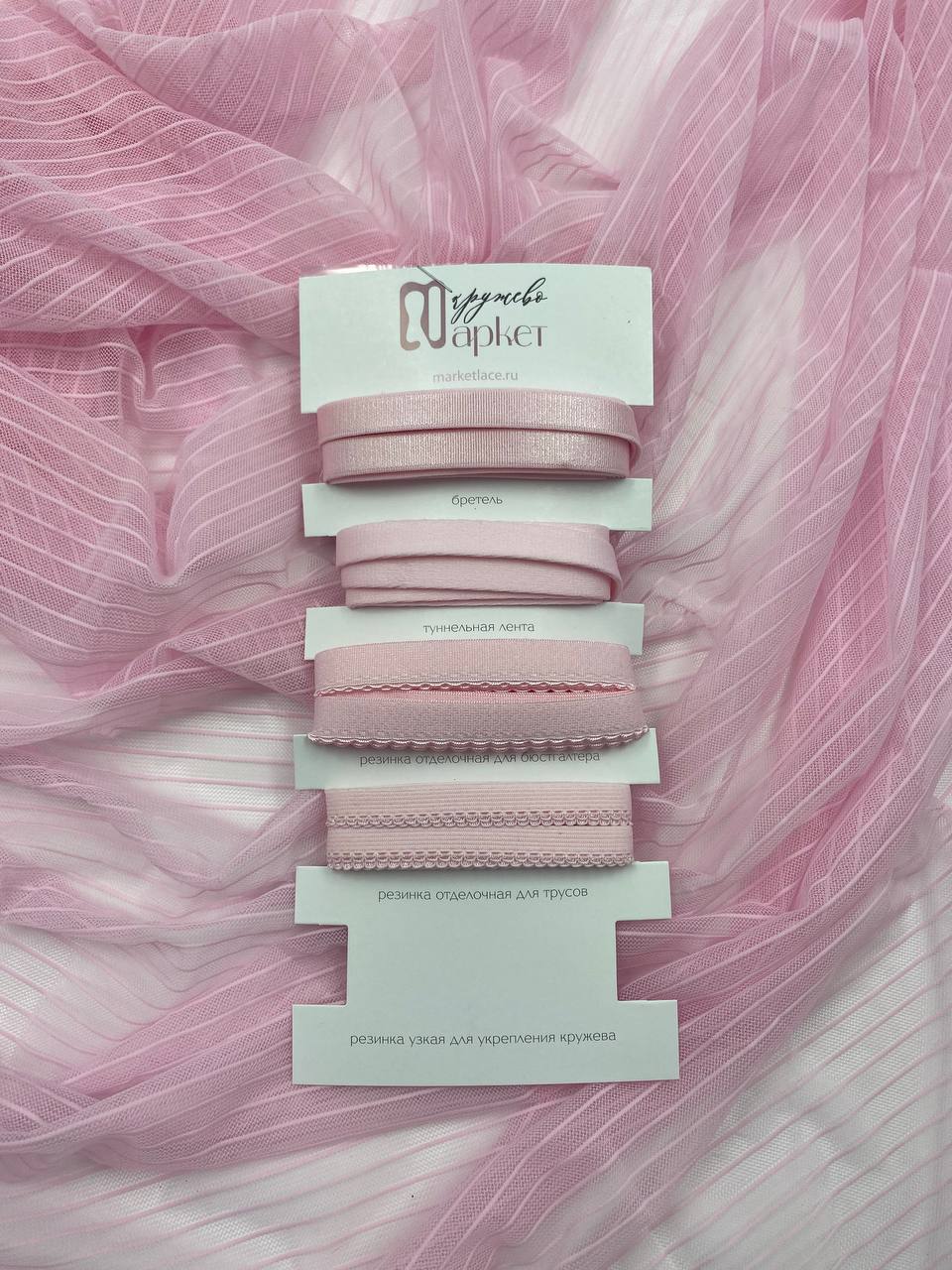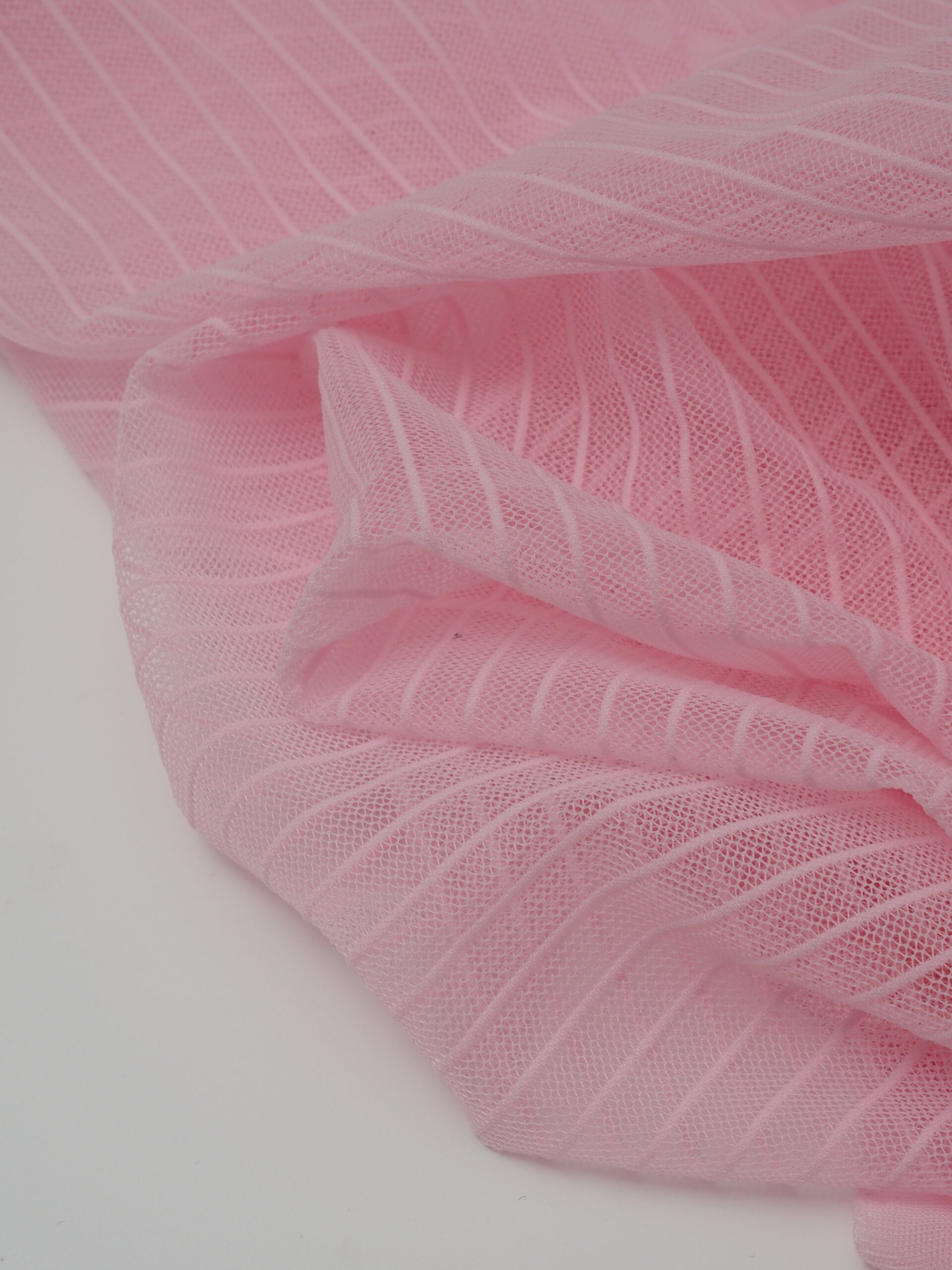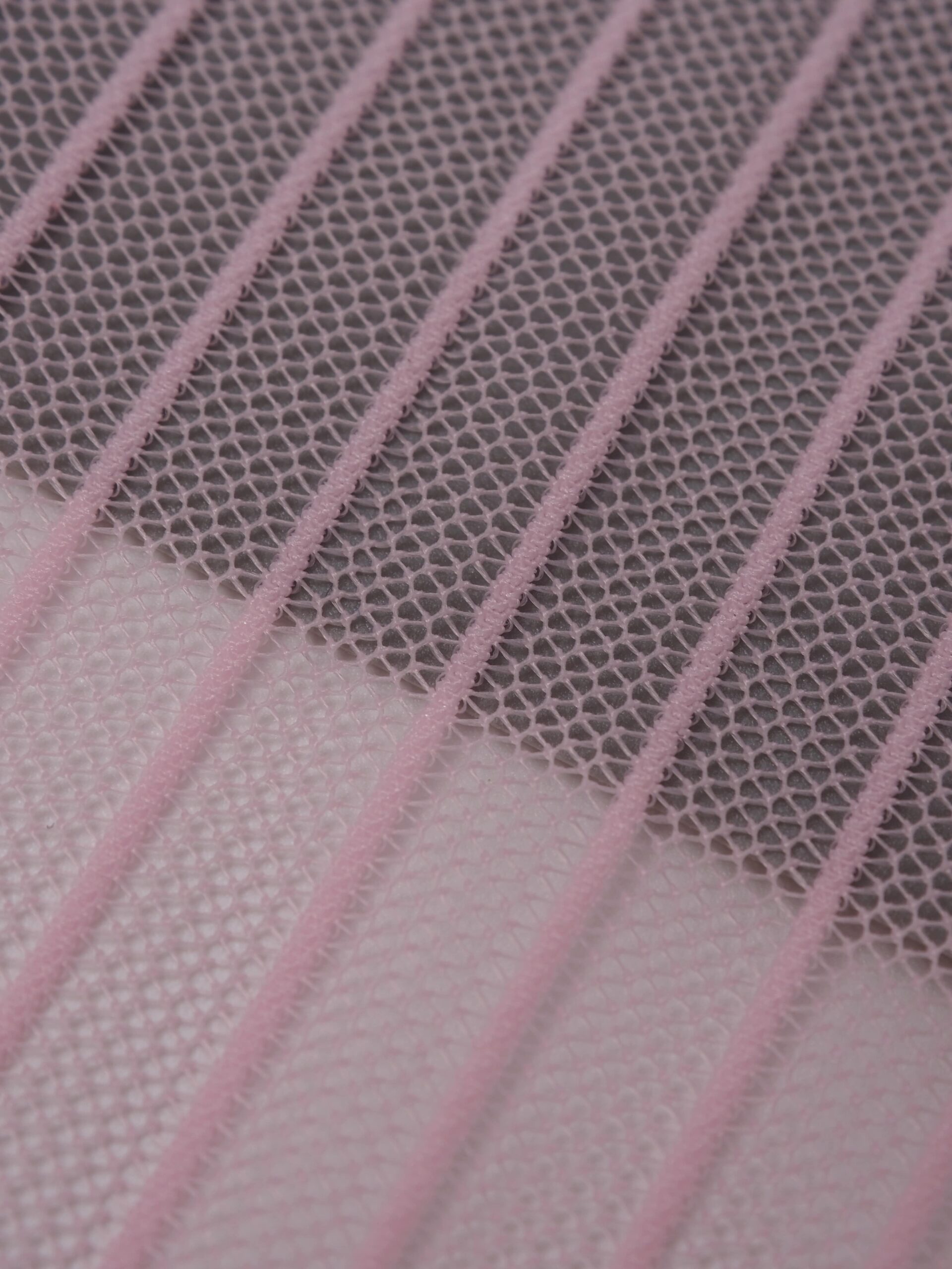 Эластичная сетка нежно-розовая в полоску великолепно держит форму, хорошо тянется в обе стороны, не осыпается по краям, служит в течение многих лет. Стрейч сетка универсальный материал. Её можно использовать для пошива нижнего белья, платьев, костюмов, купальников (для вставок и подклада).