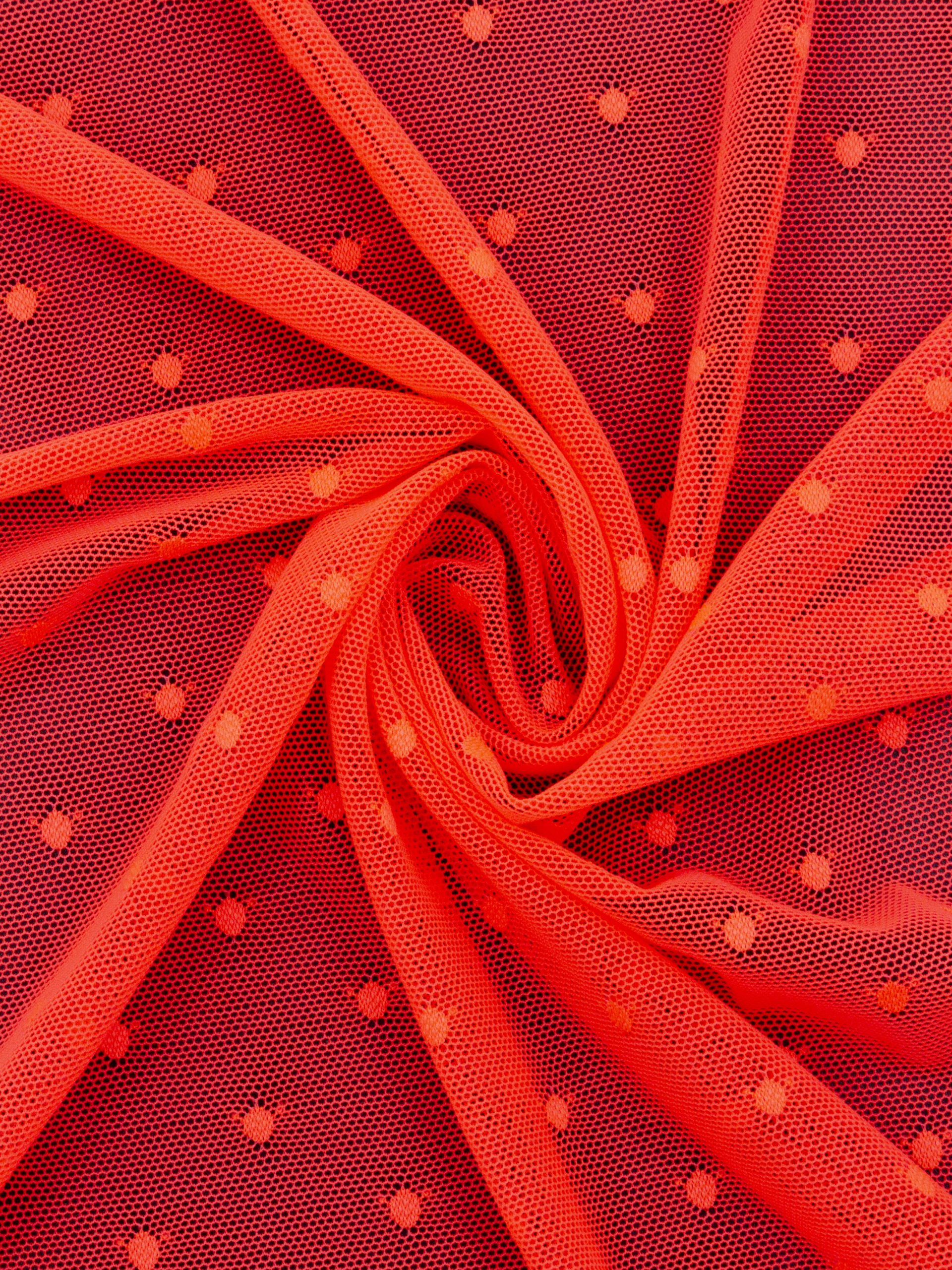 Сетка эластичная оранжевая неоновая - великолепно держит форму, хорошо тянется в обе стороны, не осыпается по краям, служит в течение многих лет. Стрейч сетка универсальный материал. Её можно использовать для пошива нижнего белья, платьев, костюмов, купальников (для вставок и подклада).
