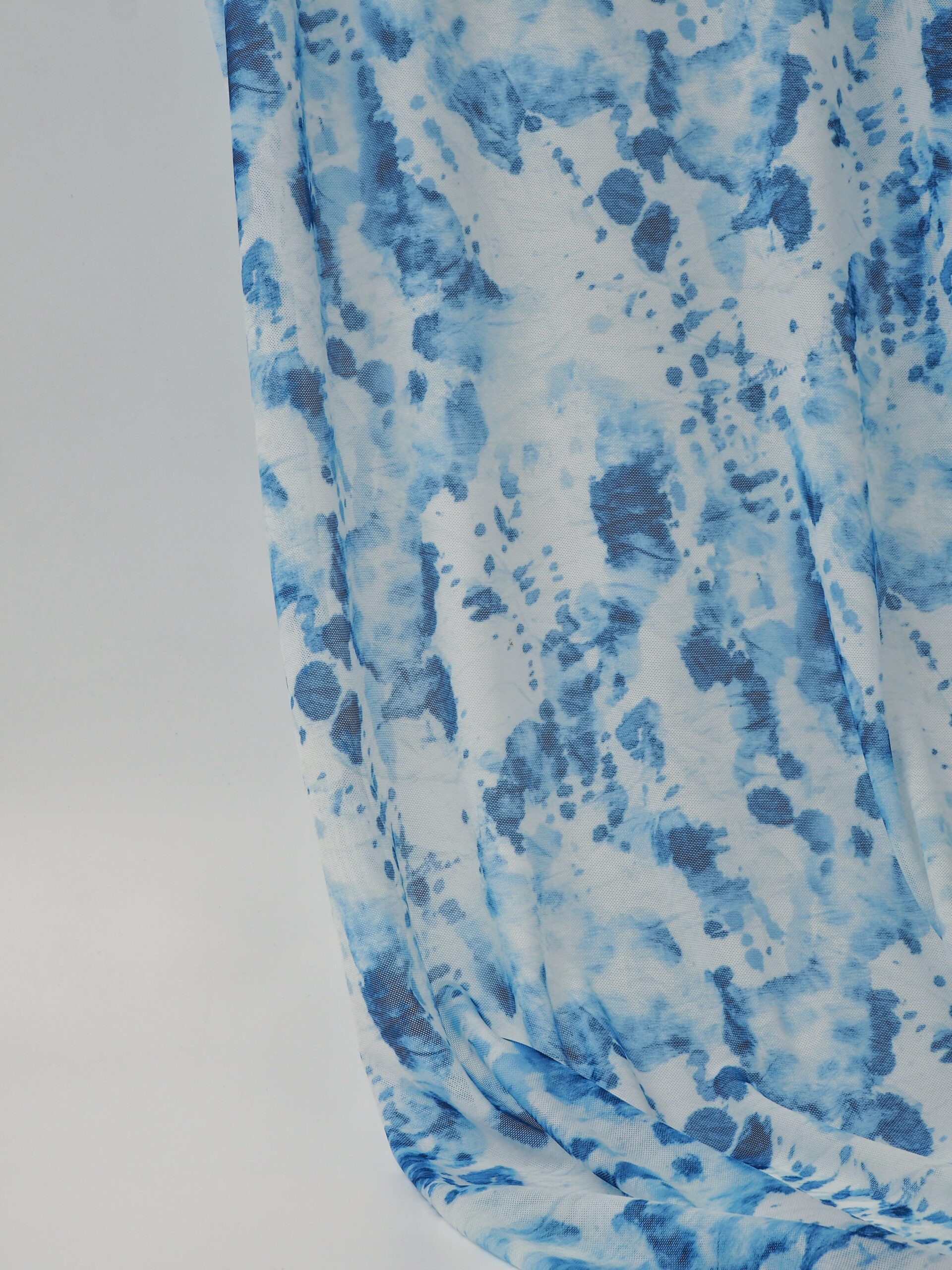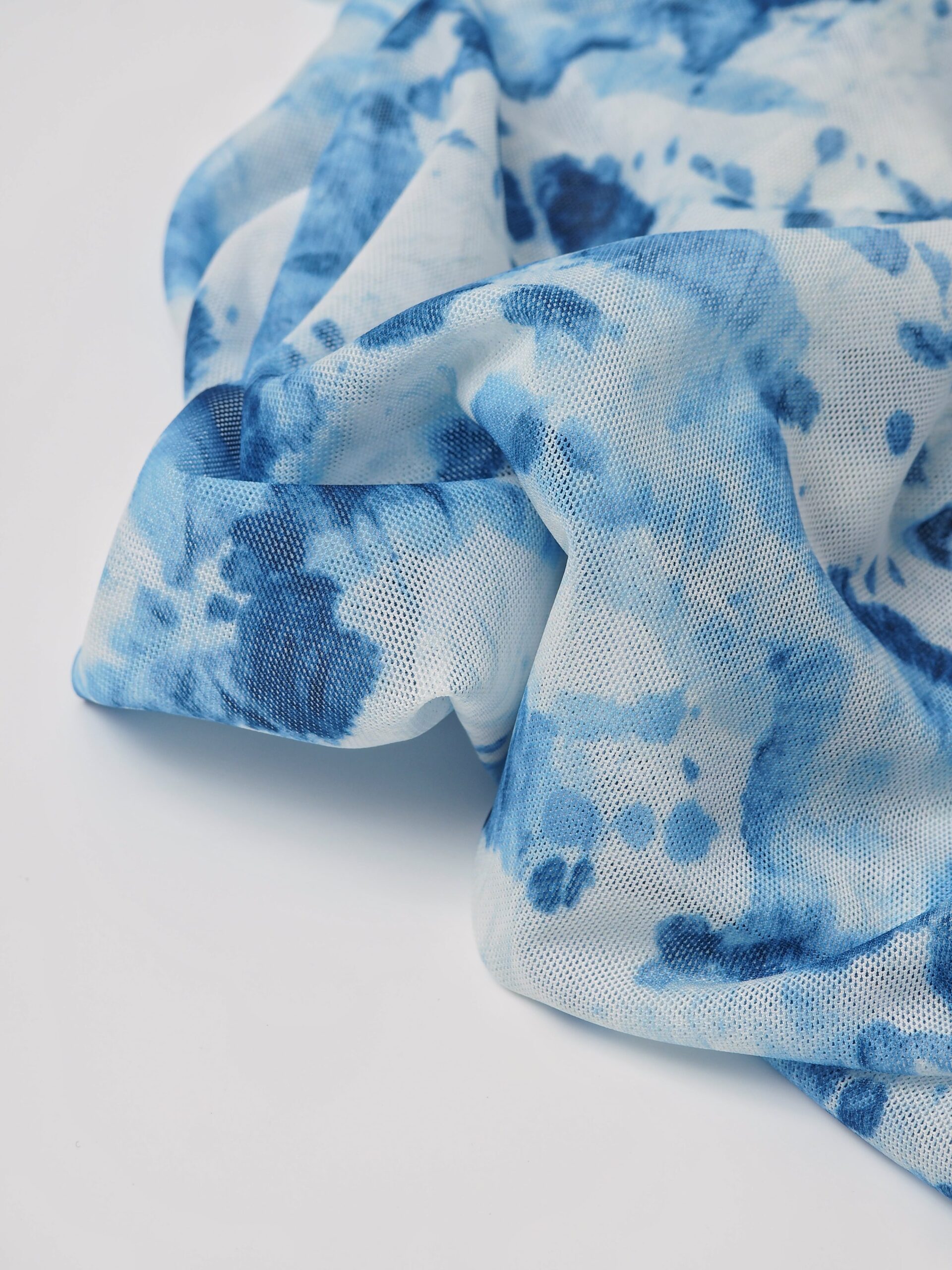 Эластичная сетка принт тай дай молочная с голубым великолепно держит форму, хорошо тянется в обе стороны, не осыпается по краям, служит в течение многих лет. Стрейч сетка универсальный материал. Её можно использовать для пошива нижнего белья, платьев, костюмов, купальников (для вставок и подклада).