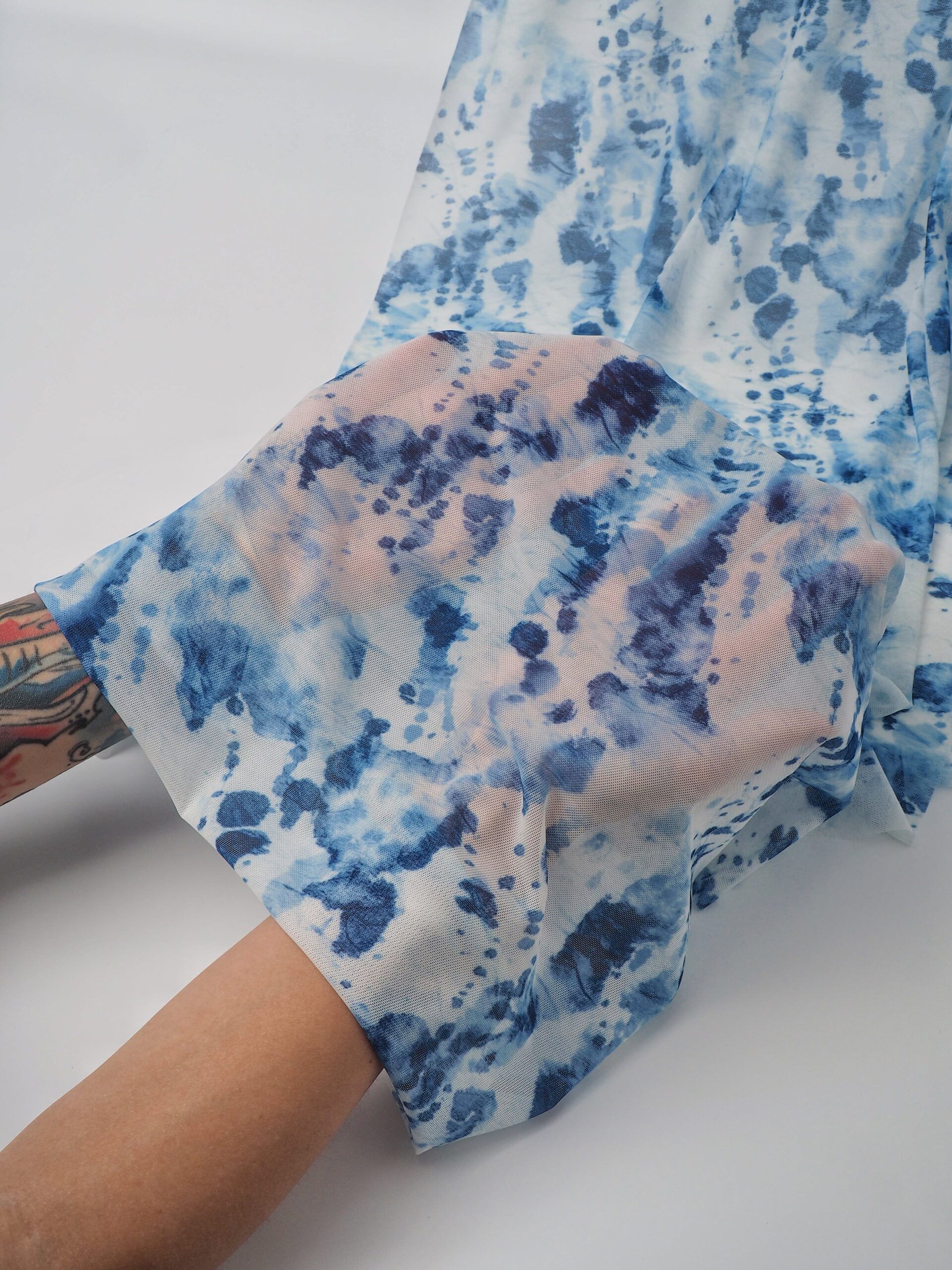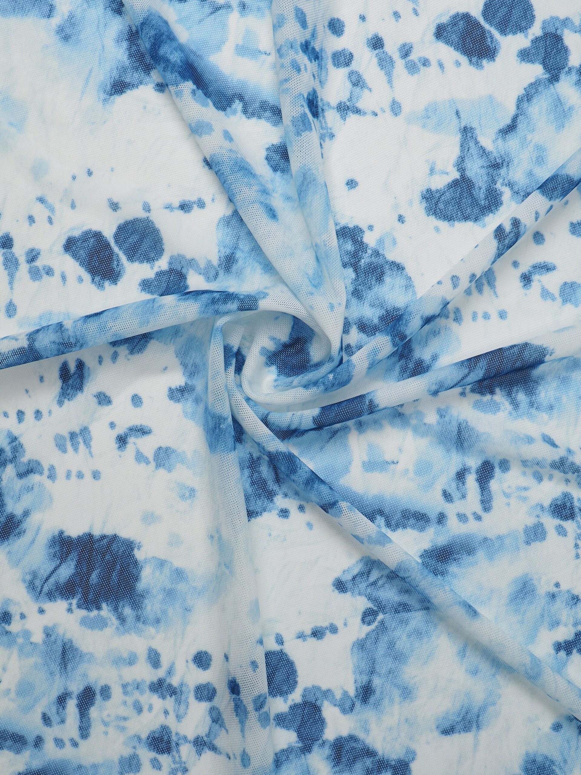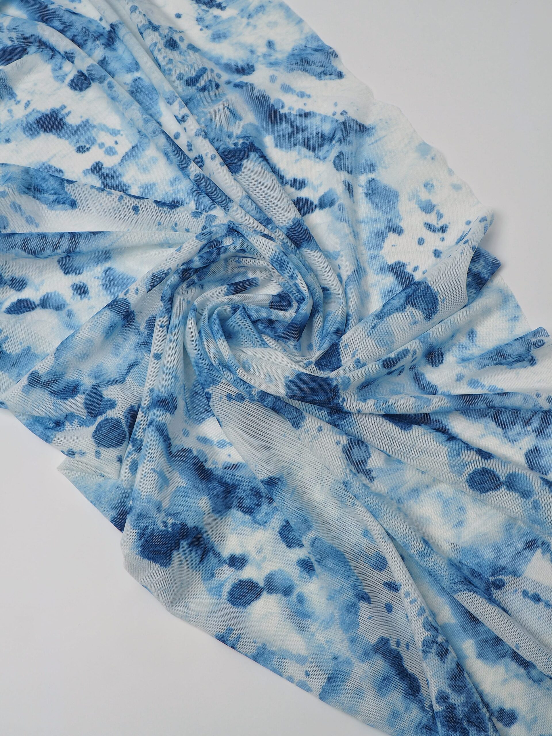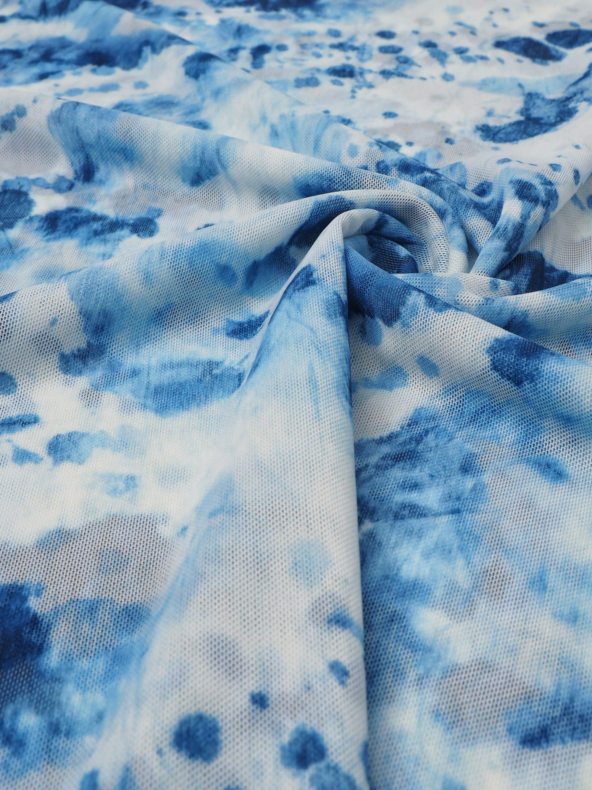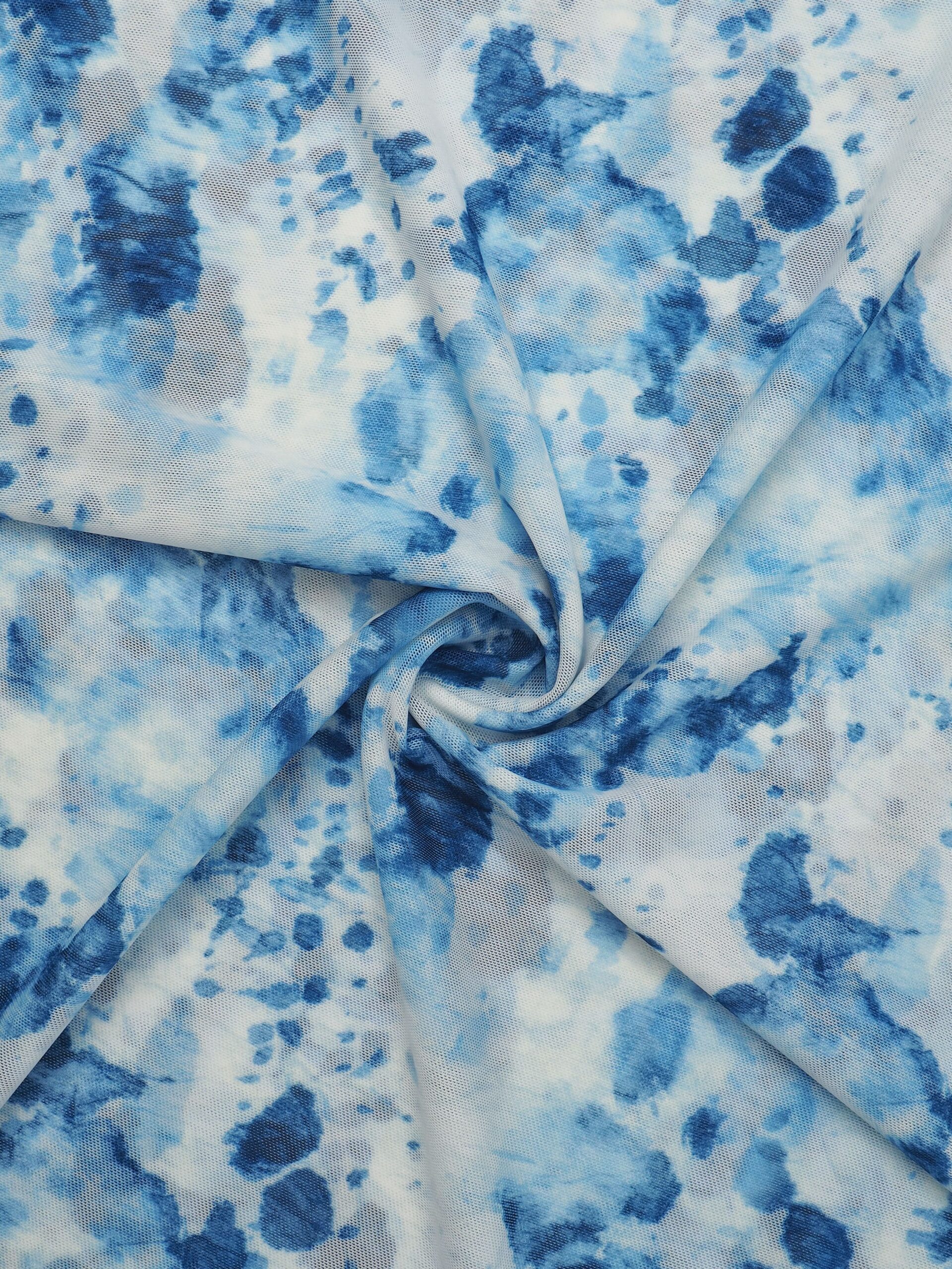 Эластичная сетка принт тай дай молочная с голубым великолепно держит форму, хорошо тянется в обе стороны, не осыпается по краям, служит в течение многих лет. Стрейч сетка универсальный материал. Её можно использовать для пошива нижнего белья, платьев, костюмов, купальников (для вставок и подклада).