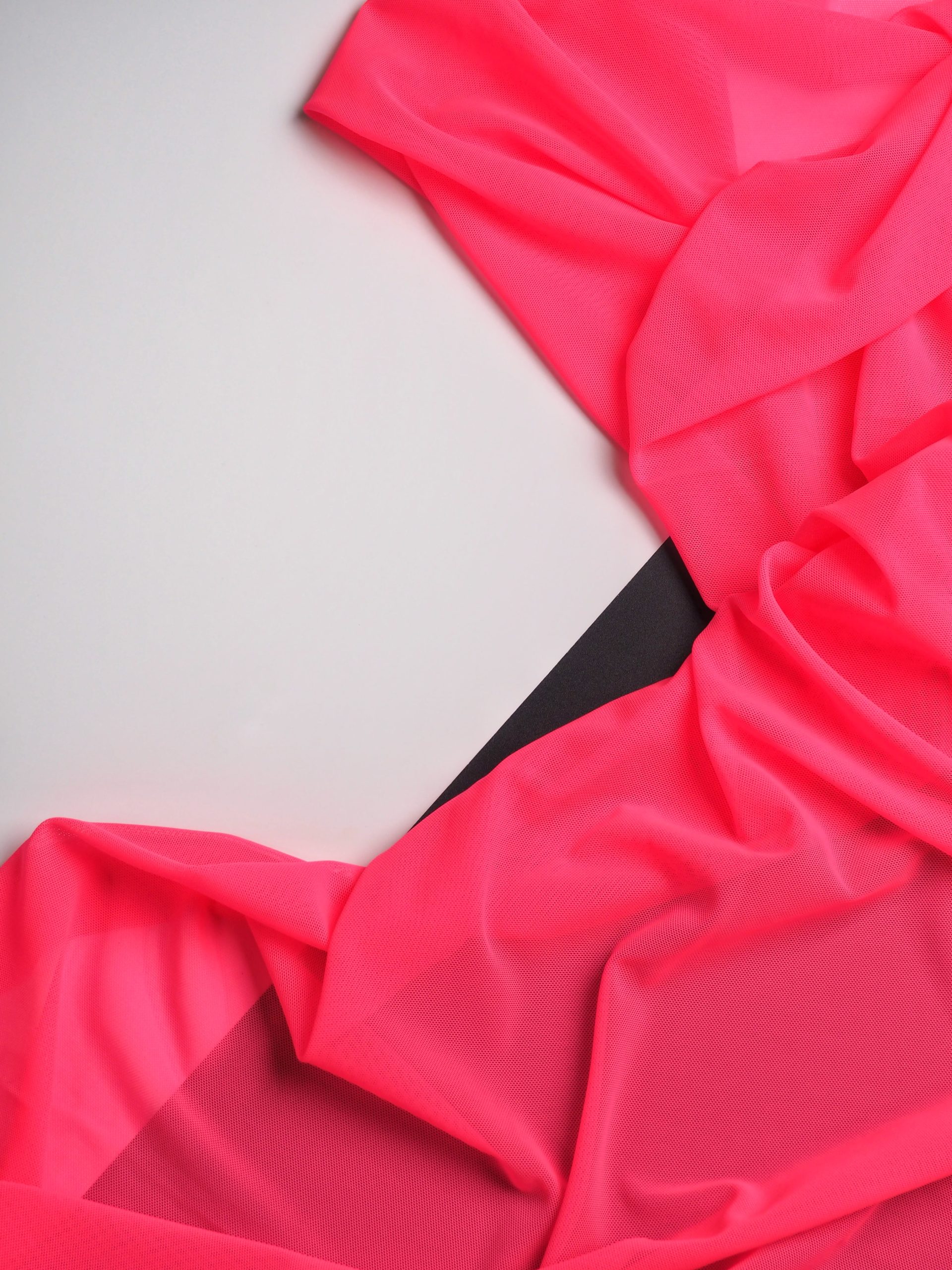 Эластичная сетка розово-красная неоновая великолепно держит форму, хорошо тянется в обе стороны, не осыпается по краям, служит в течение многих лет. Стрейч сетка универсальный материал. Её можно использовать для пошива нижнего белья, платьев, костюмов, купальников (для вставок и подклада).
