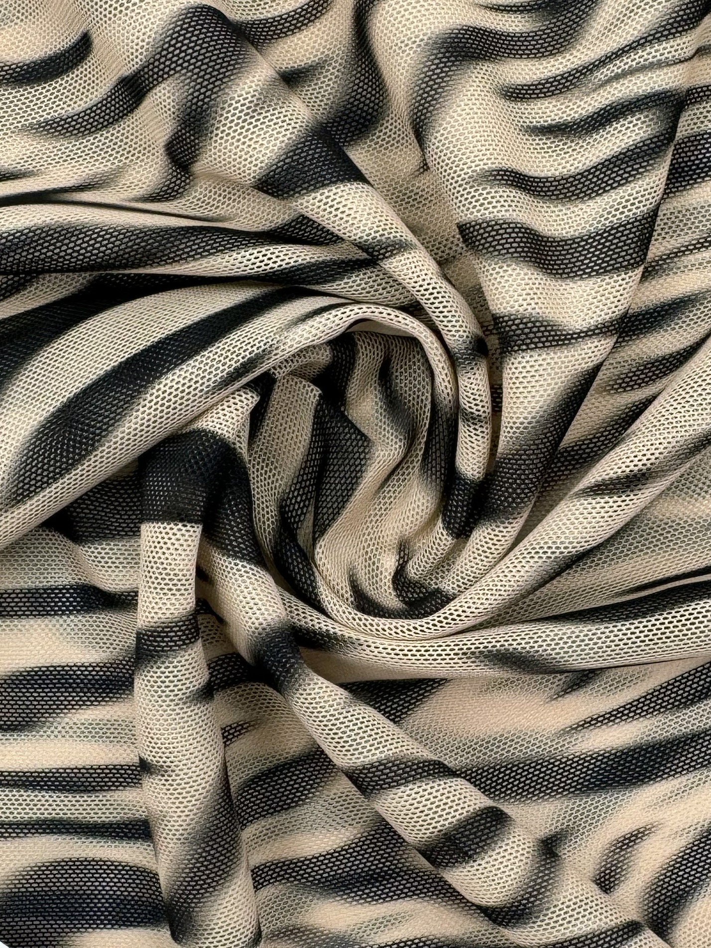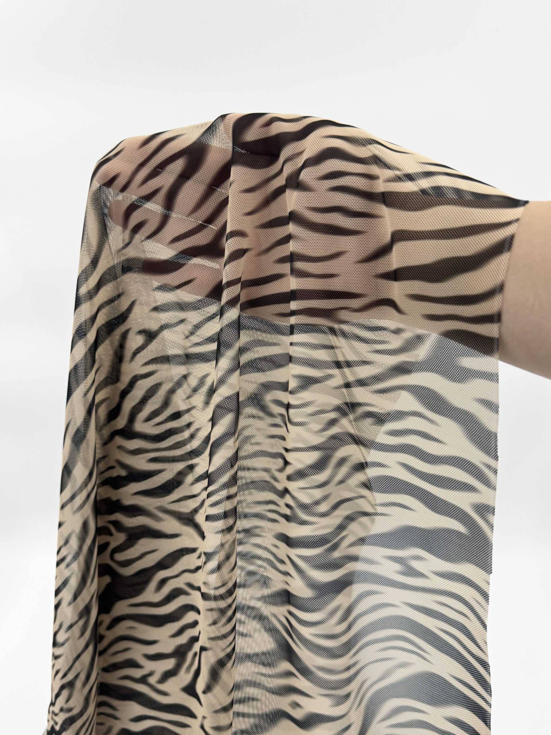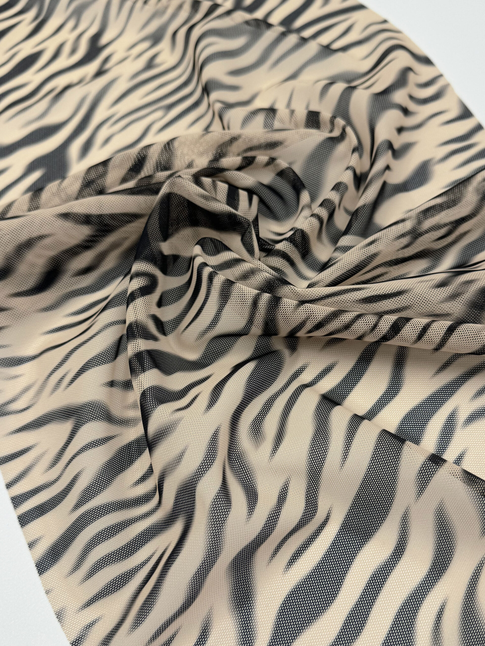 Эластичная сетка стрейч черного и бежевого оттенка бельевая мелкая ячейка с тигровым принтом. Отрез 70 см на 50 см.