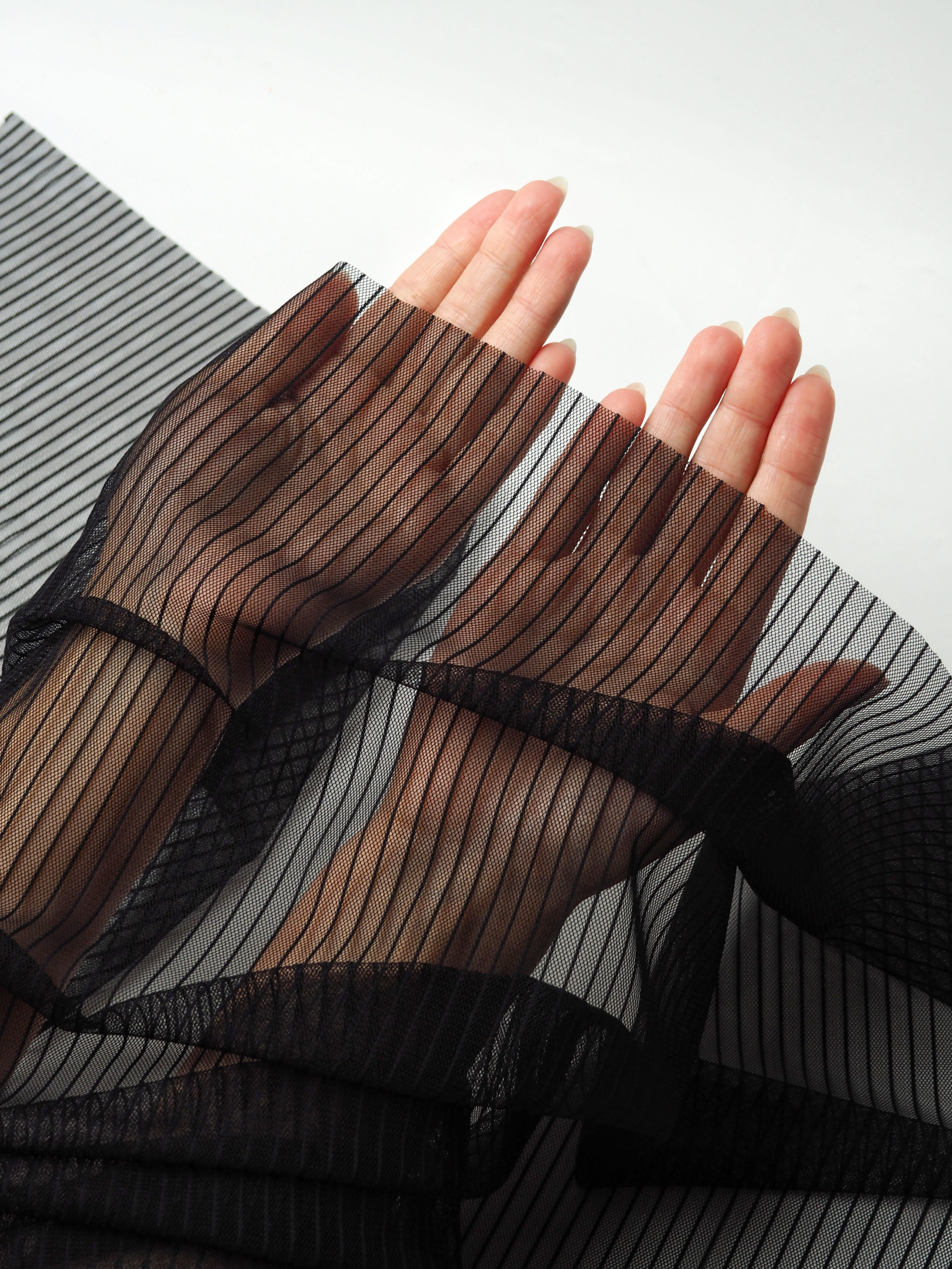 Сетка в полоску черная малоэластичная великолепно держит форму, слабо тянется в обе стороны, не осыпается по краям, служит в течение многих лет. Сетка универсальный материал. Её можно использовать для пошива нижнего белья, платьев, костюмов, купальников (для вставок и подклада).
