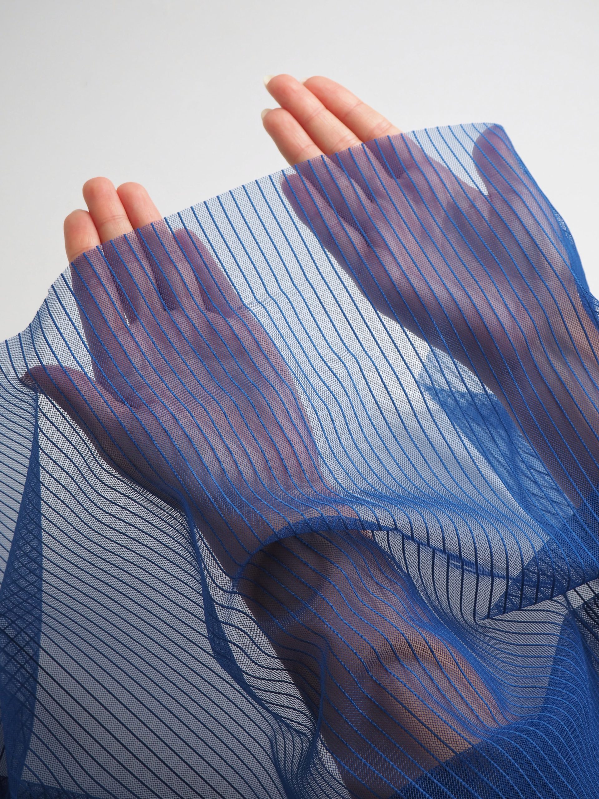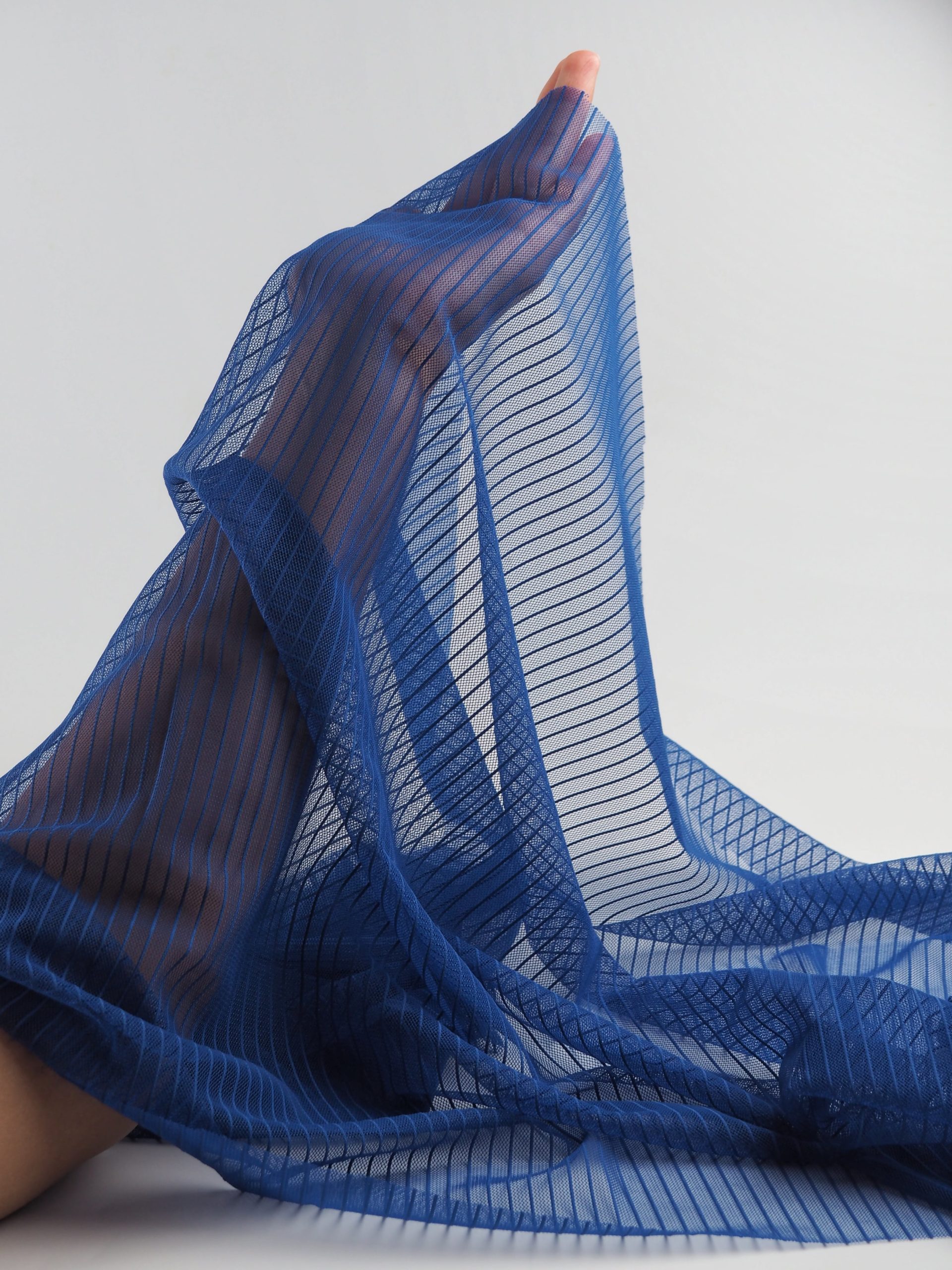 Сетка в полоску ультрамарин великолепно держит форму, слабо тянется в обе стороны, не осыпается по краям, служит в течение многих лет. Сетка универсальный материал. Её можно использовать для пошива нижнего белья, платьев, костюмов, купальников (для вставок и подклада).