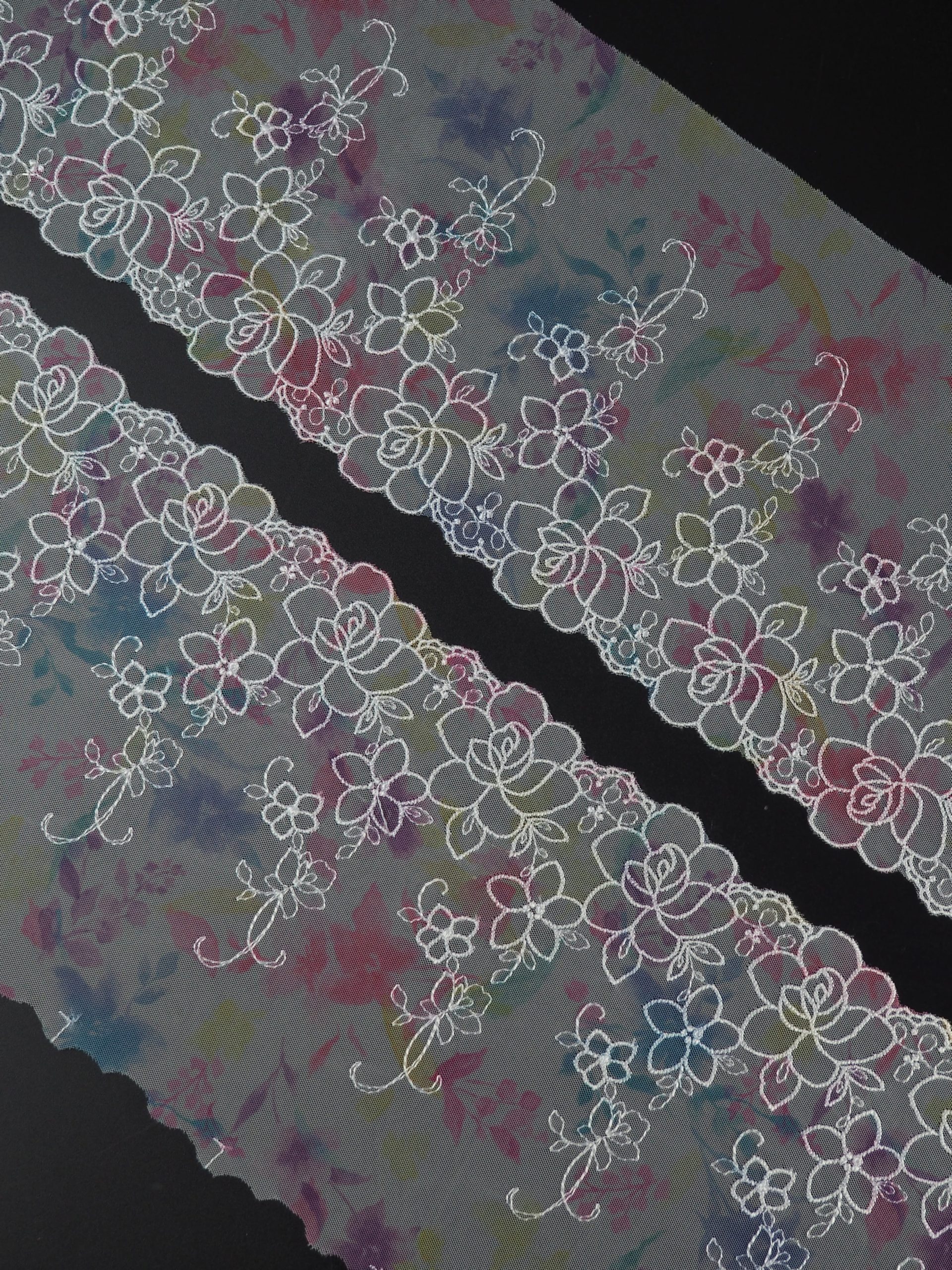 Кружево на сетке неэластичное белое с мультиколор с цветочным рисунком в левую и правую сторону. Вышивка белого цвета на белой сетке с принтом.