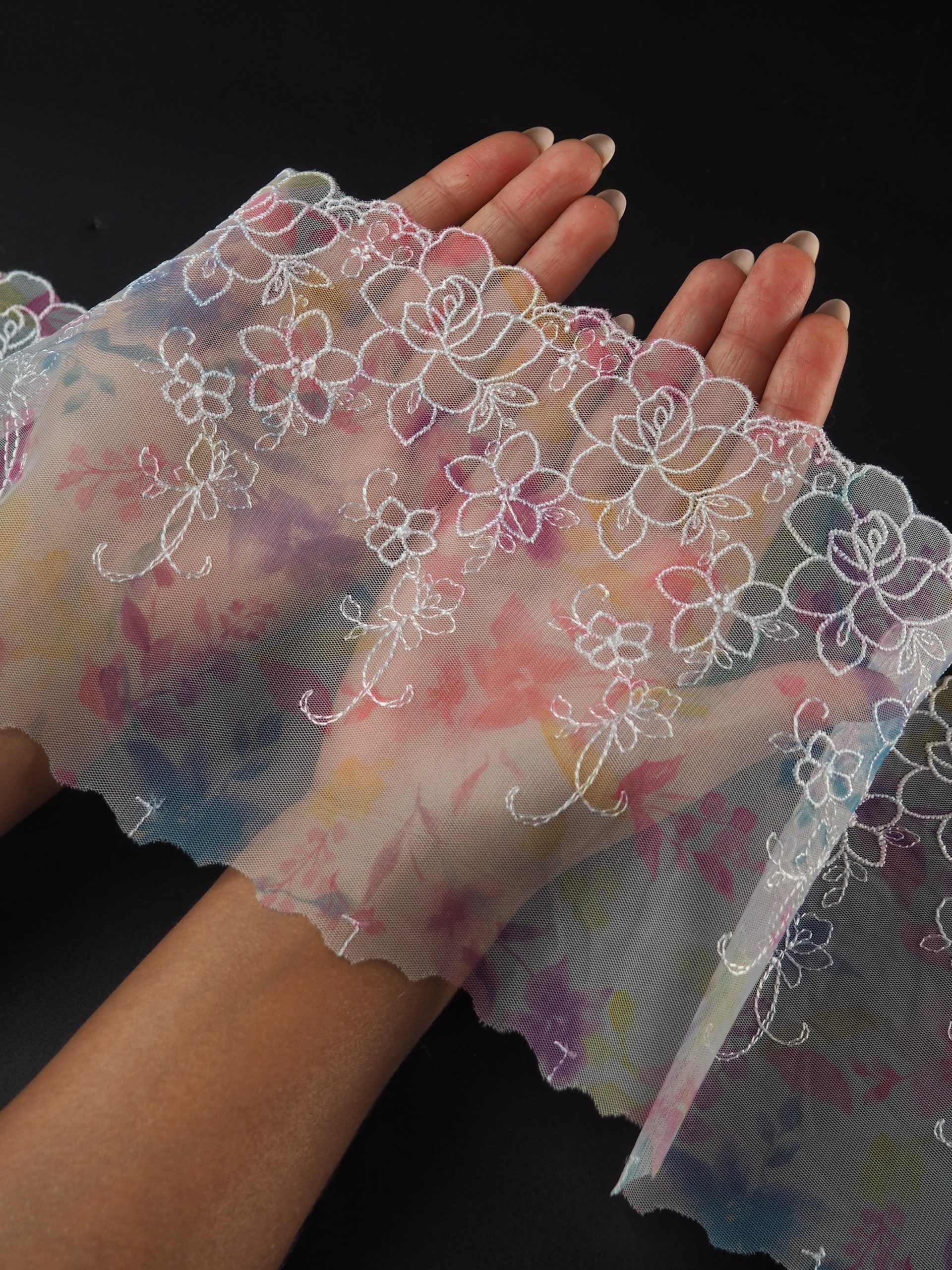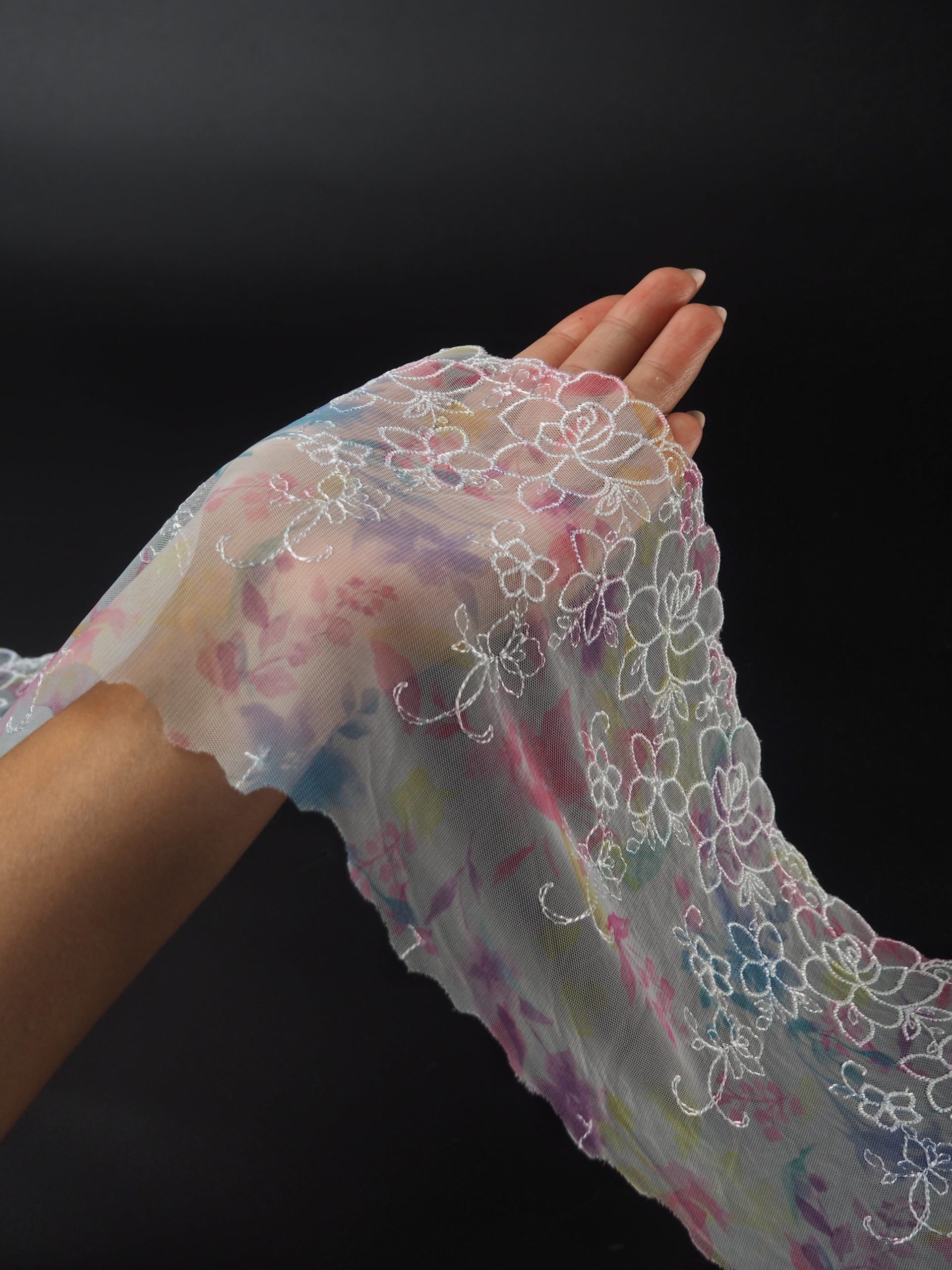 Вышивка на сетке белая с мультиколор - удобная и красивая ткань для создания оригинального декора. Готовая основа с кружевными узорами и орнаментами - настоящая помощь рукодельницам. Вышивка на сетке великолепно держит форму, не осыпается по краям, отлично драпируется, отличается высокой прочностью на разрыв, весит очень мало, служит в течение многих лет. Используя кружево на сетке, вы легко создадите эффектное эксклюзивное изделие. Материал считается универсальным. Его можно использовать в пошиве нижнего белья, кофты, юбки, блузки, вечернего и свадебного платья.