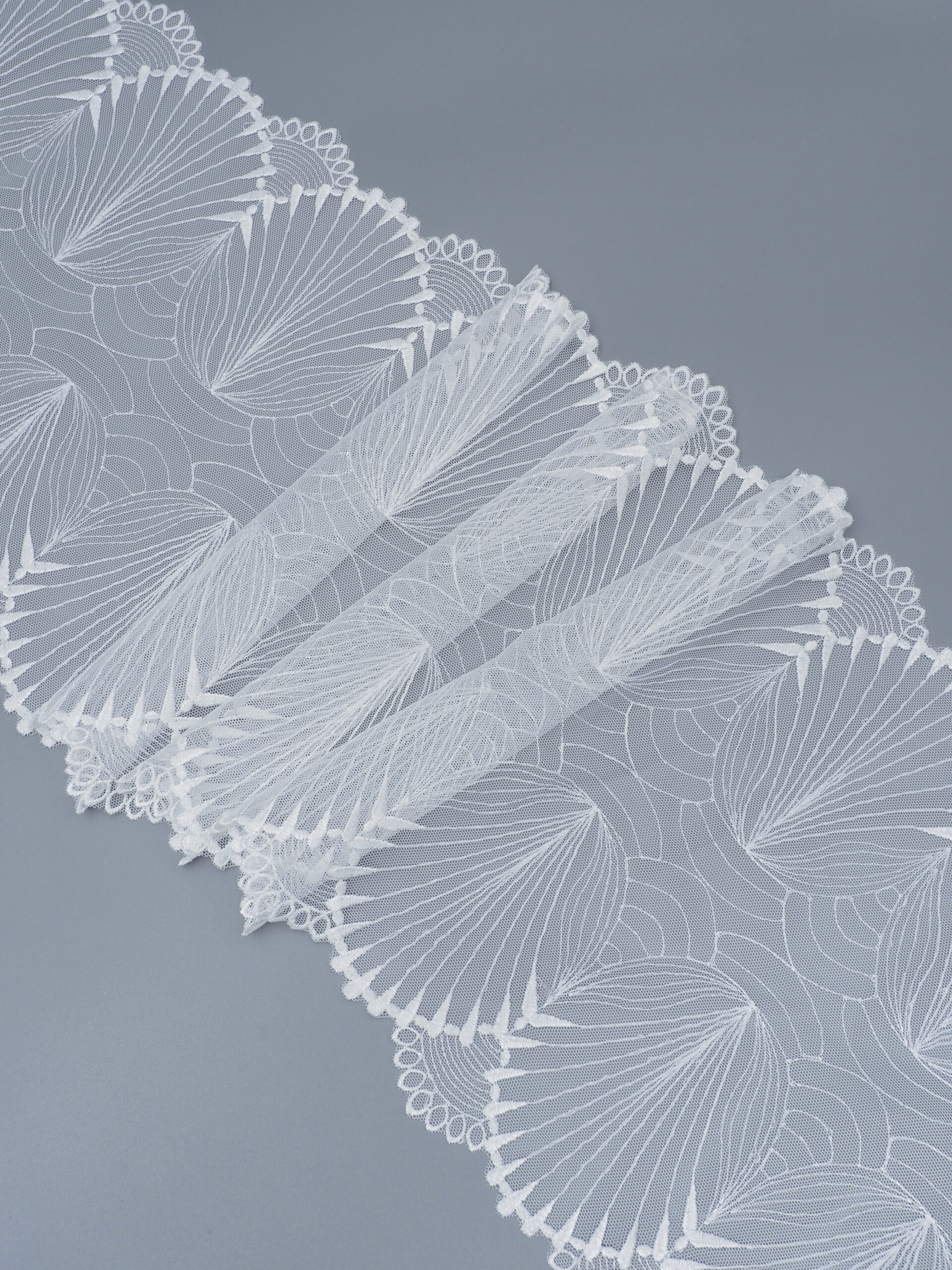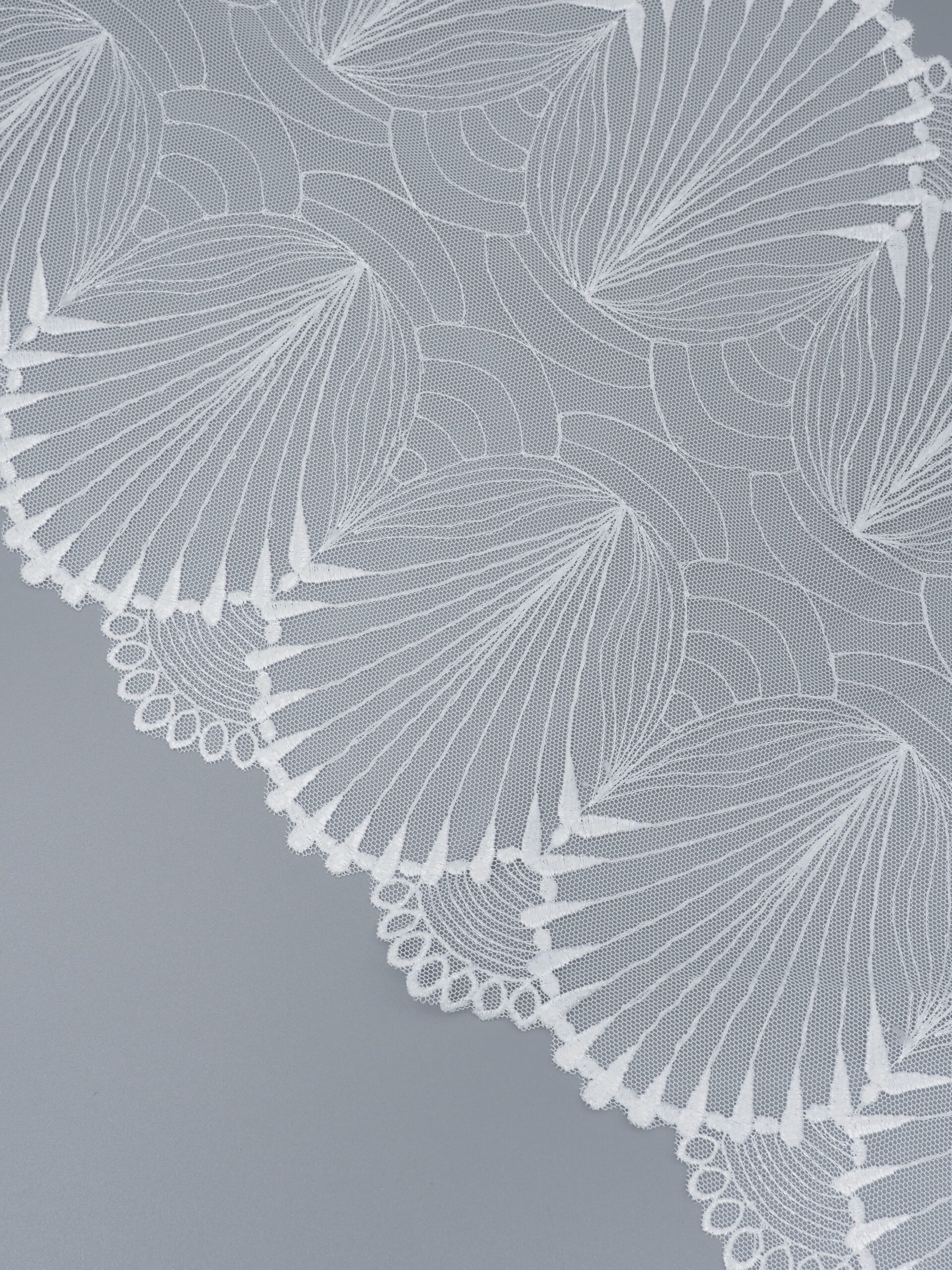 Кружево на сетке неэластичное белого цвета с узорчатой вышивкой. Вышивка на сетке белая.
