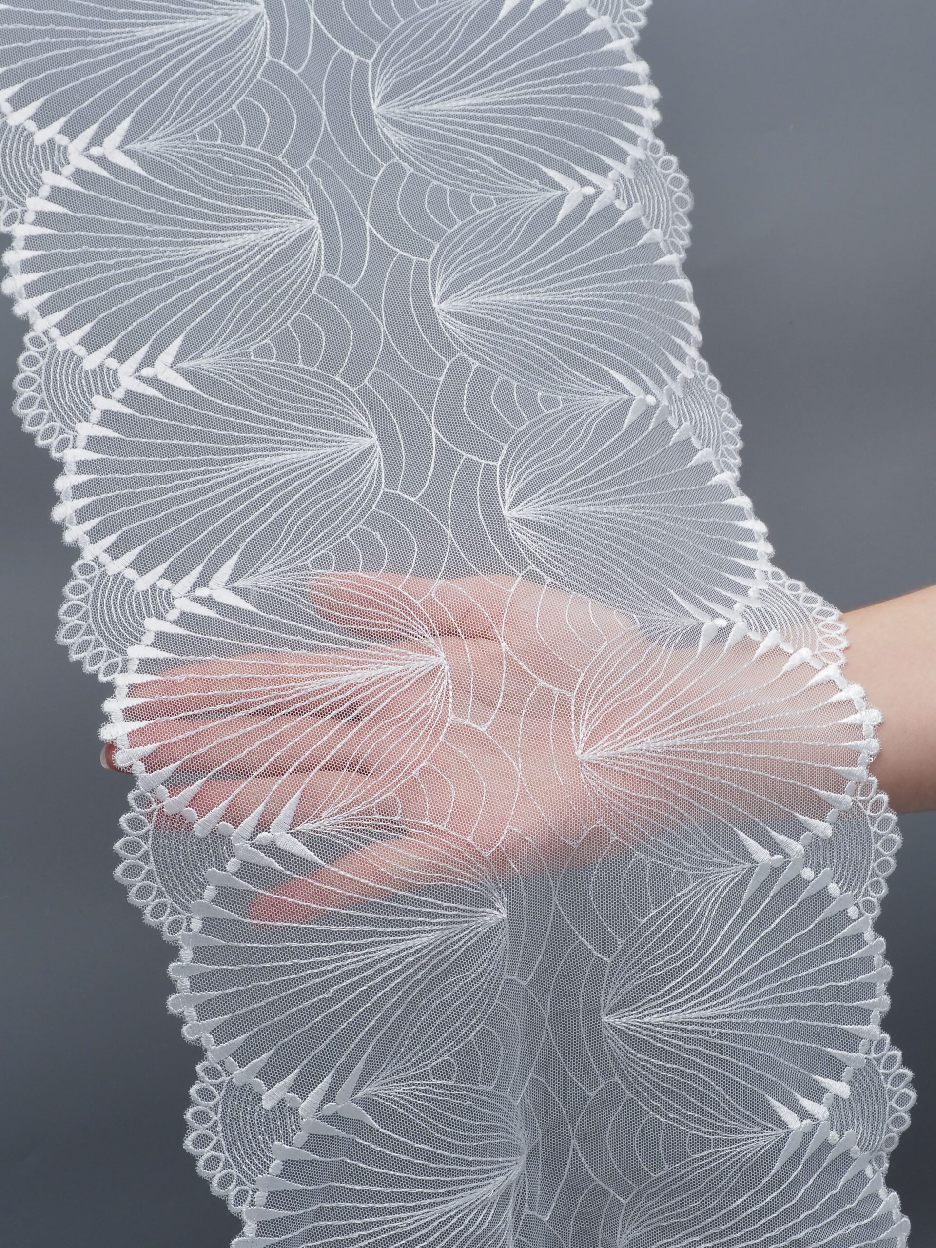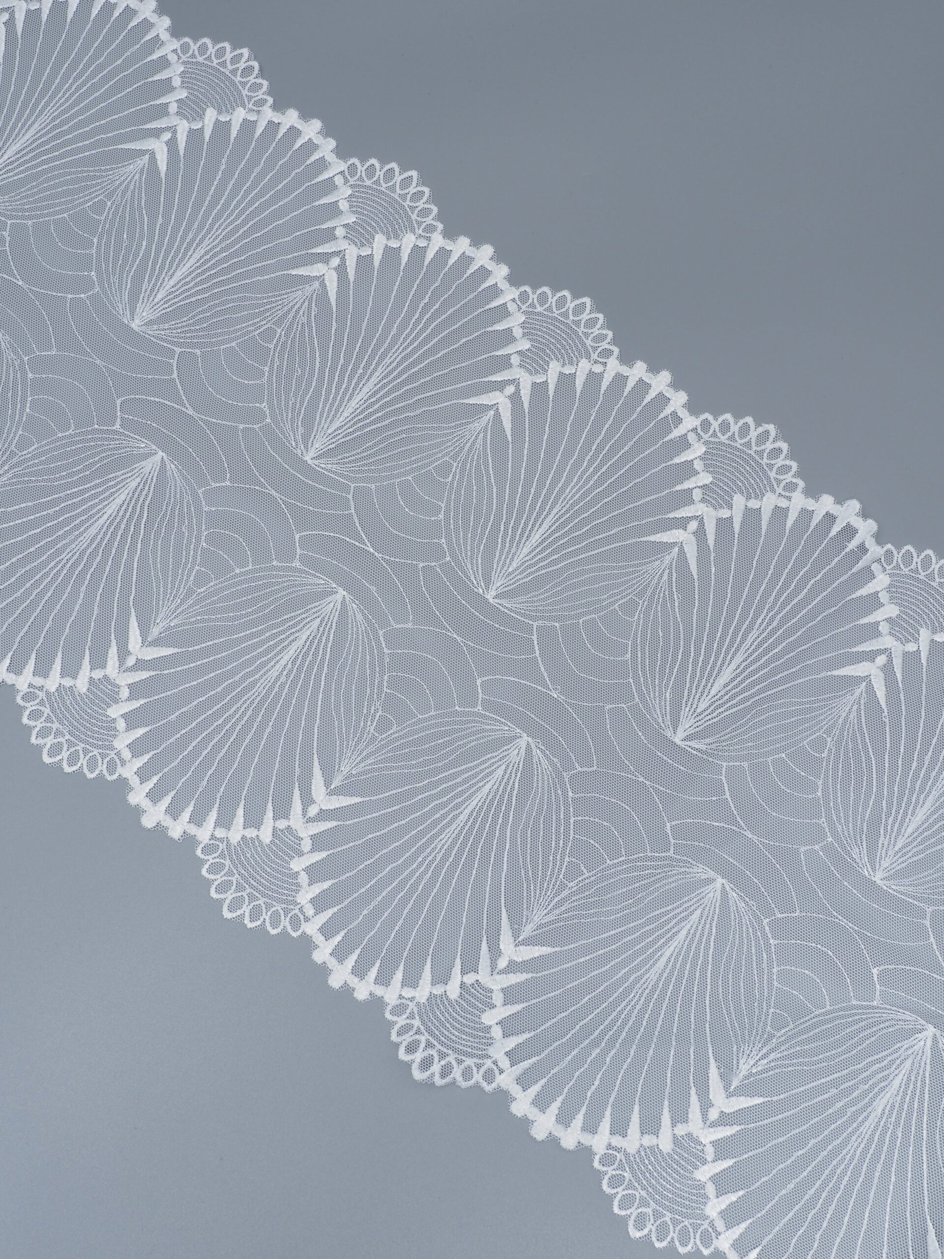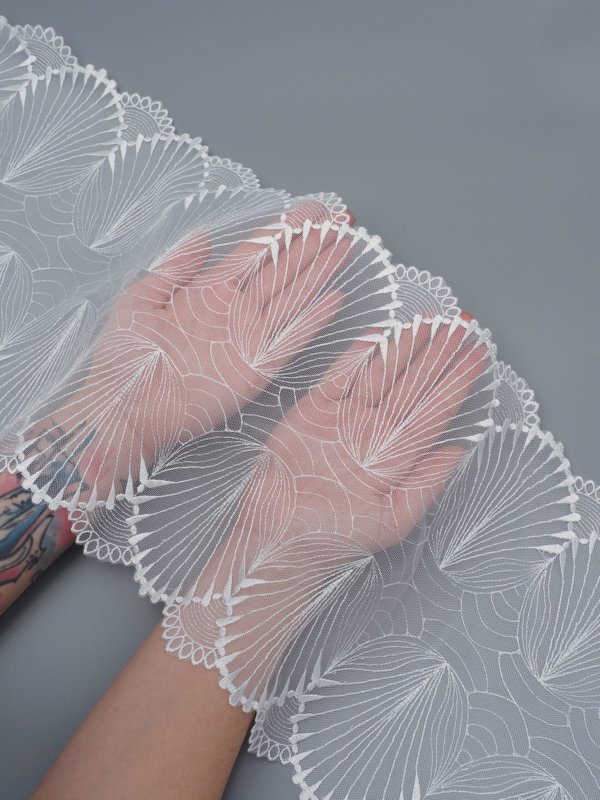 Кружево на сетке неэластичное белого цвета с узорчатой вышивкой. Вышивка на сетке белая.