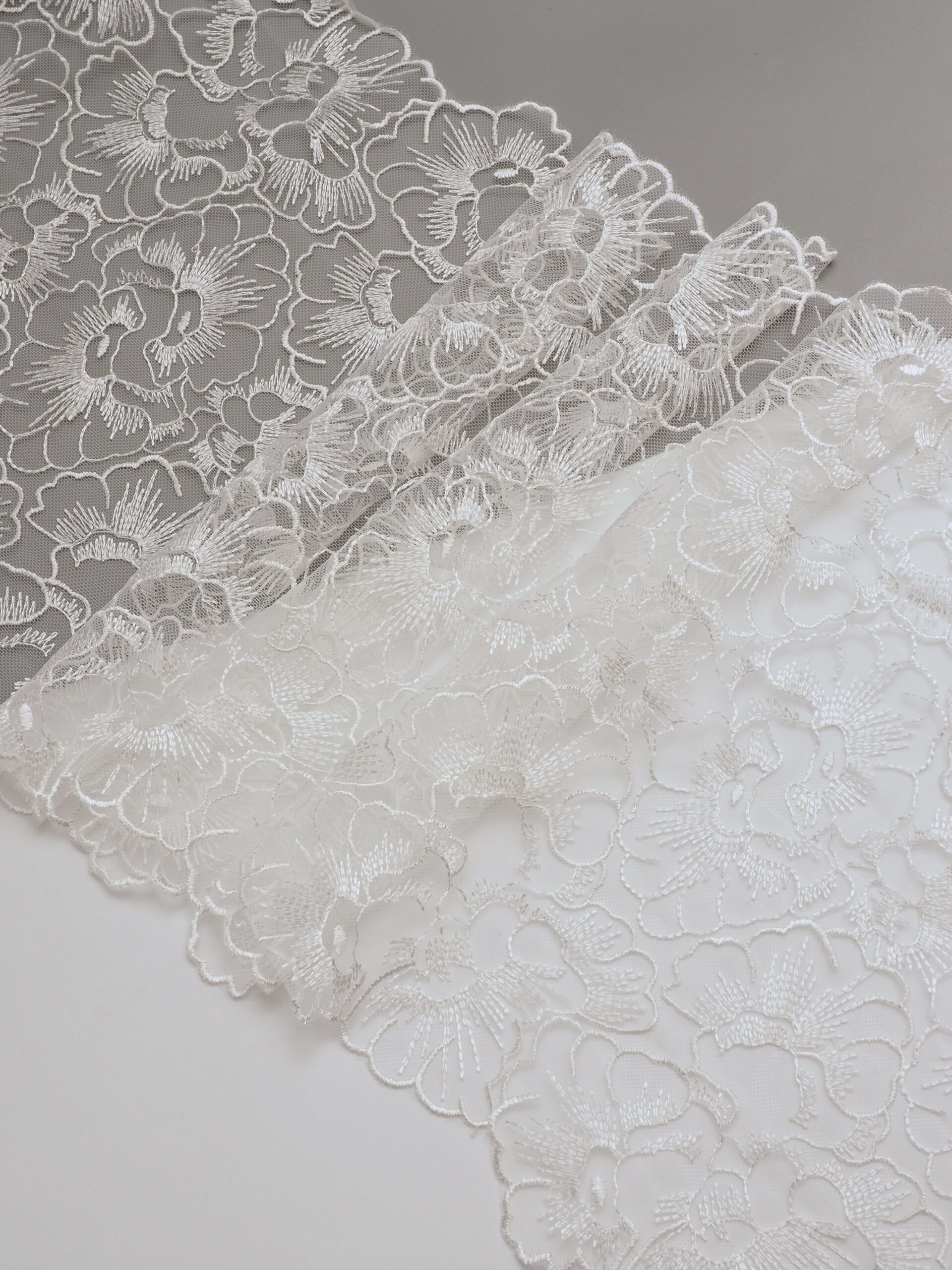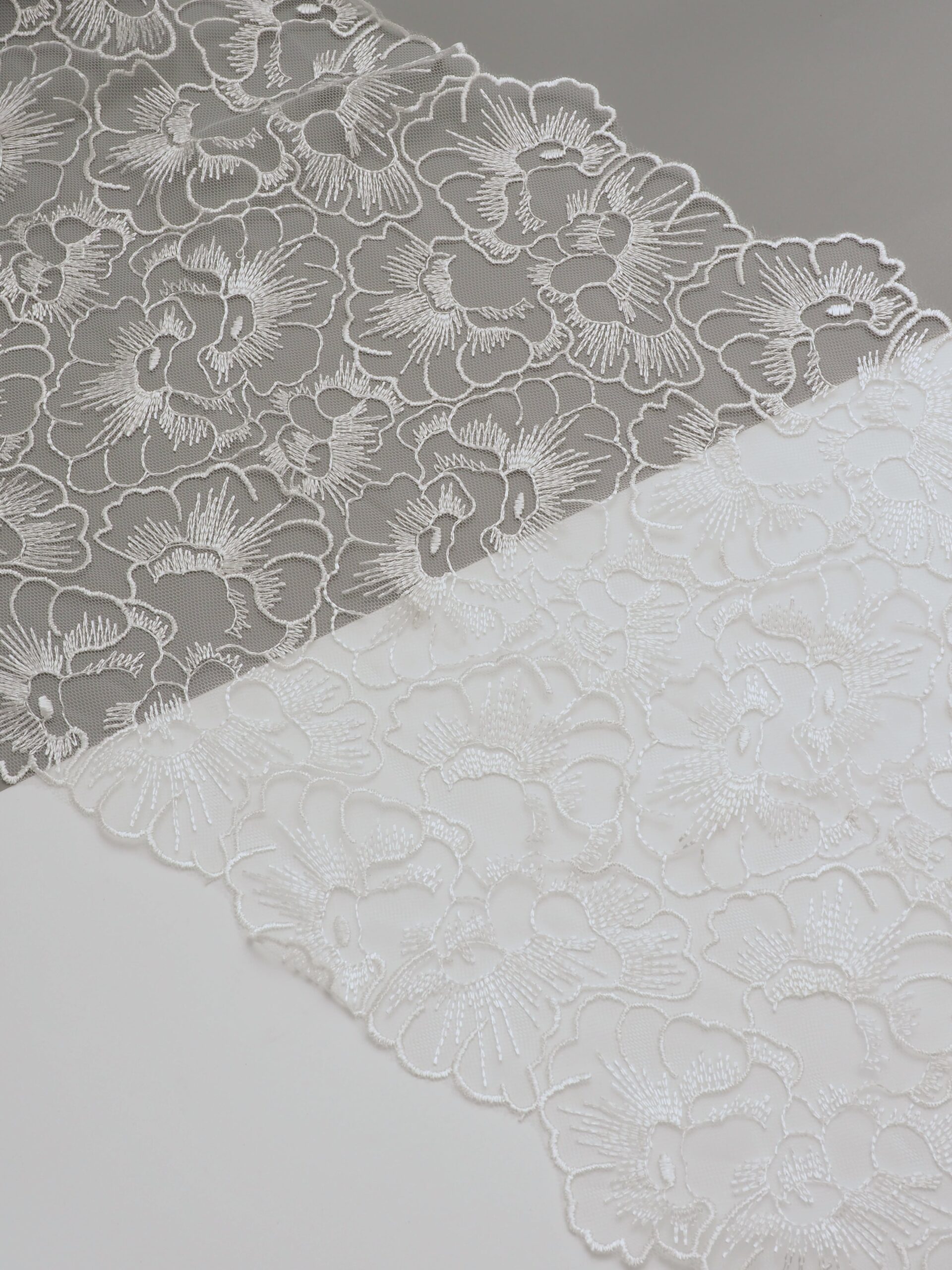 Кружево на сетке неэластичное белого цвета с цветочной вышивкой. Вышивка на сетке белая.