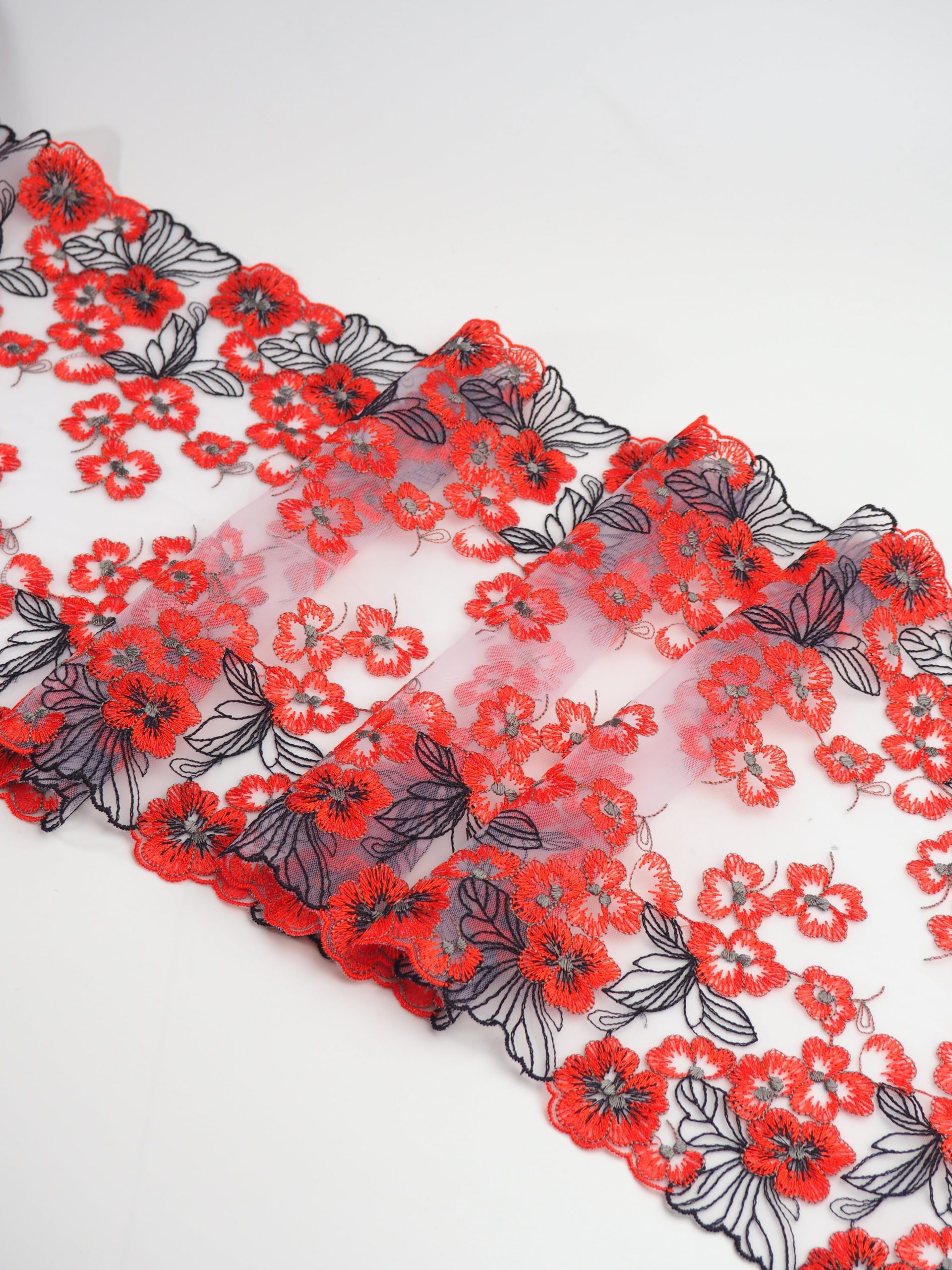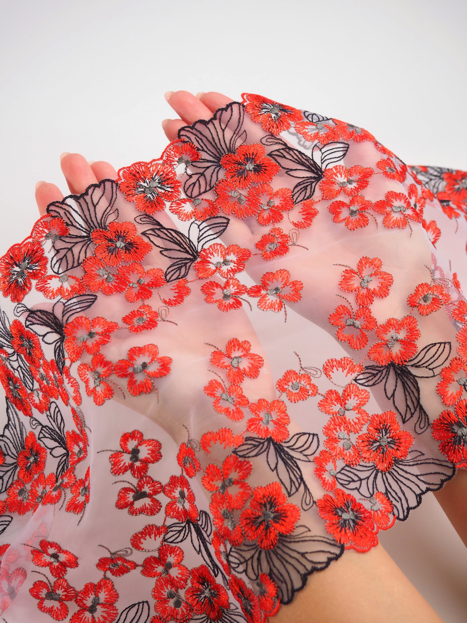 Кружево на сетке неэластичное белого оттенка с красным цветочным рисунком. Вышивка красно-оранжевого и черного цвета на белой сетке.