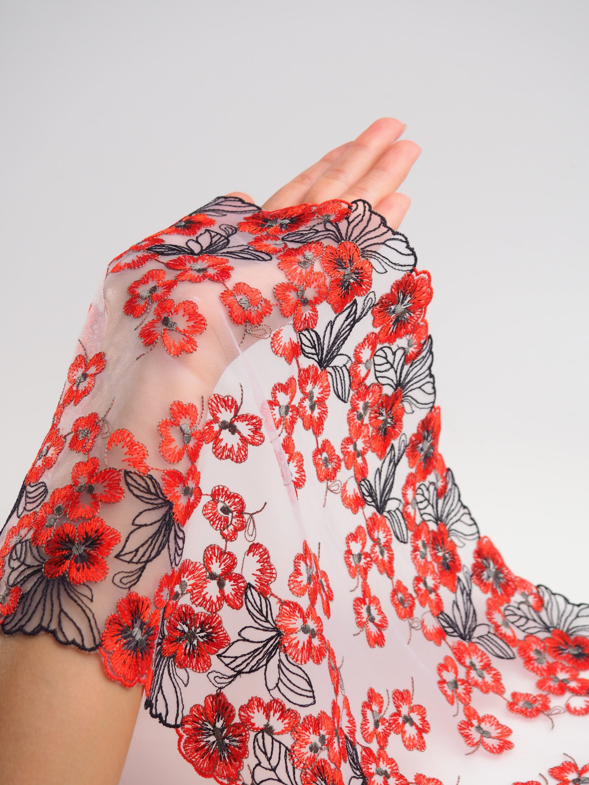 Вышивка на сетке белая с с черным и красно-оранжевым - удобная и красивая ткань для создания оригинального декора. Готовая основа с кружевными узорами и орнаментами - настоящая помощь рукодельницам. Вышивка на сетке великолепно держит форму, не осыпается по краям, отлично драпируется, отличается высокой прочностью на разрыв, весит очень мало, служит в течение многих лет. Используя кружево на сетке, вы легко создадите эффектное эксклюзивное изделие. Материал считается универсальным. Его можно использовать в пошиве нижнего белья, кофты, юбки, блузки, вечернего и свадебного платья.