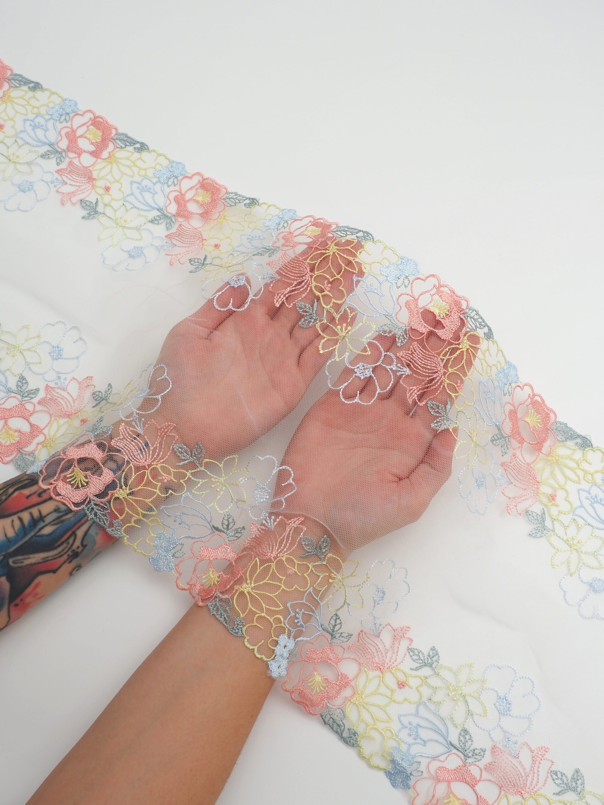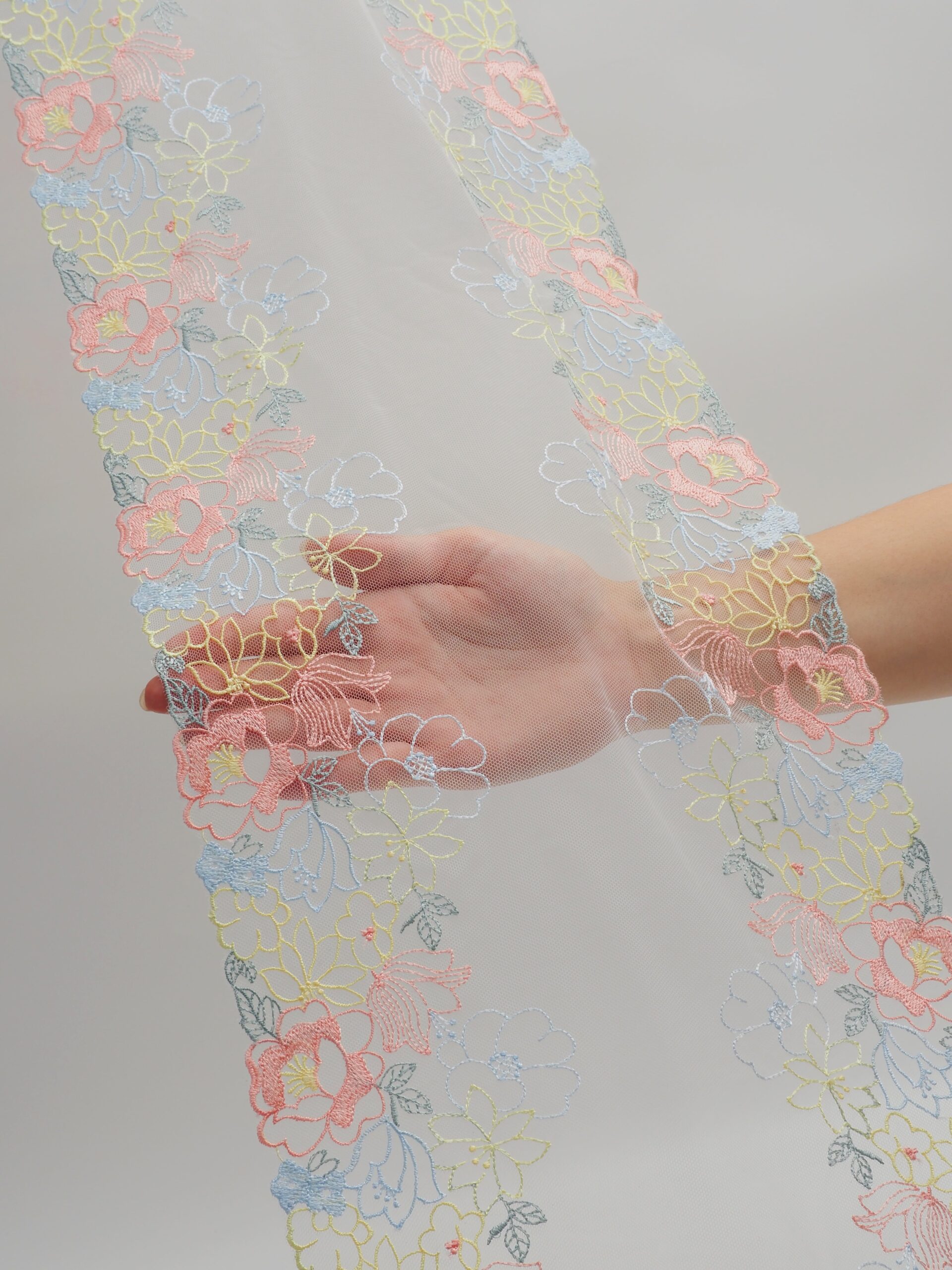 Кружево на сетке неэластичное белого цвета с цветочной разноцветной вышивкой. Вышивка на сетке белая с мультиколор.