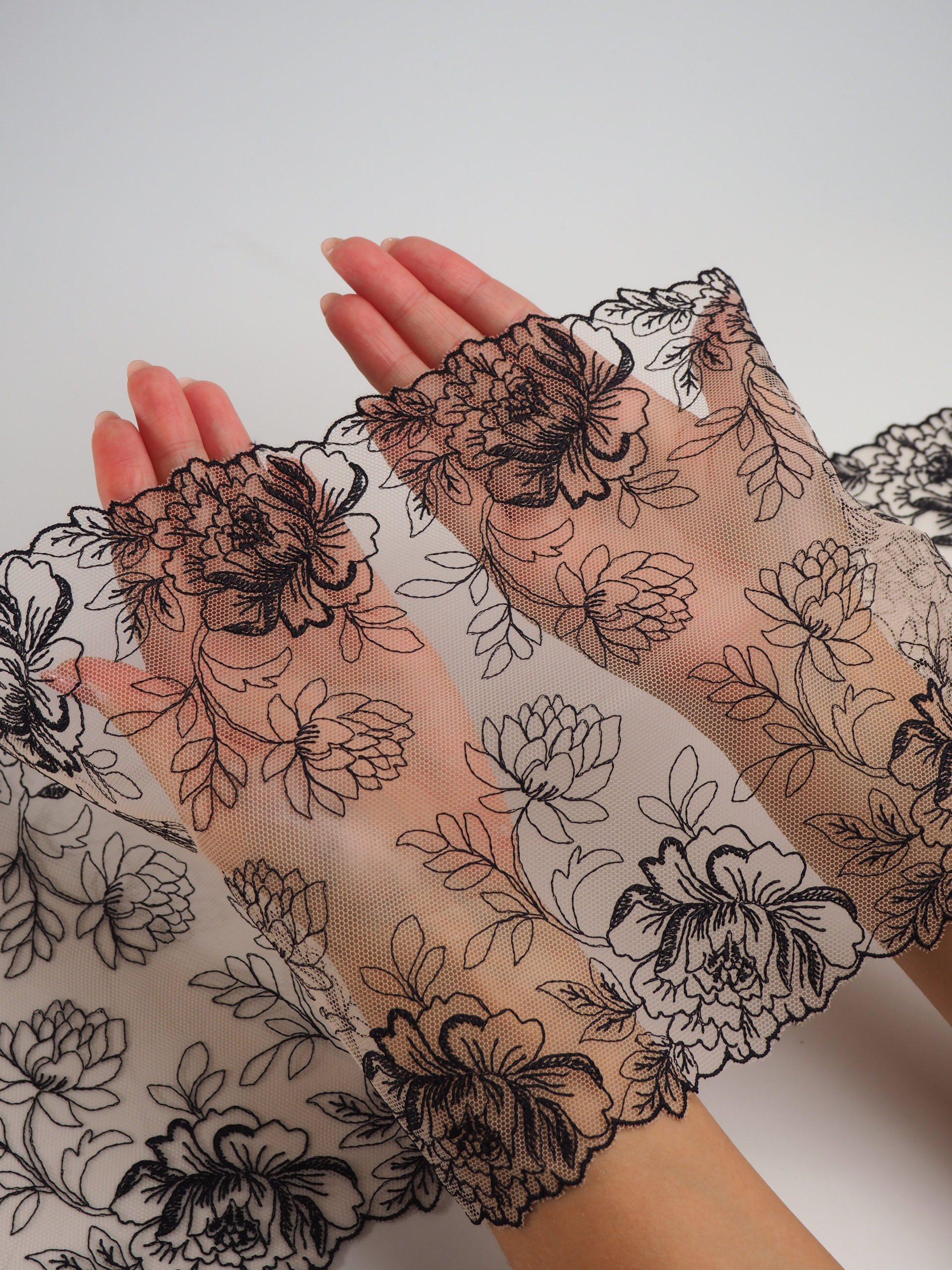 Вышивка на сетке бежевая с черным - удобная и красивая ткань для создания оригинального декора. Готовая основа с кружевными узорами и орнаментами - настоящая помощь рукодельницам. Вышивка на сетке великолепно держит форму, не осыпается по краям, отлично драпируется, отличается высокой прочностью на разрыв, весит очень мало, служит в течение многих лет. Используя кружево на сетке, вы легко создадите эффектное эксклюзивное изделие. Материал считается универсальным. Его можно использовать в пошиве нижнего белья, кофты, юбки, блузки, вечернего и свадебного платья.
