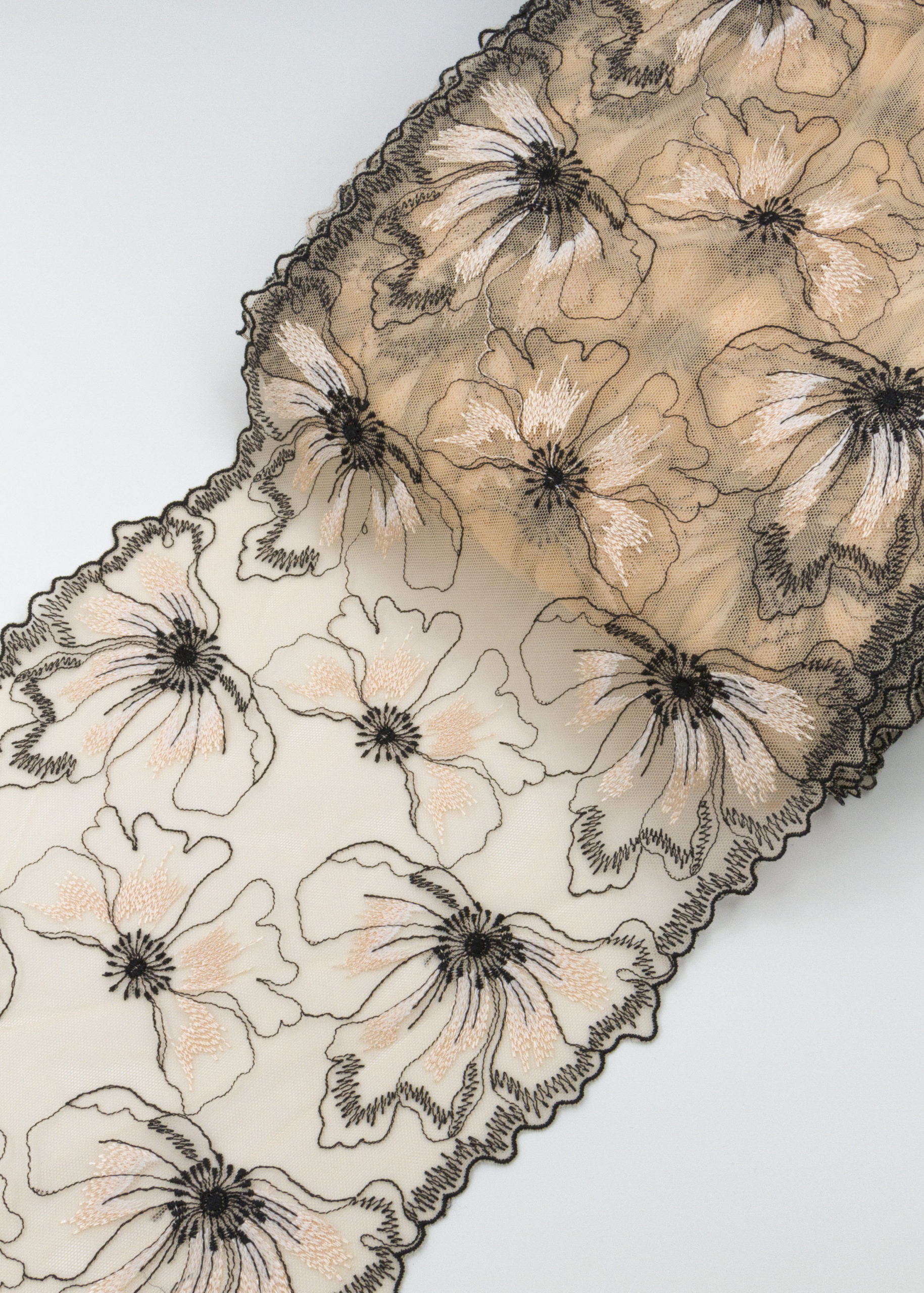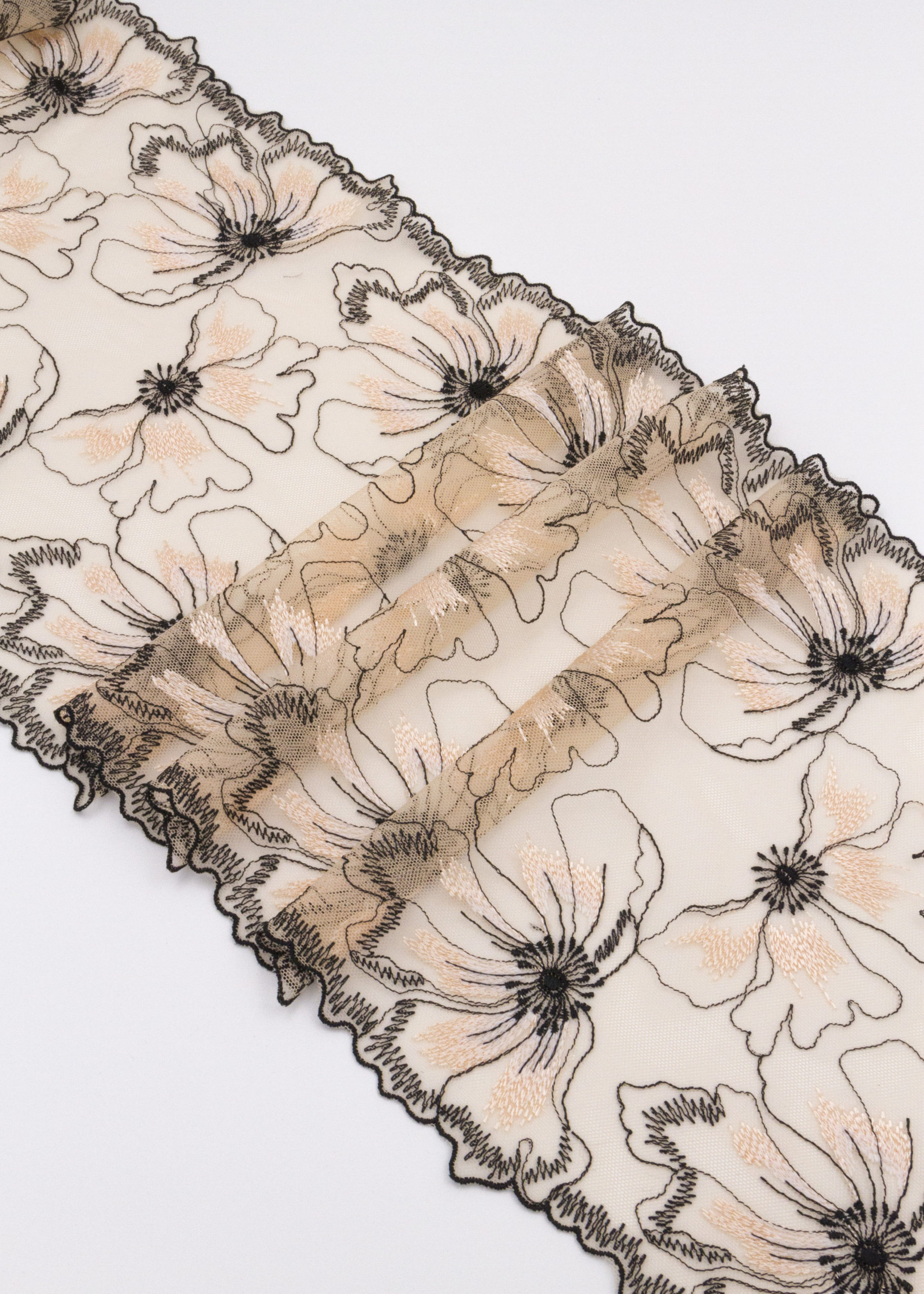 Вышивка на сетке бежевая с розовинкой с черным- удобная и красивая ткань для создания оригинального декора. Готовая основа с кружевными узорами и орнаментами - настоящая помощь рукодельницам. Вышивка на сетке великолепно держит форму, не осыпается по краям, отлично драпируется, отличается высокой прочностью на разрыв, весит очень мало, служит в течение многих лет. Используя кружево на сетке, вы легко создадите эффектное эксклюзивное изделие. Материал считается универсальным. Его можно использовать в пошиве нижнего белья, кофты, юбки, блузки, вечернего и свадебного платья.