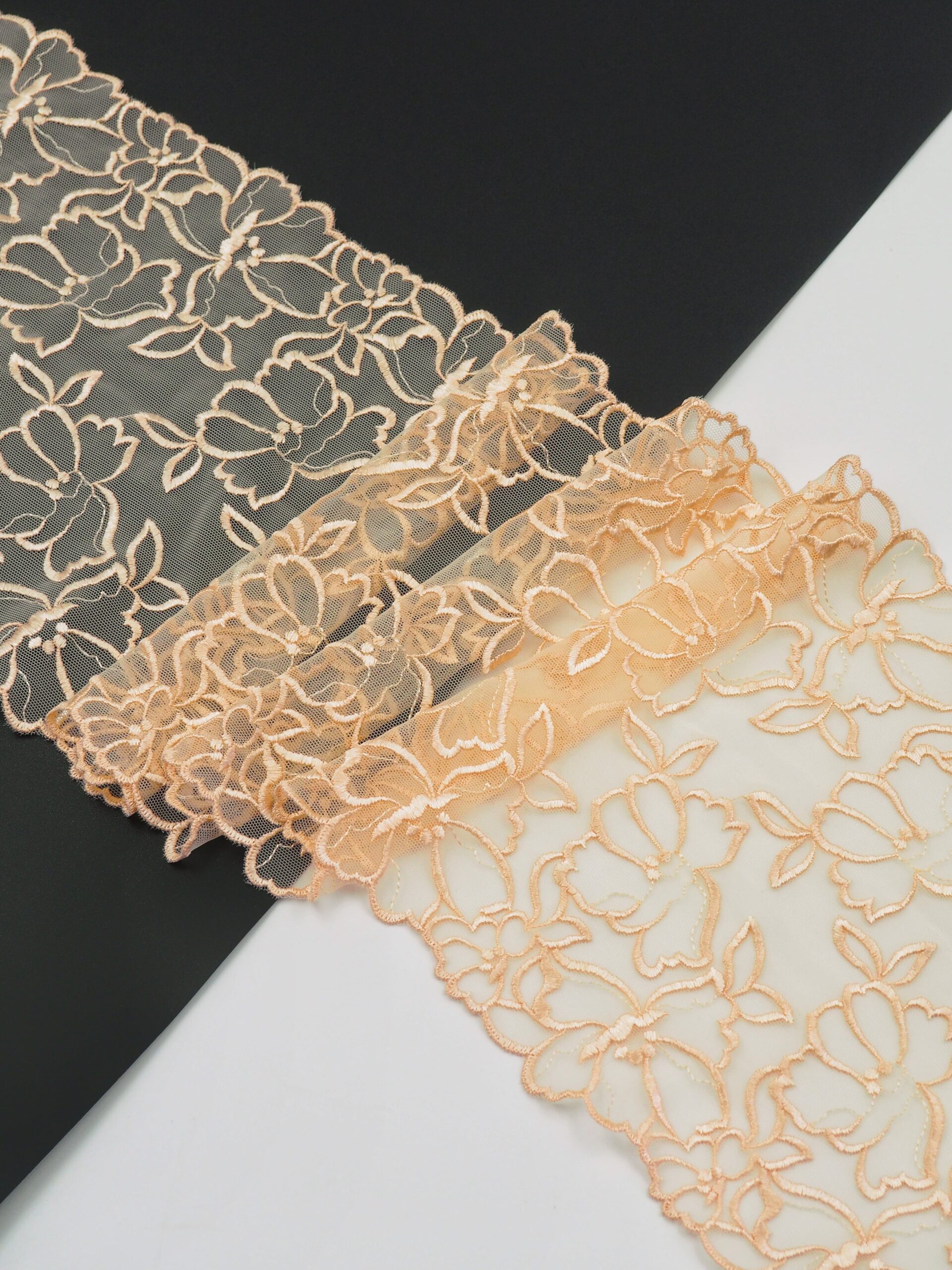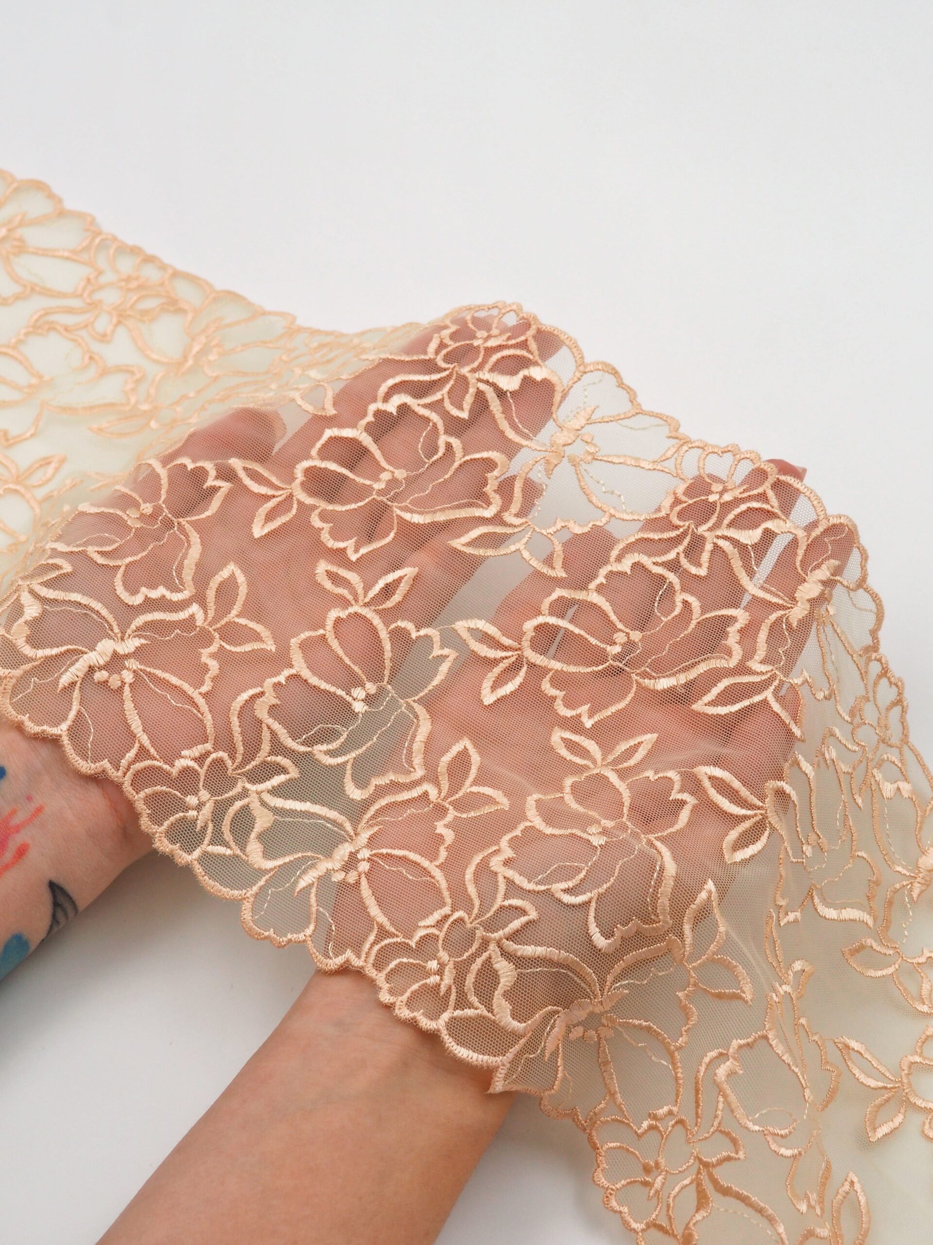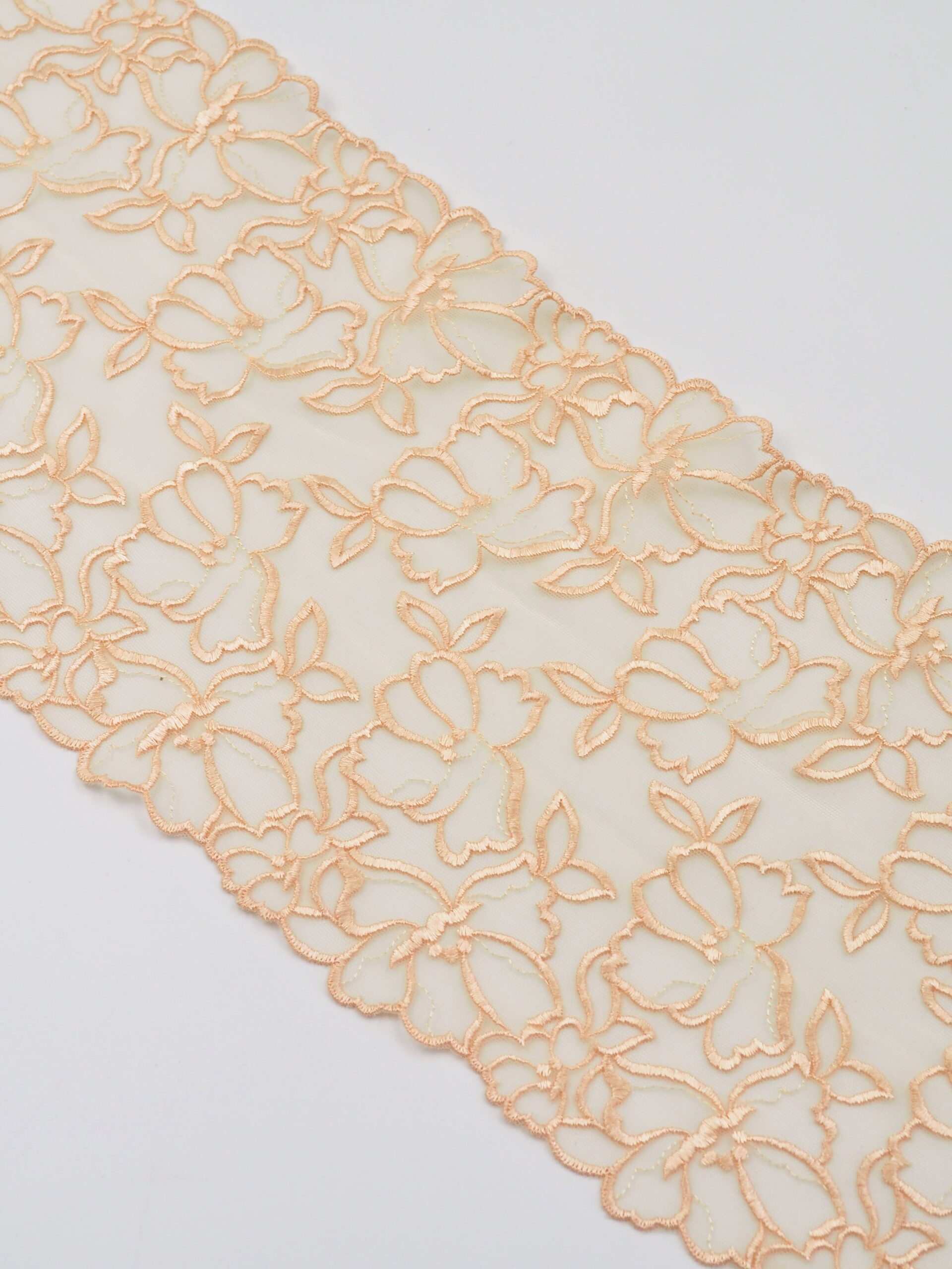 Кружево на сетке эластичное бежевого оттенка с цветочным рисунком. Вышивка бежевого цвета на бежевой сетке.