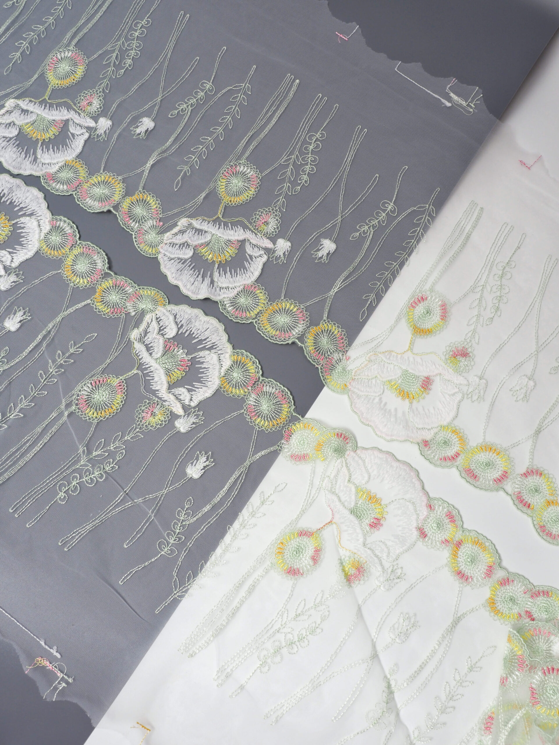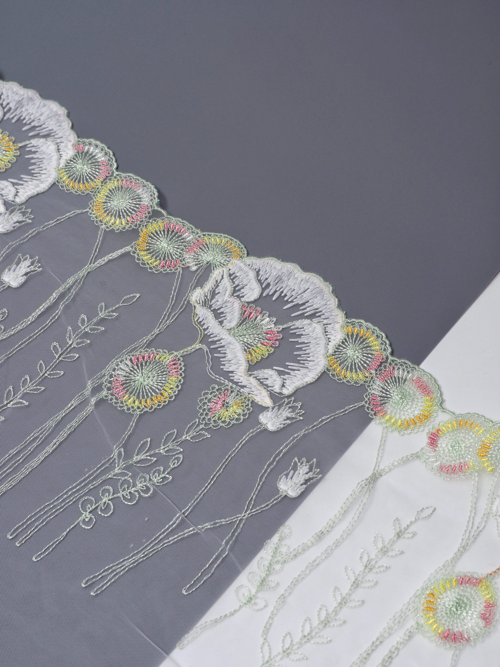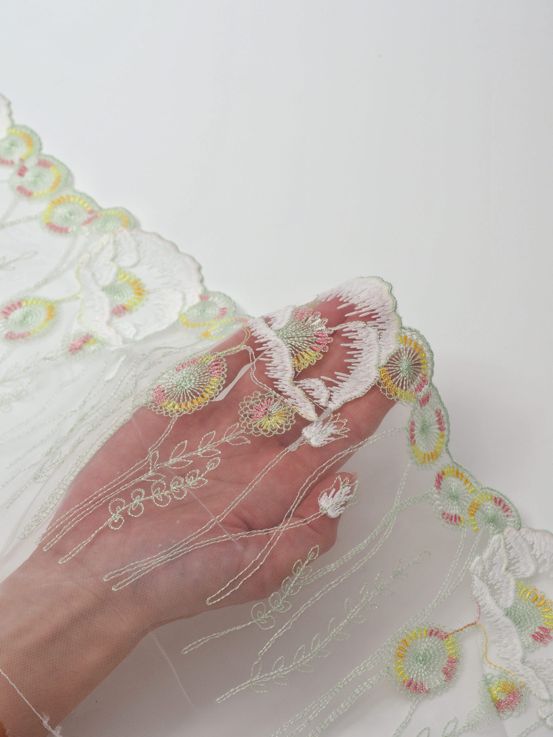 Кружево на сетке неэластичное с рисунком в левую и правую сторону. Вышивка разноцветная на бледнозеленой сетке.