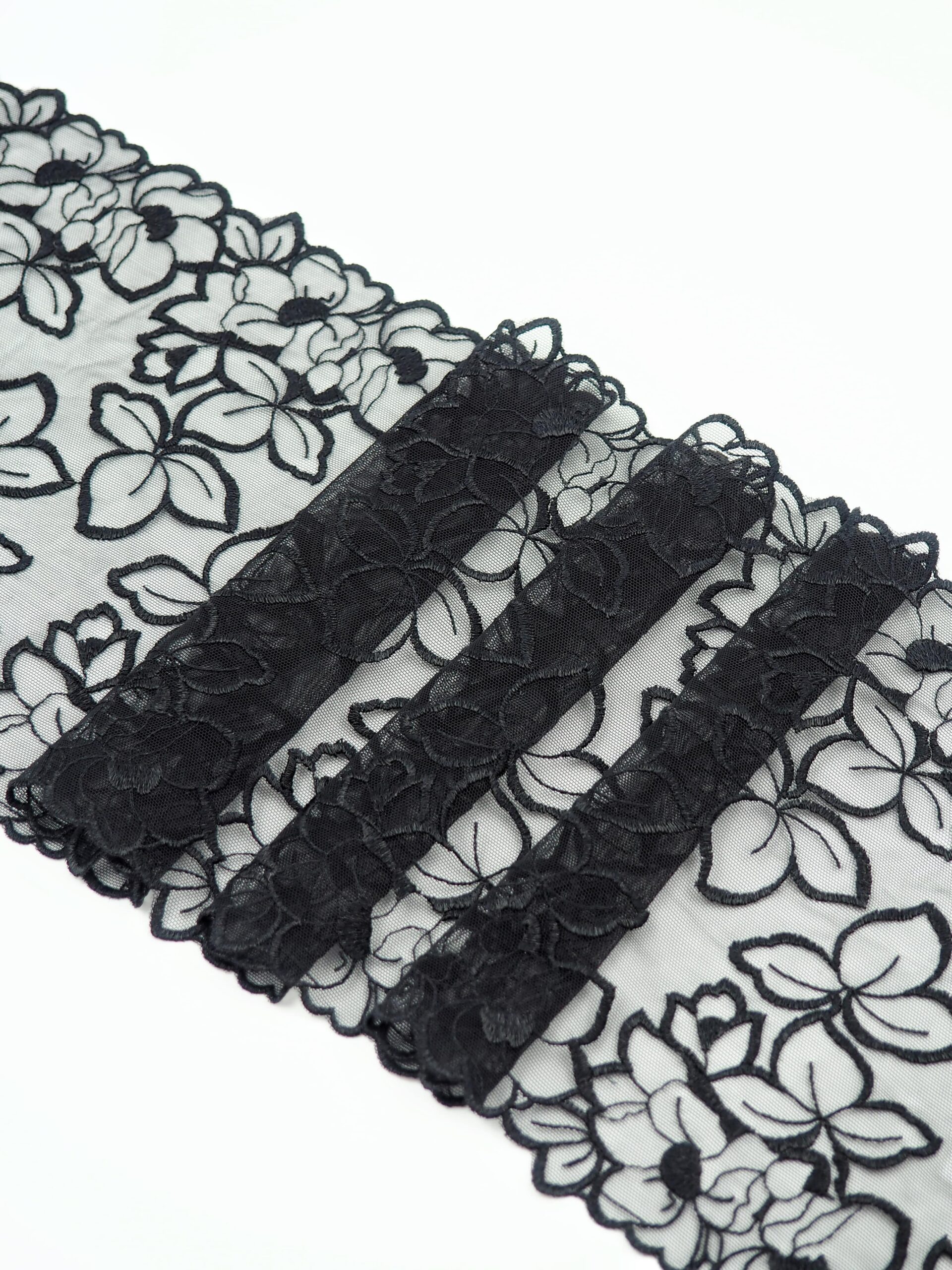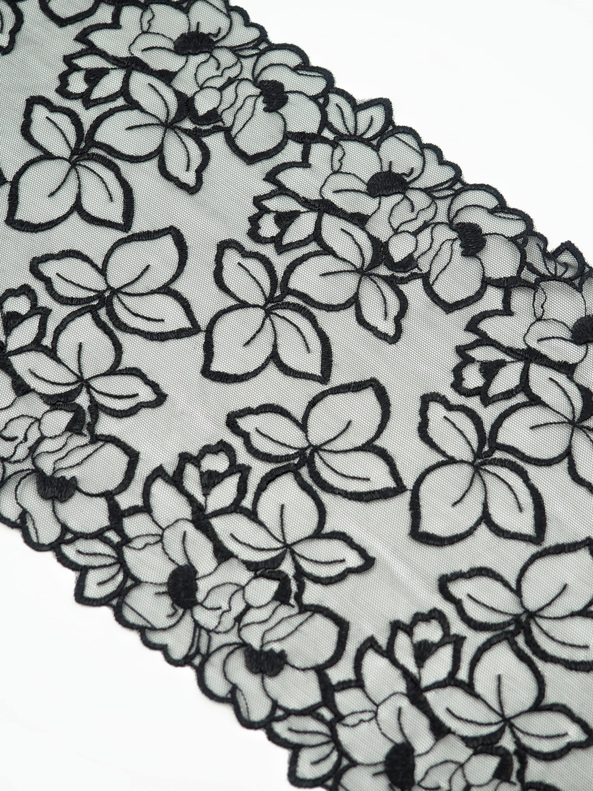 Кружево на сетке эластичное черного оттенка с цветочным рисунком. Вышивка на черной сетке с черными цветами..