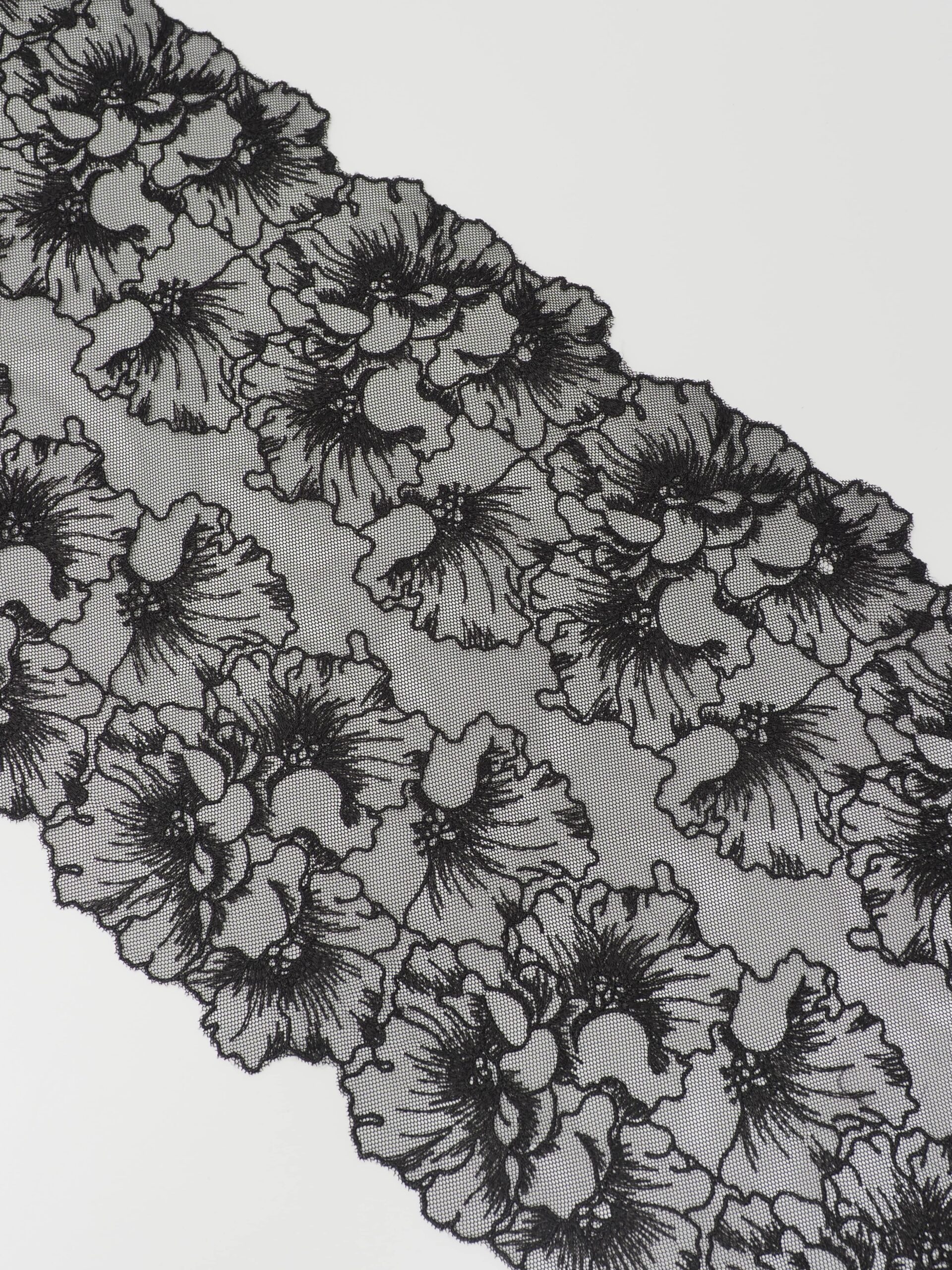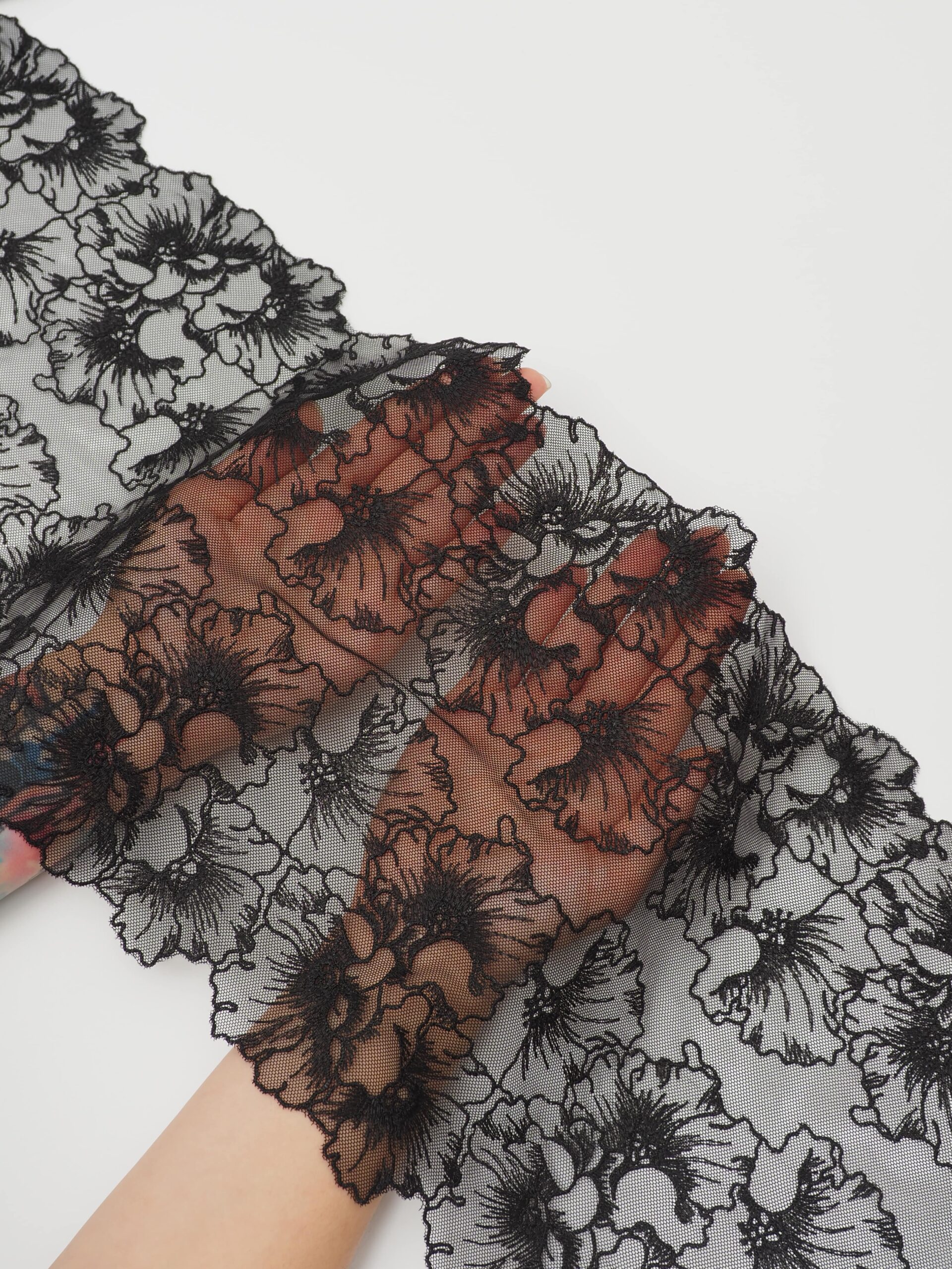 Кружево на сетке неэластичное черного оттенка с черным цветочным рисунком. Вышивка черного цвета на черной сетке.