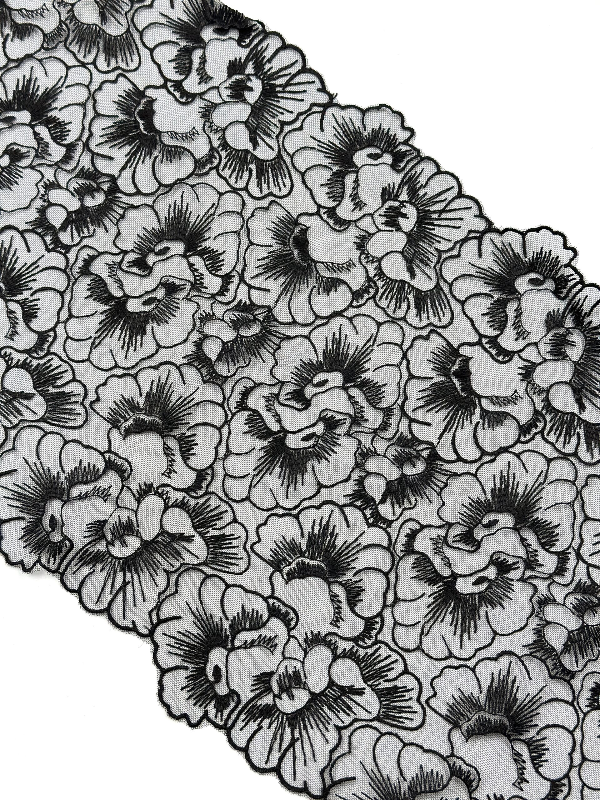 Кружево на сетке неэластичное черного цвета с цветочной вышивкой. Вышивка на сетке черная.