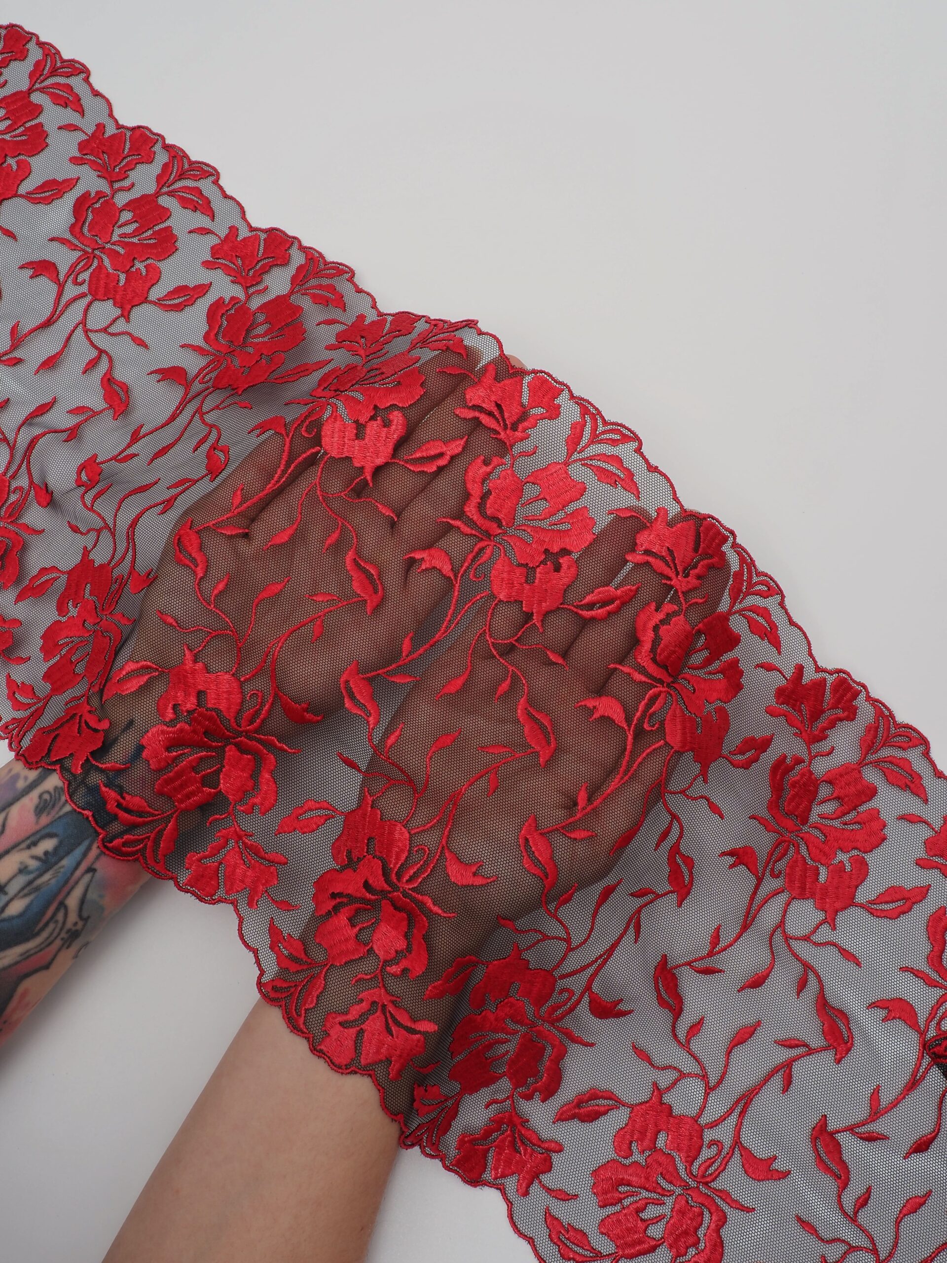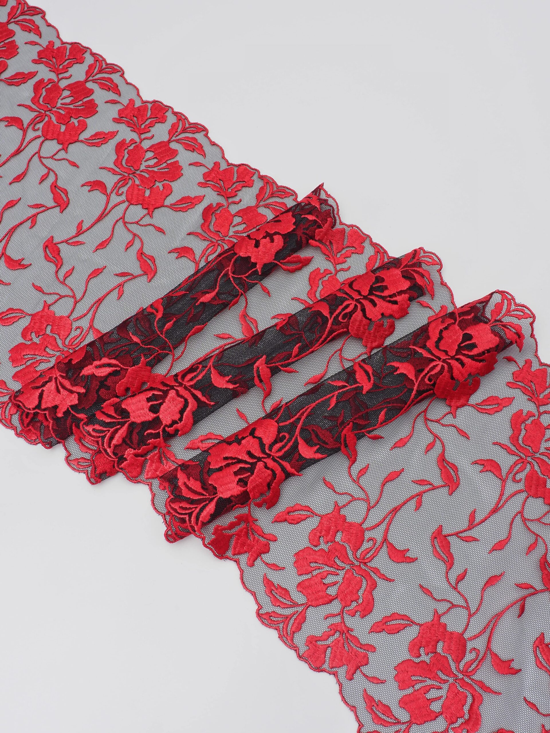 Кружево на сетке неэластичное черного цвета с красной цветочной вышивкой. Вышивка красного цвета на черной сетке .