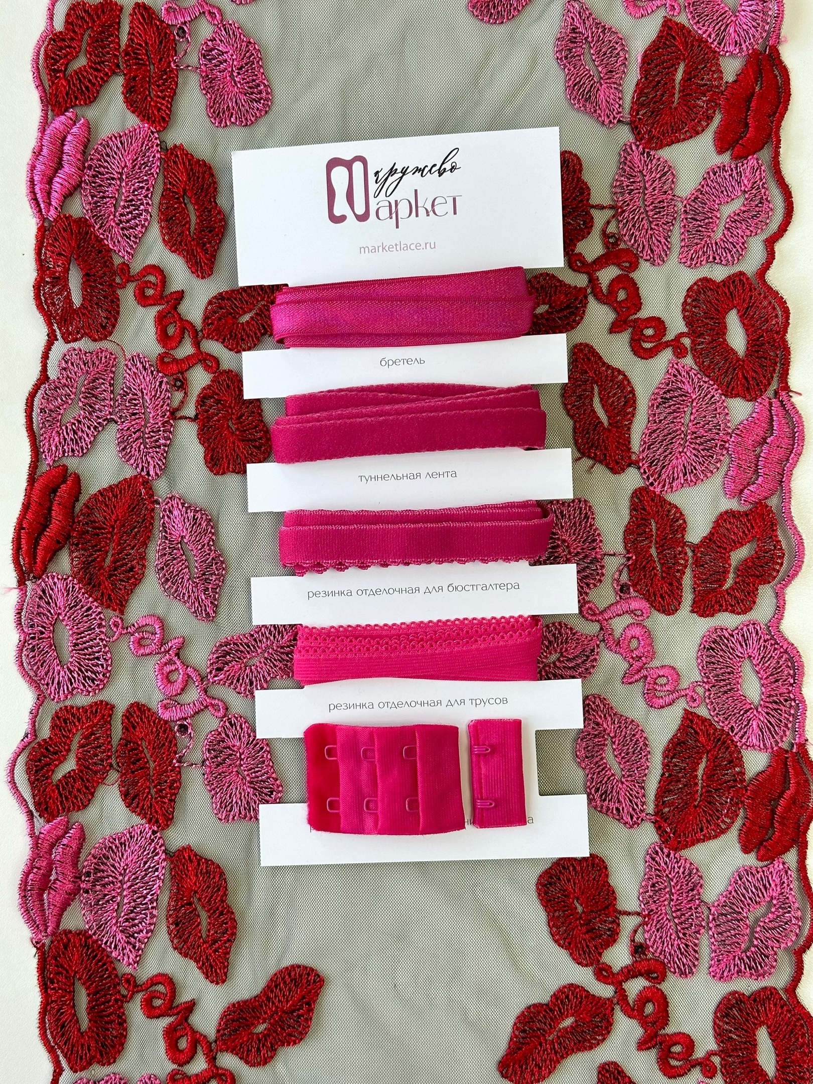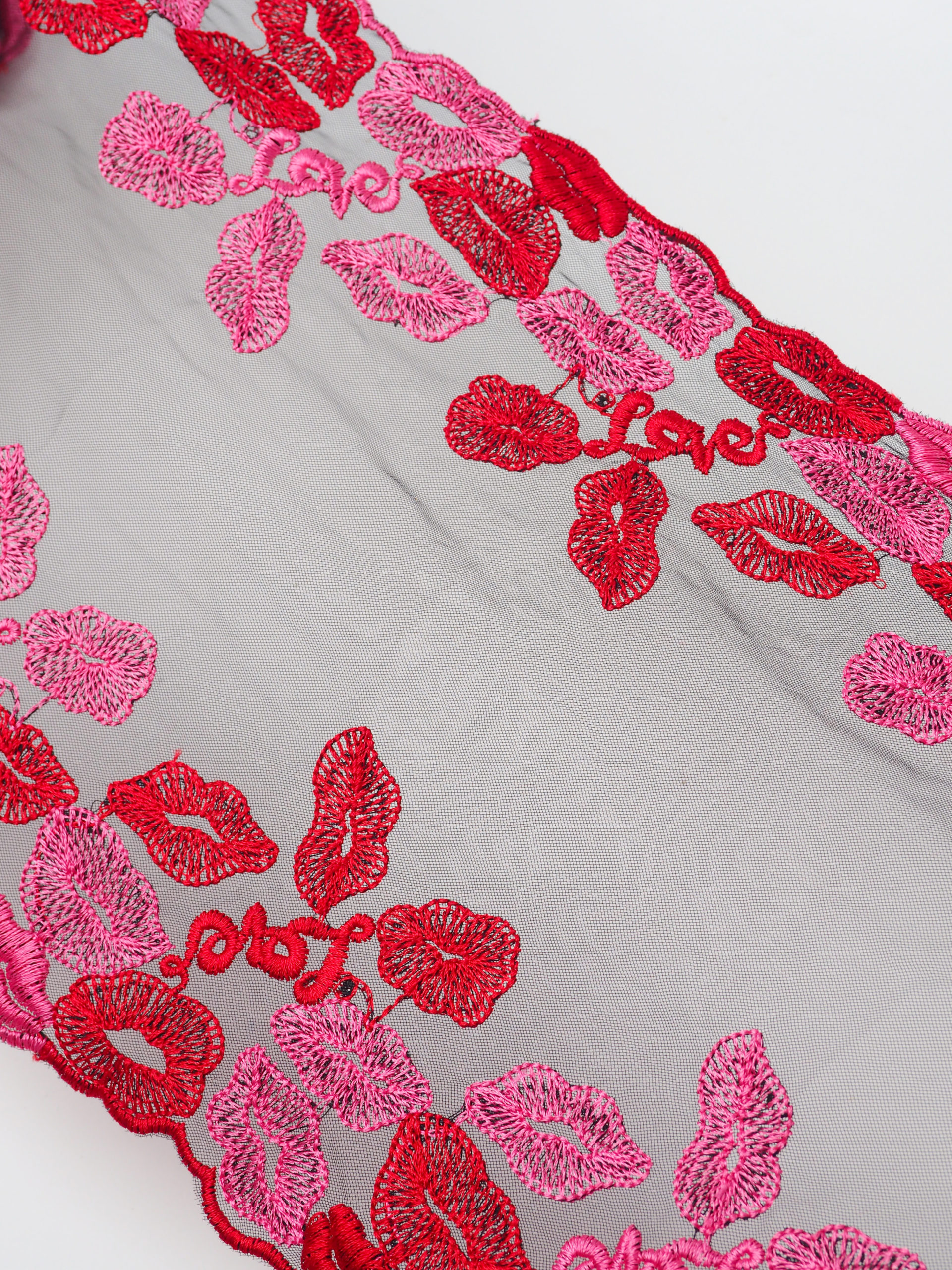 Кружево на сетке неэластичное черного, красного и розового оттенка с рисунком губ. Вышивка красного и розового цвета на черной сетке.