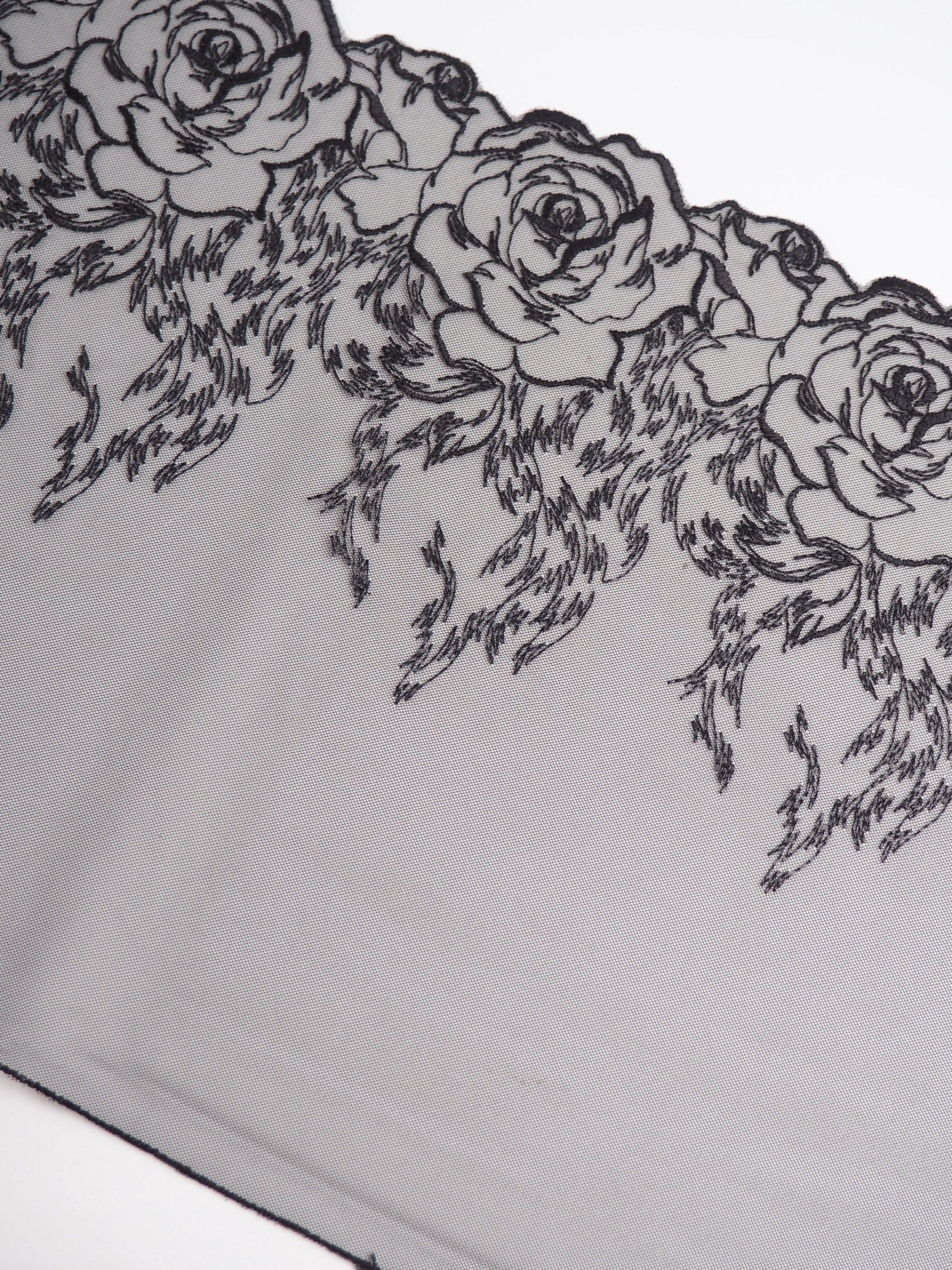 Вышивка на сетке неэластичная черного цвета с люрексом в левую и правую сторону. Кружево на сетке черное с люрексом.