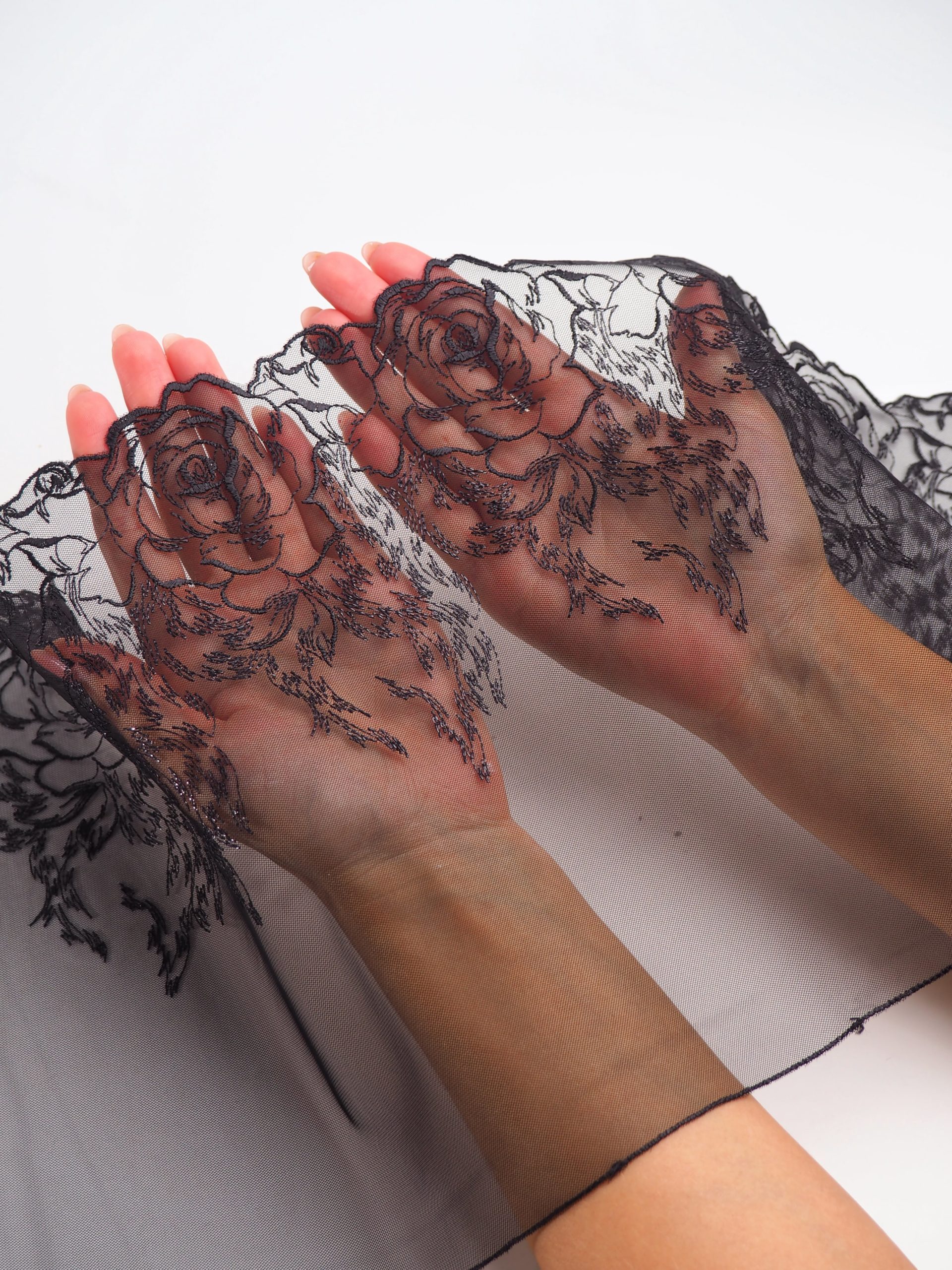 Вышивка на сетке черная с люрексом - удобная и красивая ткань для создания оригинального декора. Готовая основа с кружевными узорами и орнаментами - настоящая помощь рукодельницам. Вышивка на сетке великолепно держит форму, не осыпается по краям, отлично драпируется, отличается высокой прочностью на разрыв, весит очень мало, служит в течение многих лет. Используя кружево на сетке, вы легко создадите эффектное эксклюзивное изделие. Материал считается универсальным. Его можно использовать в пошиве нижнего белья, кофты, юбки, блузки, вечернего и свадебного платья.