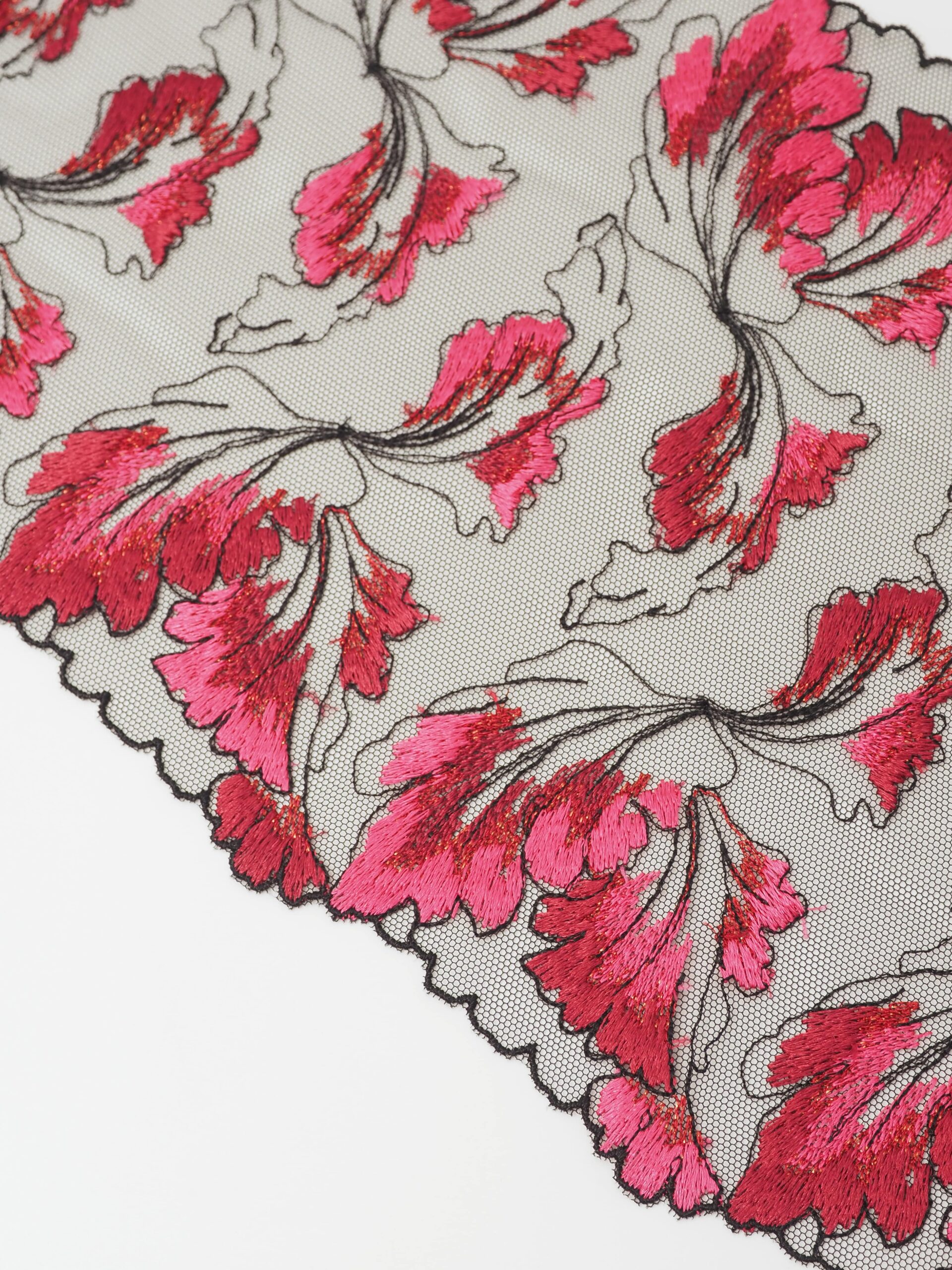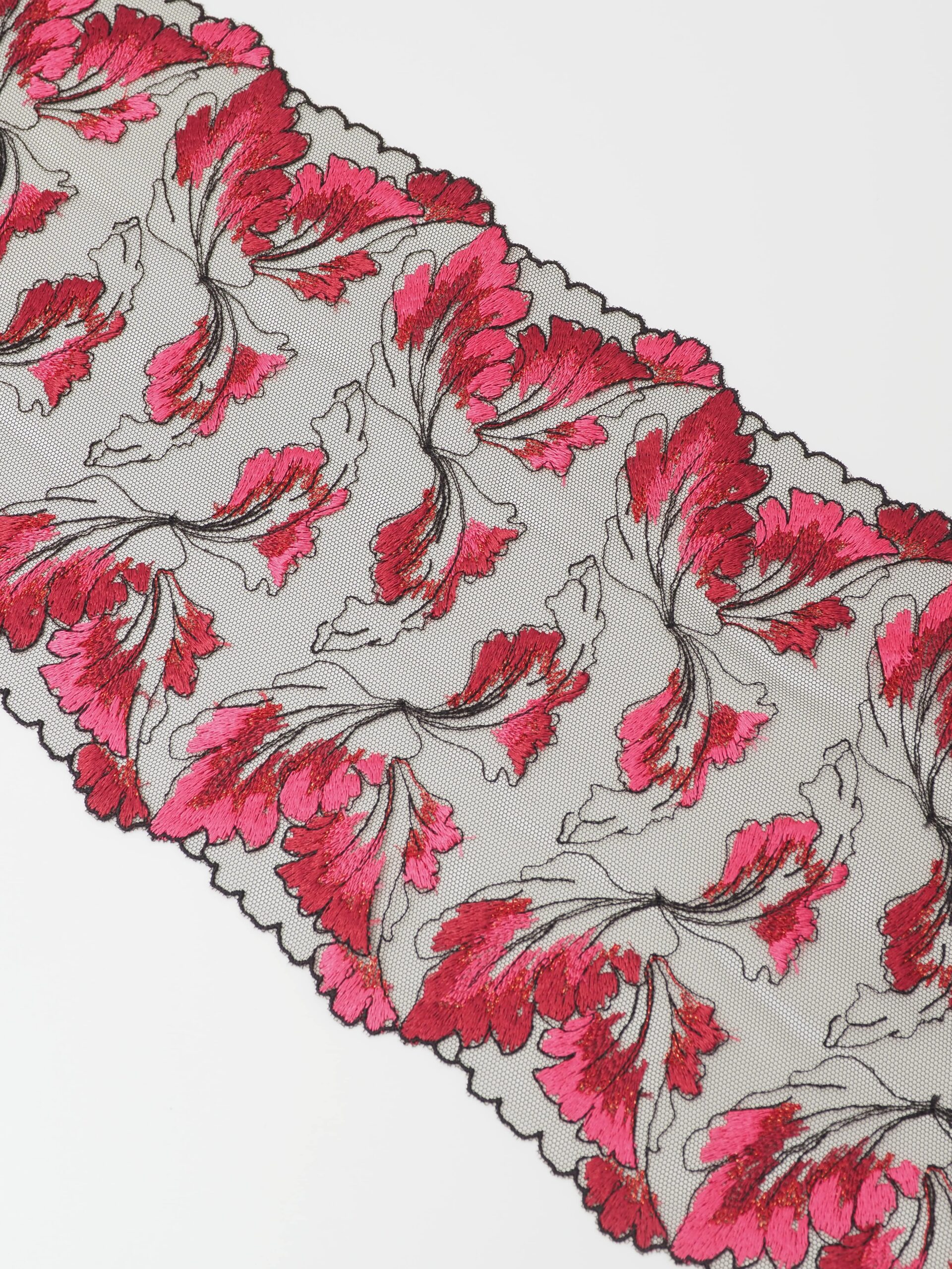 Кружево на сетке неэластичное черного цвета с цветочной вышивкой розового и красного цвета. Вышивка темно-красными и розовыми нитками на черной сетке.