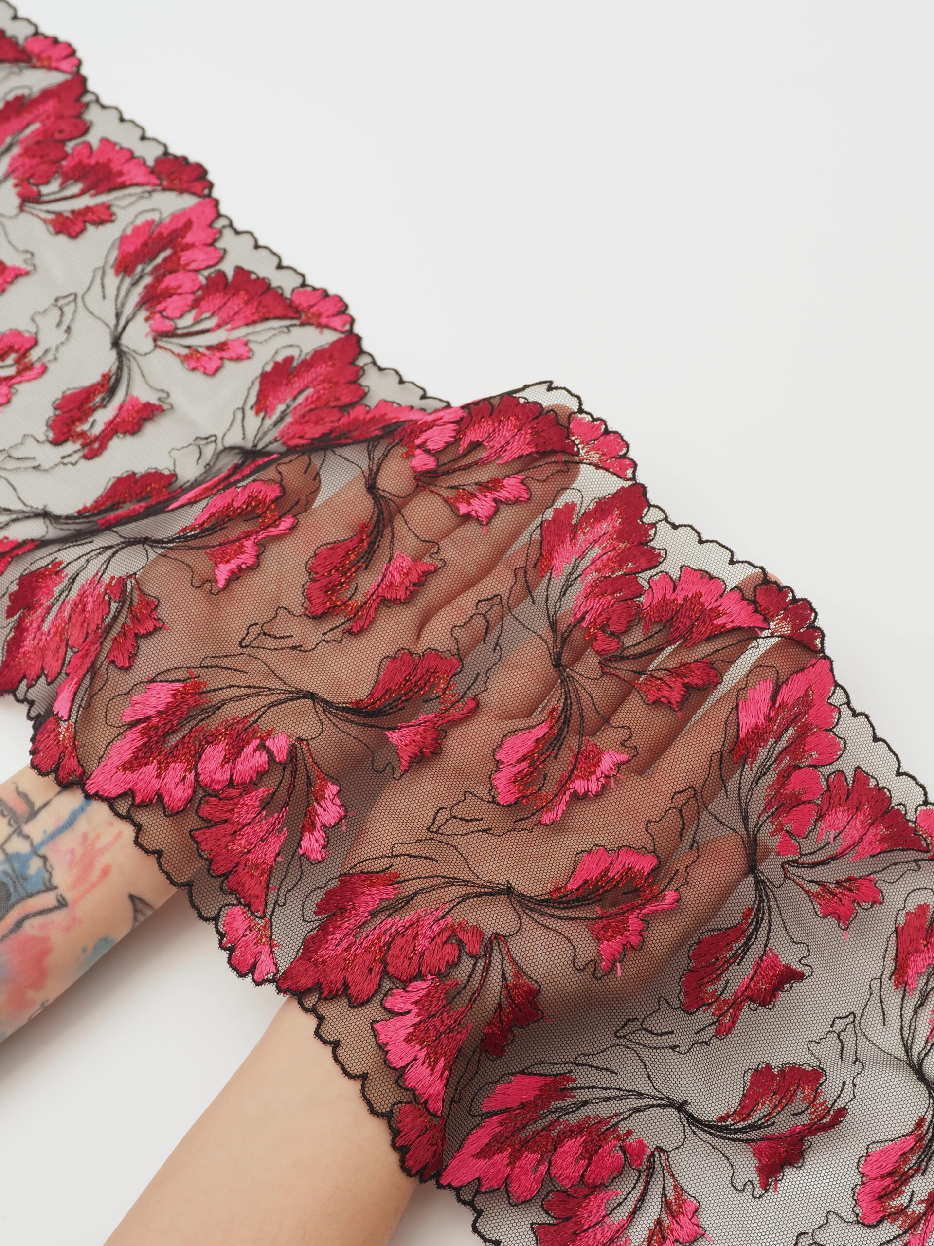 Вышивка на сетке черная с темно-красным и малиновой фуксией - удобная и красивая ткань для создания оригинального декора. Готовая основа с кружевными узорами и орнаментами - настоящая помощь рукодельницам. Вышивка на сетке великолепно держит форму, не осыпается по краям, отлично драпируется, отличается высокой прочностью на разрыв, весит очень мало, служит в течение многих лет. Используя кружево на сетке, вы легко создадите эффектное эксклюзивное изделие. Материал считается универсальным. Его можно использовать в пошиве нижнего белья, кофты, юбки, блузки, вечернего и свадебного платья.