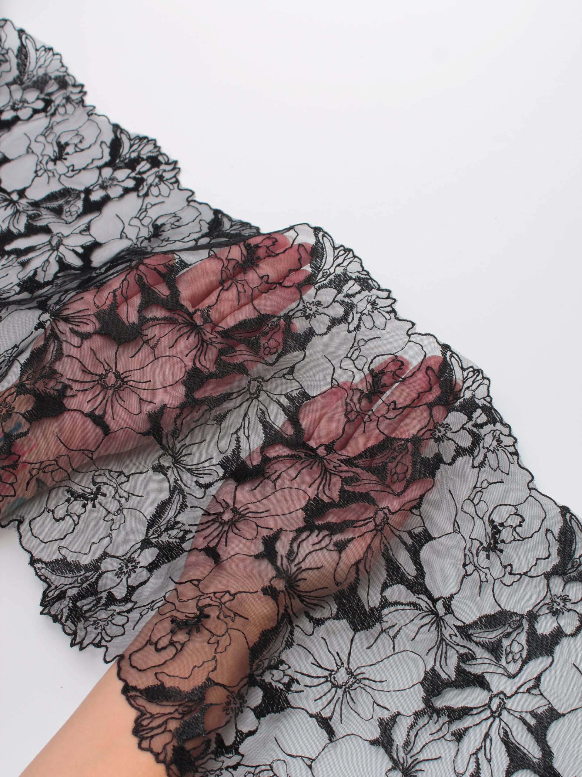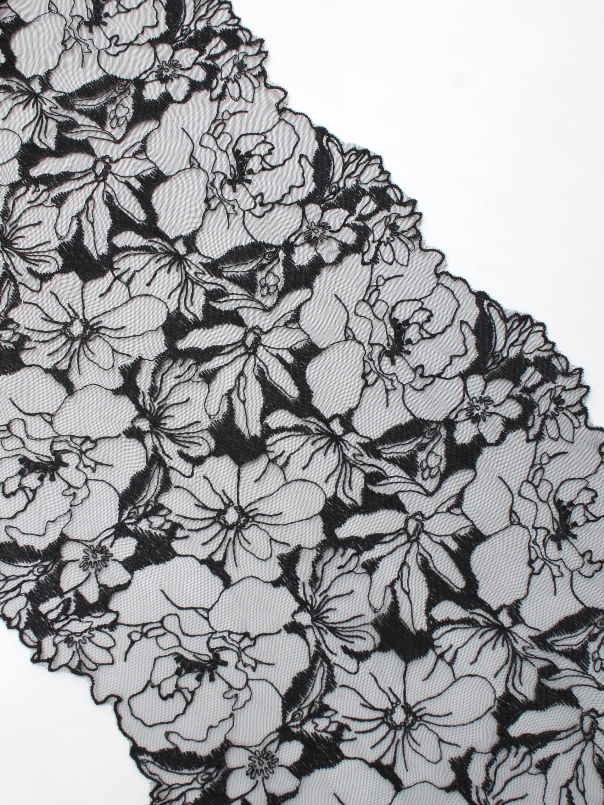 Кружево на сетке неэластичное черного оттенка с черным узорчатым рисунком. Вышивка черного цвета на жесткой черной сетке.