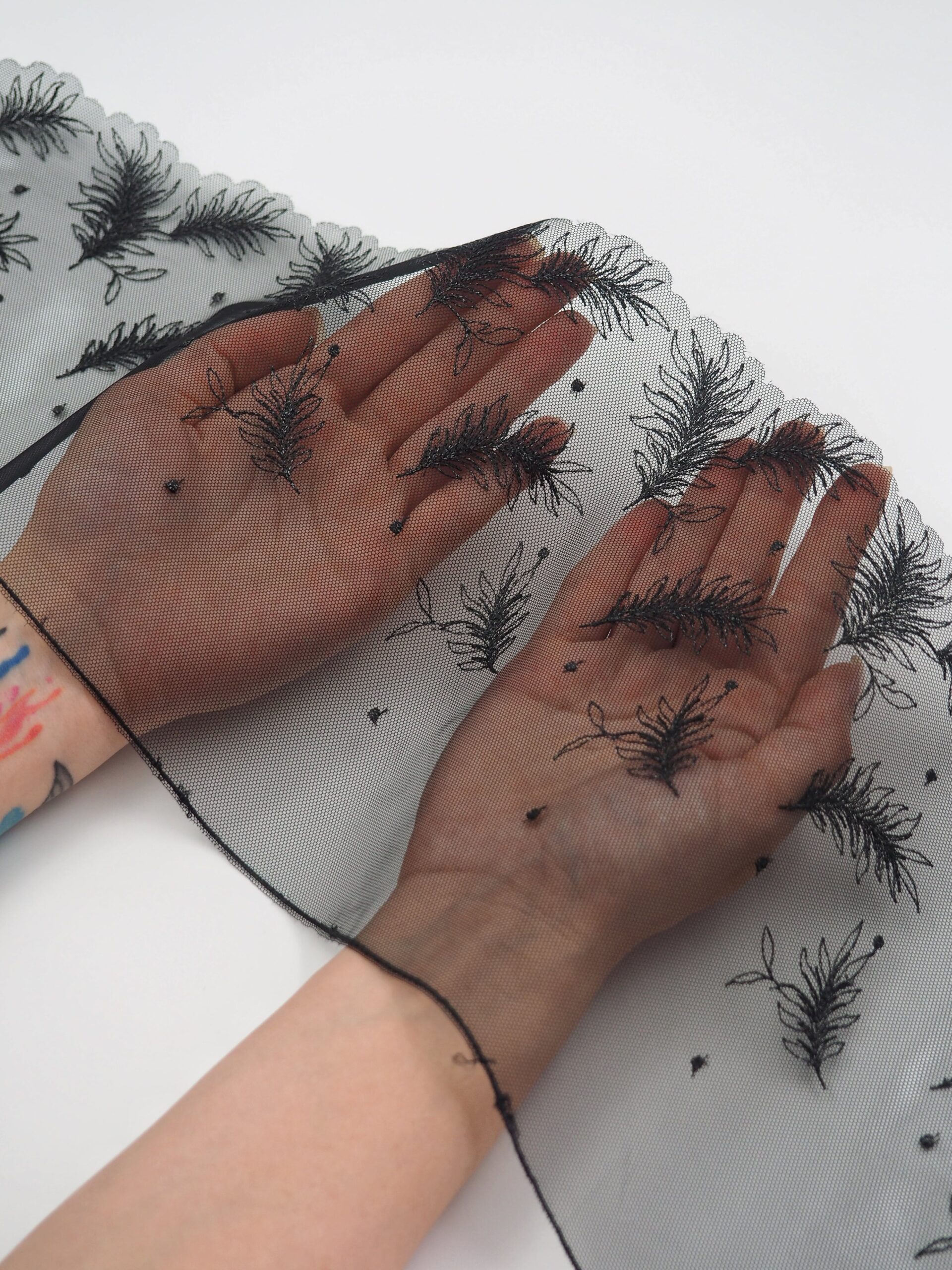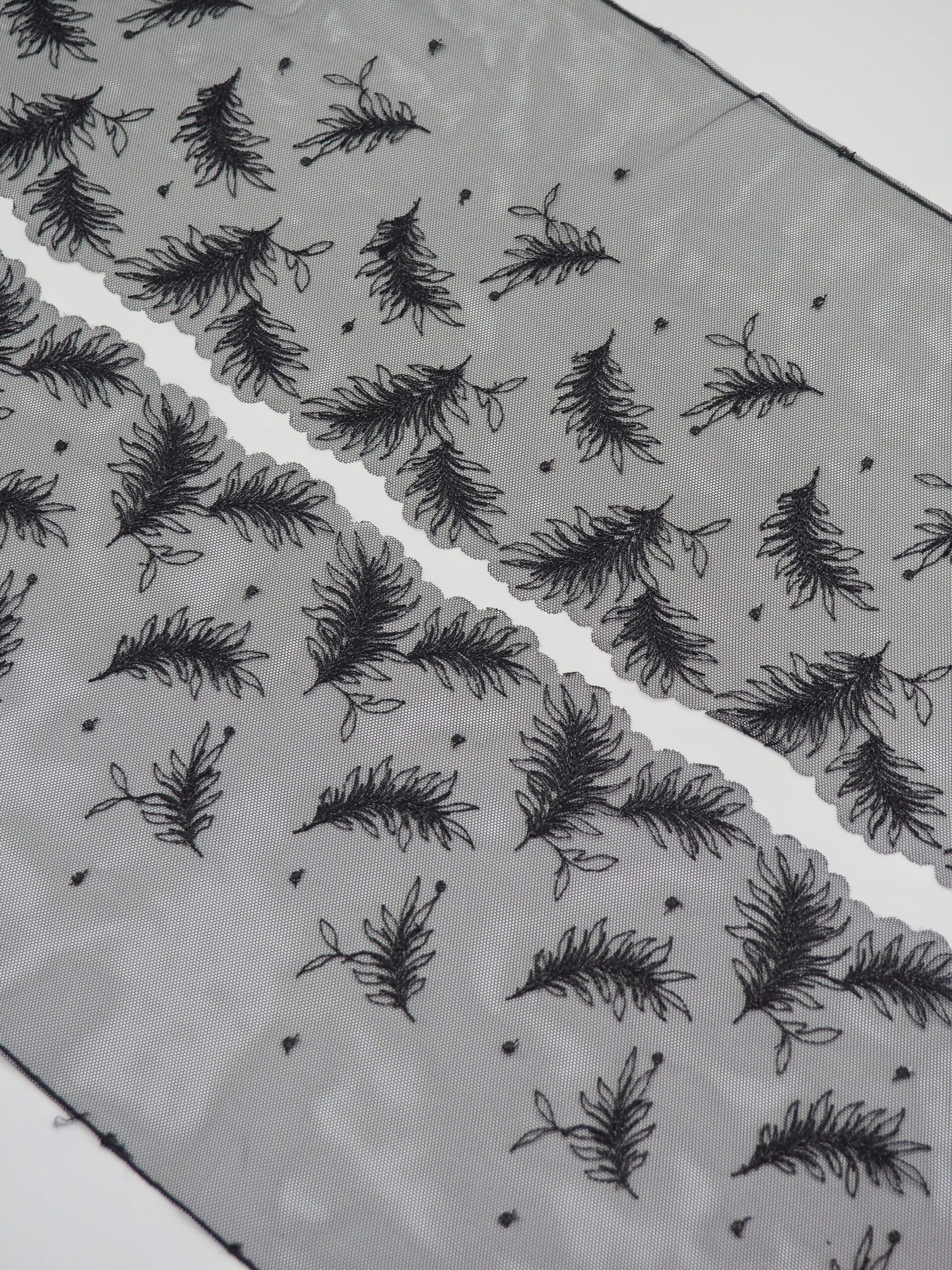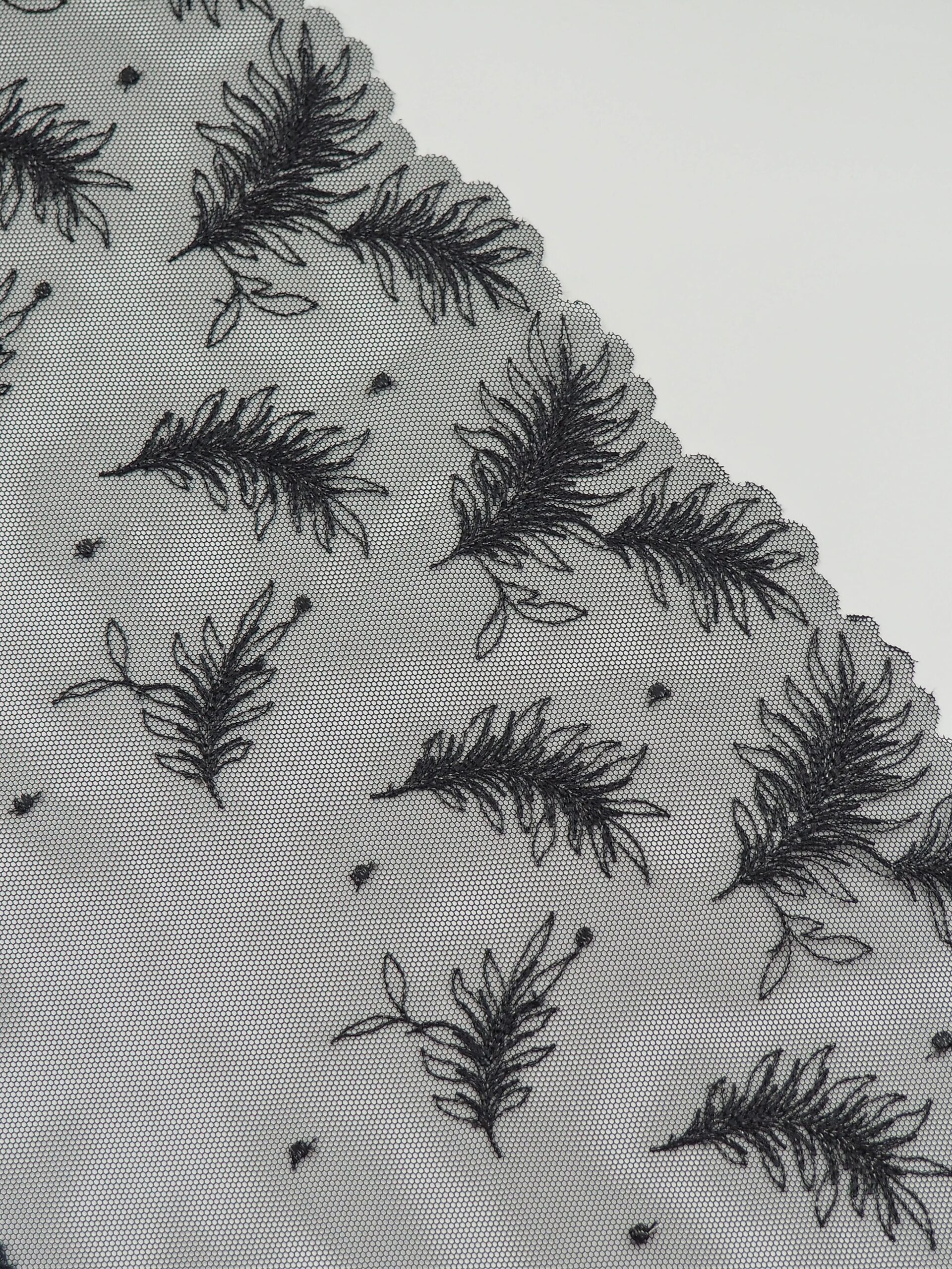 Кружево на сетке неэластичное черное с перьями в правую и левую сторону. Вышивка двусторонняя черного цвета на сетке с блестящей ниткой.