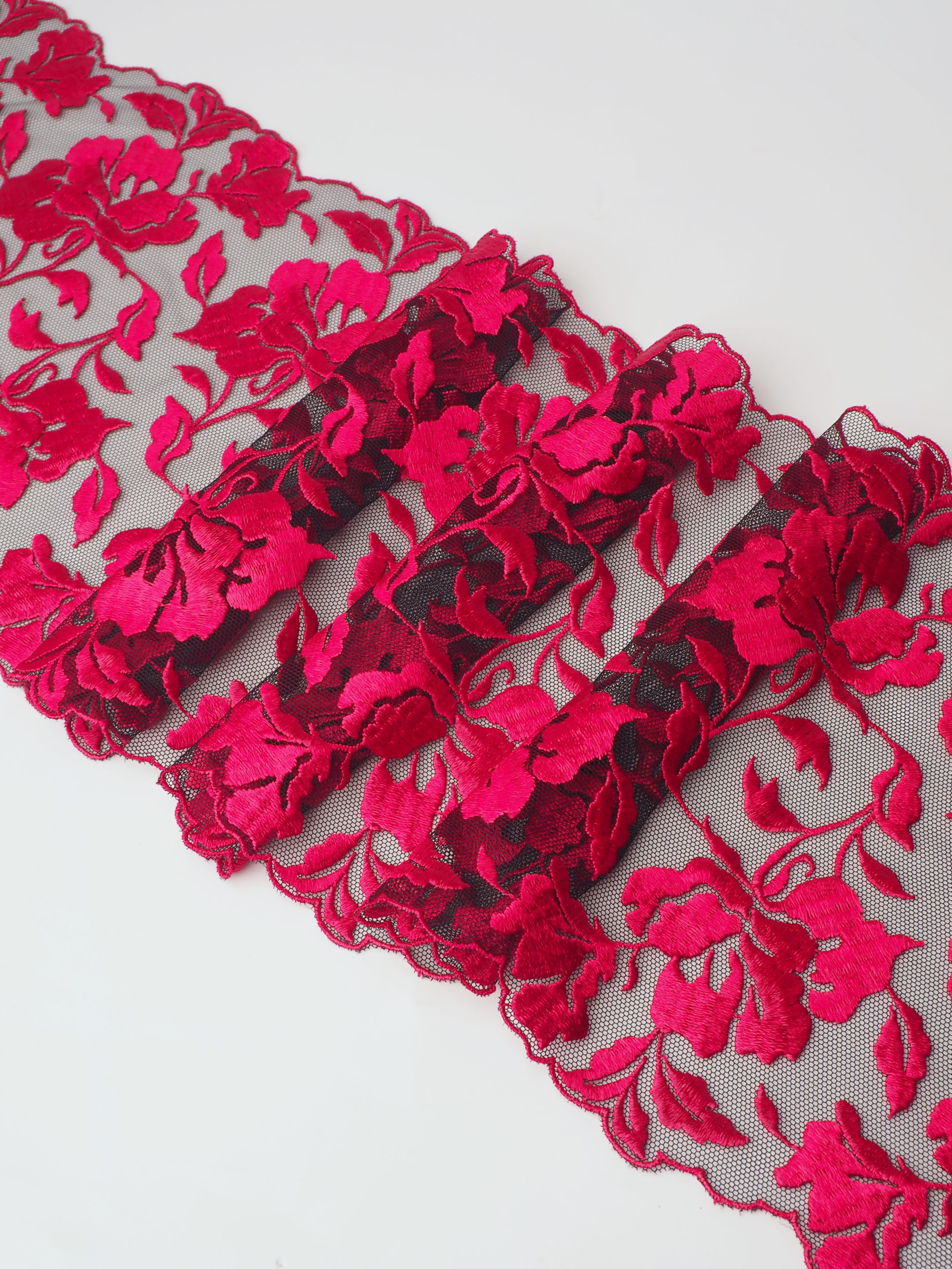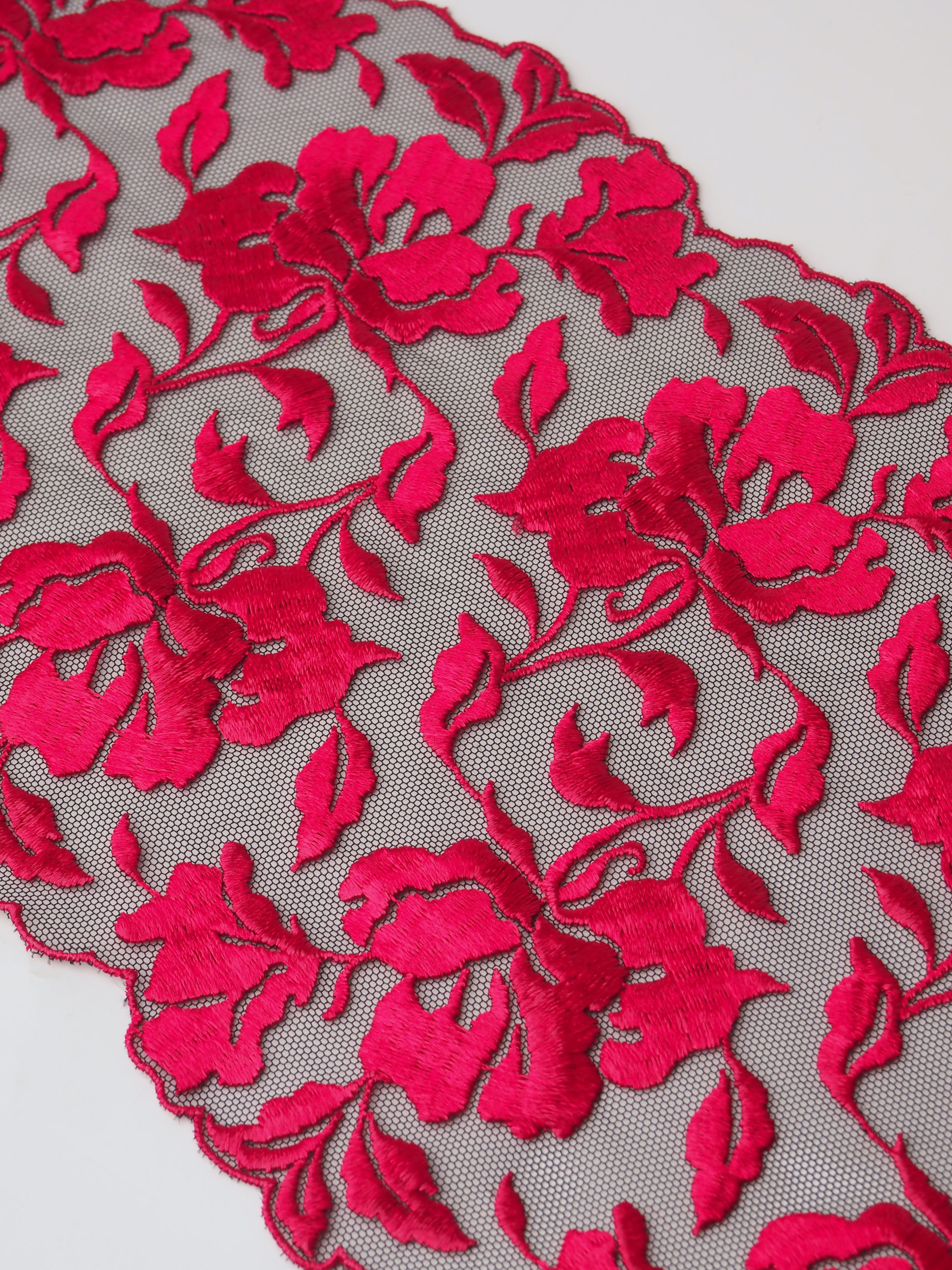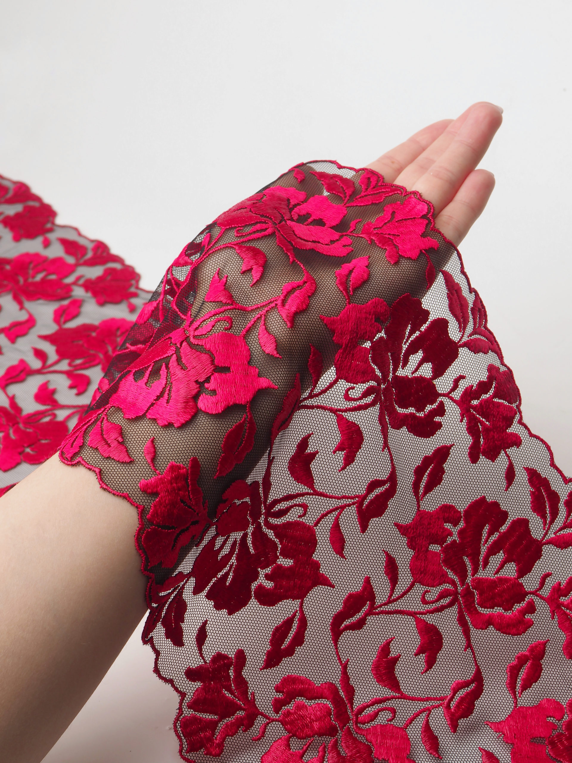 Кружево на сетке неэластичное с цветочным рисунком в левую и правую сторону. Вышивка красного цвета на чёрной сетке.