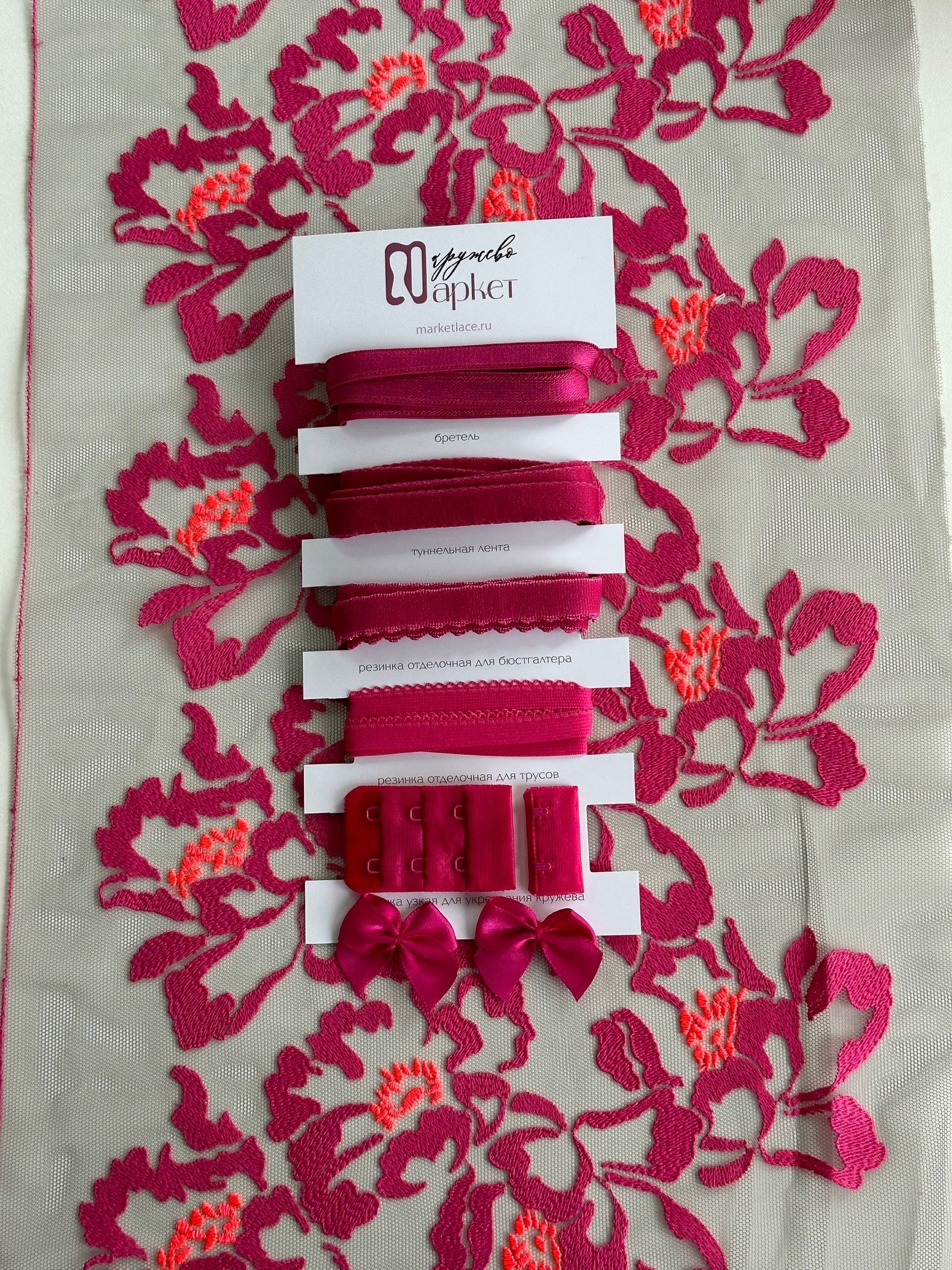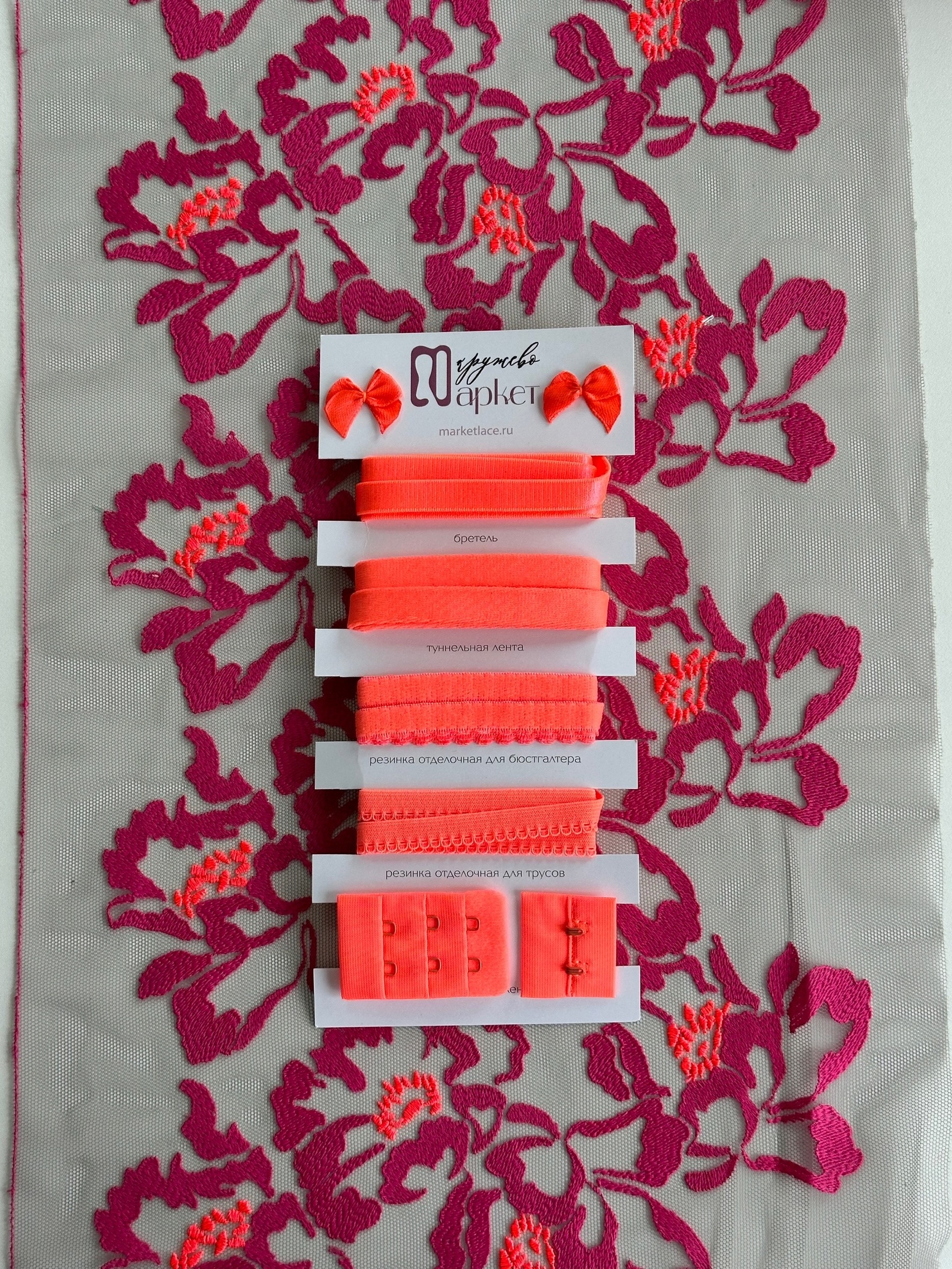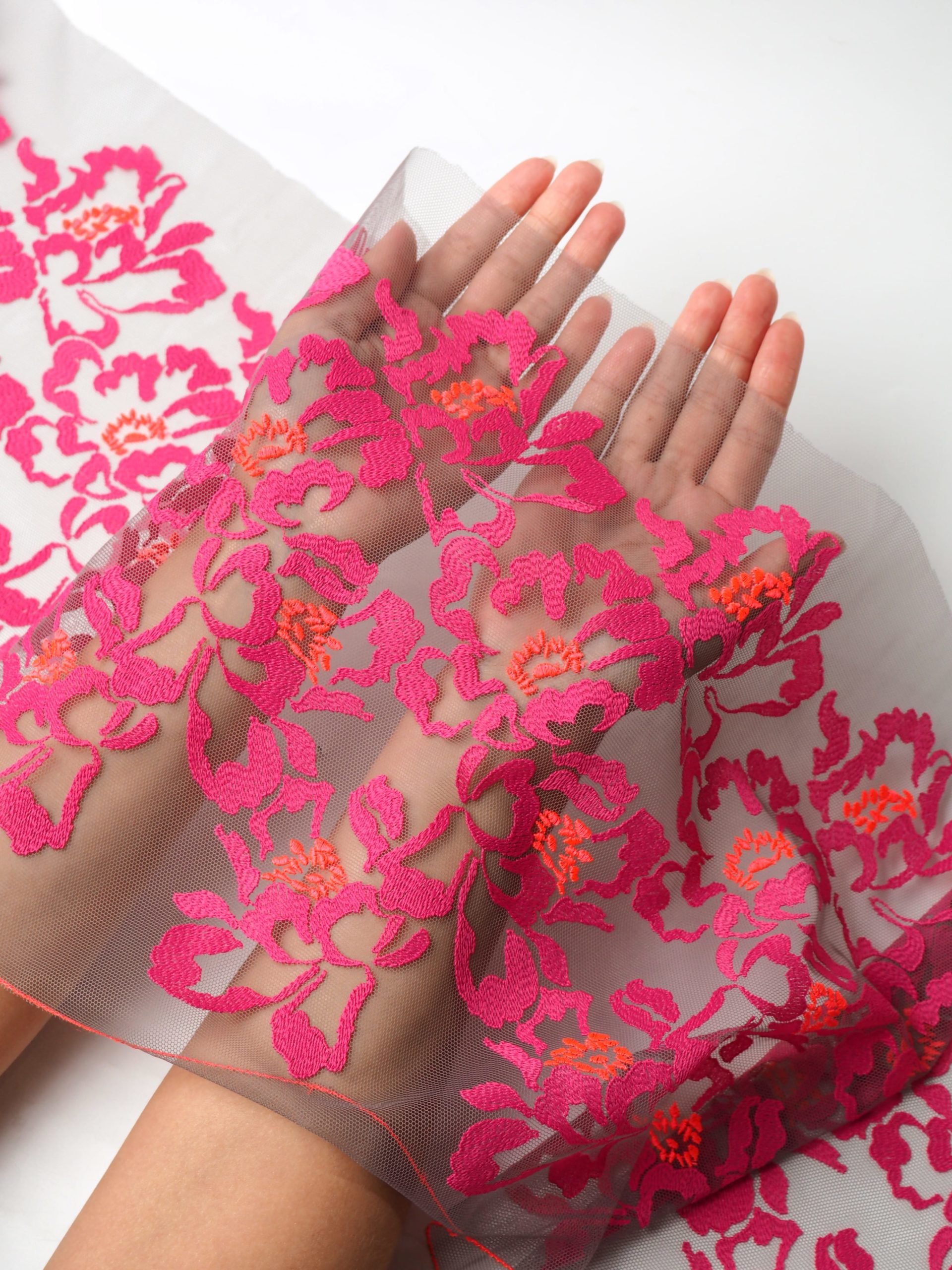 Кружево на сетке неэластичное серого и розового оттенка с цветочным рисунком в левую и правую сторону. Вышивка розового неонового и оранжевого цвета на дымчатой сетке.