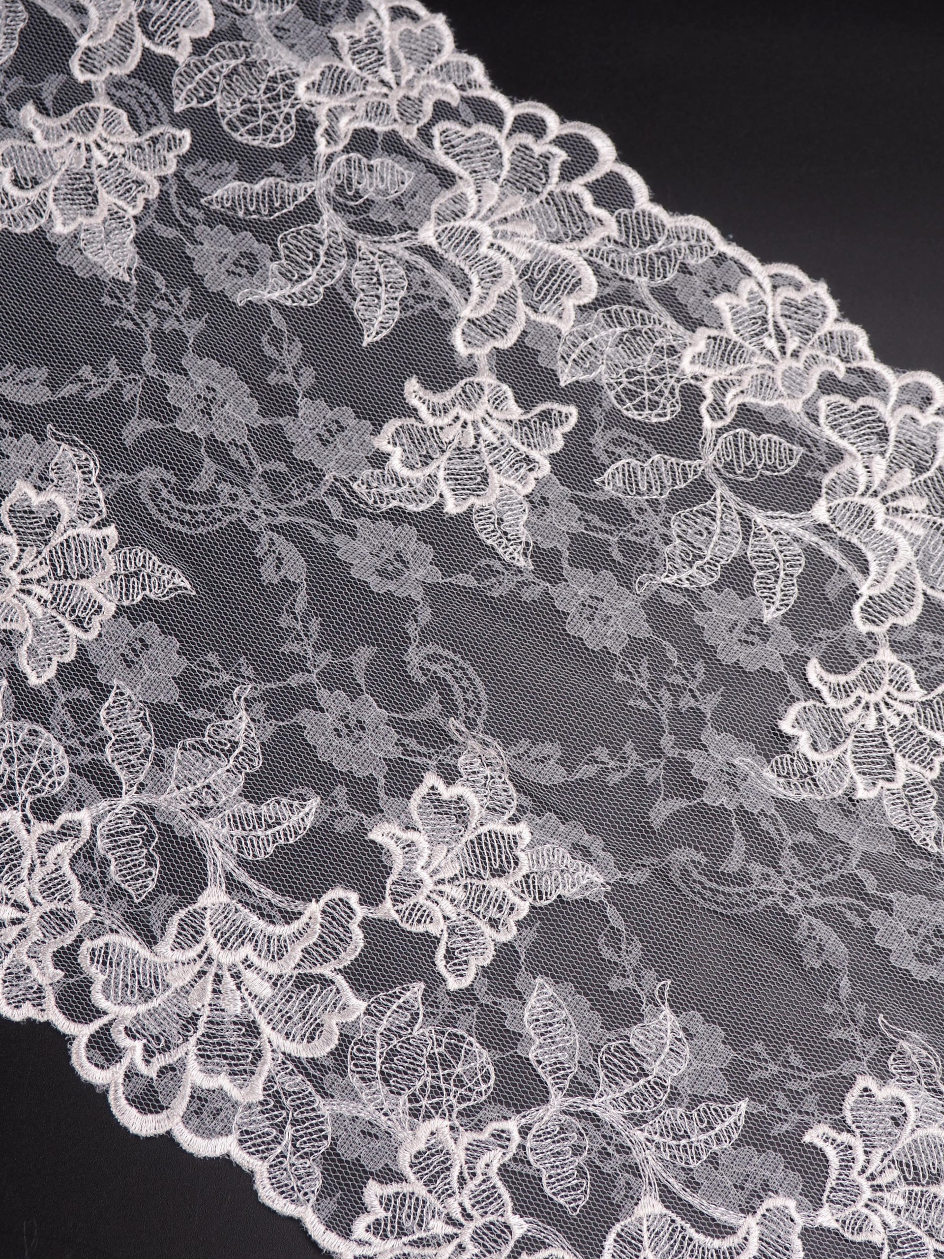 Кружево на сетке неэластичное белого оттенка. Вышивка цвета экрю на экрю сетке.