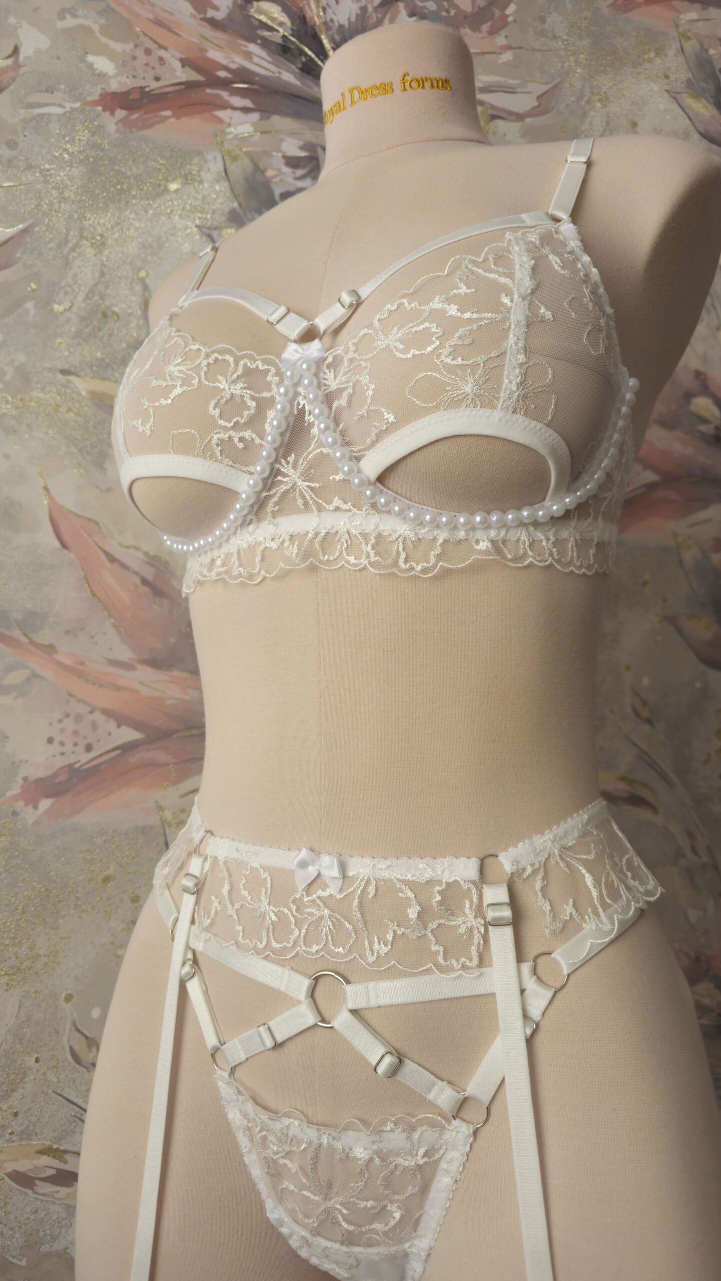 Кружево на сетке неэластичное белого оттенка с легким люрексом и цветочным рисунком. Вышивка цвета экрю с люрексом на сетке экрю.