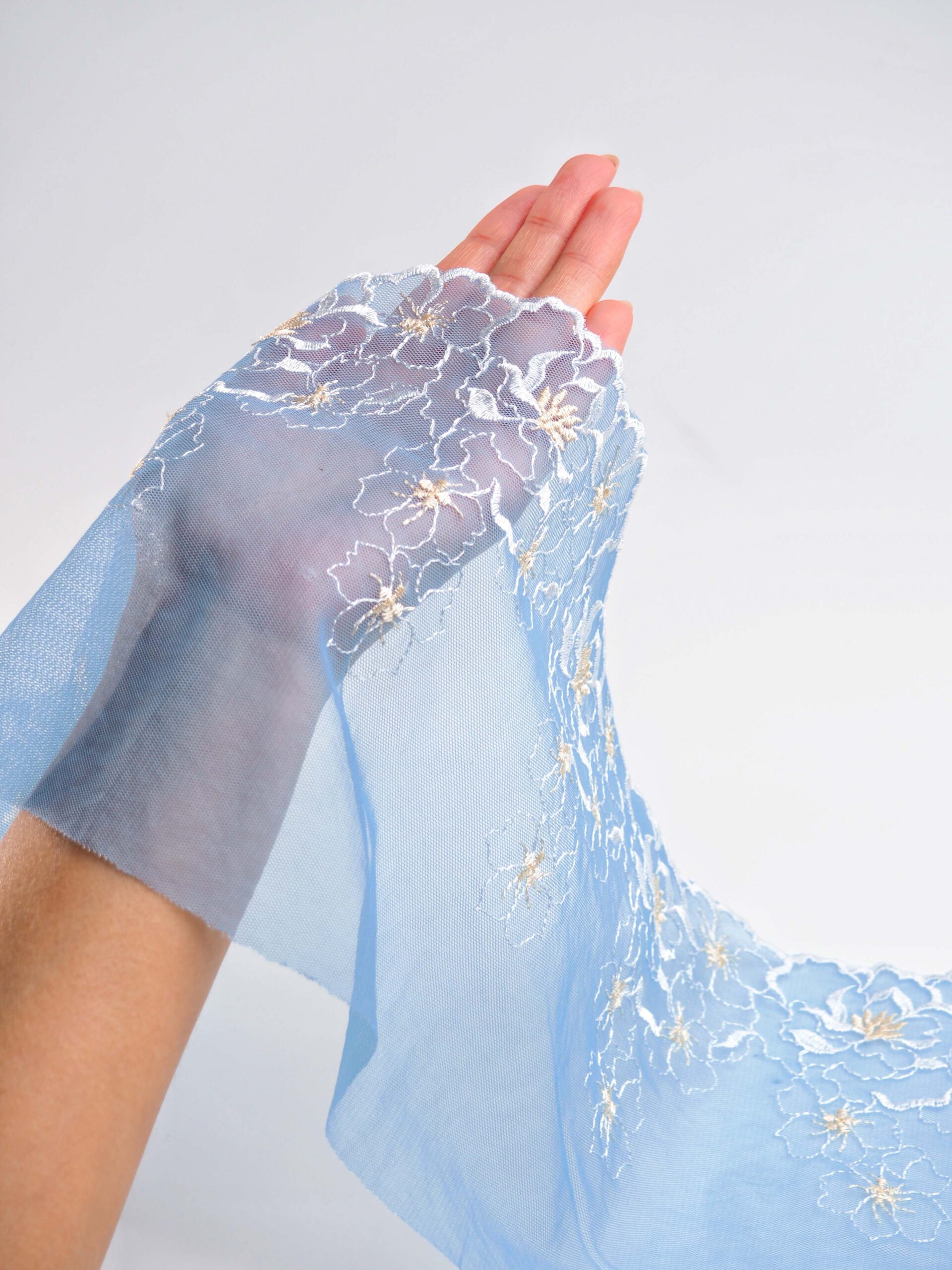 Вышивка на сетке неэластичная голубого цвета с белым и желтым в левую и правую сторону. Кружево на сетке голубое с бледно-желтым и белым.