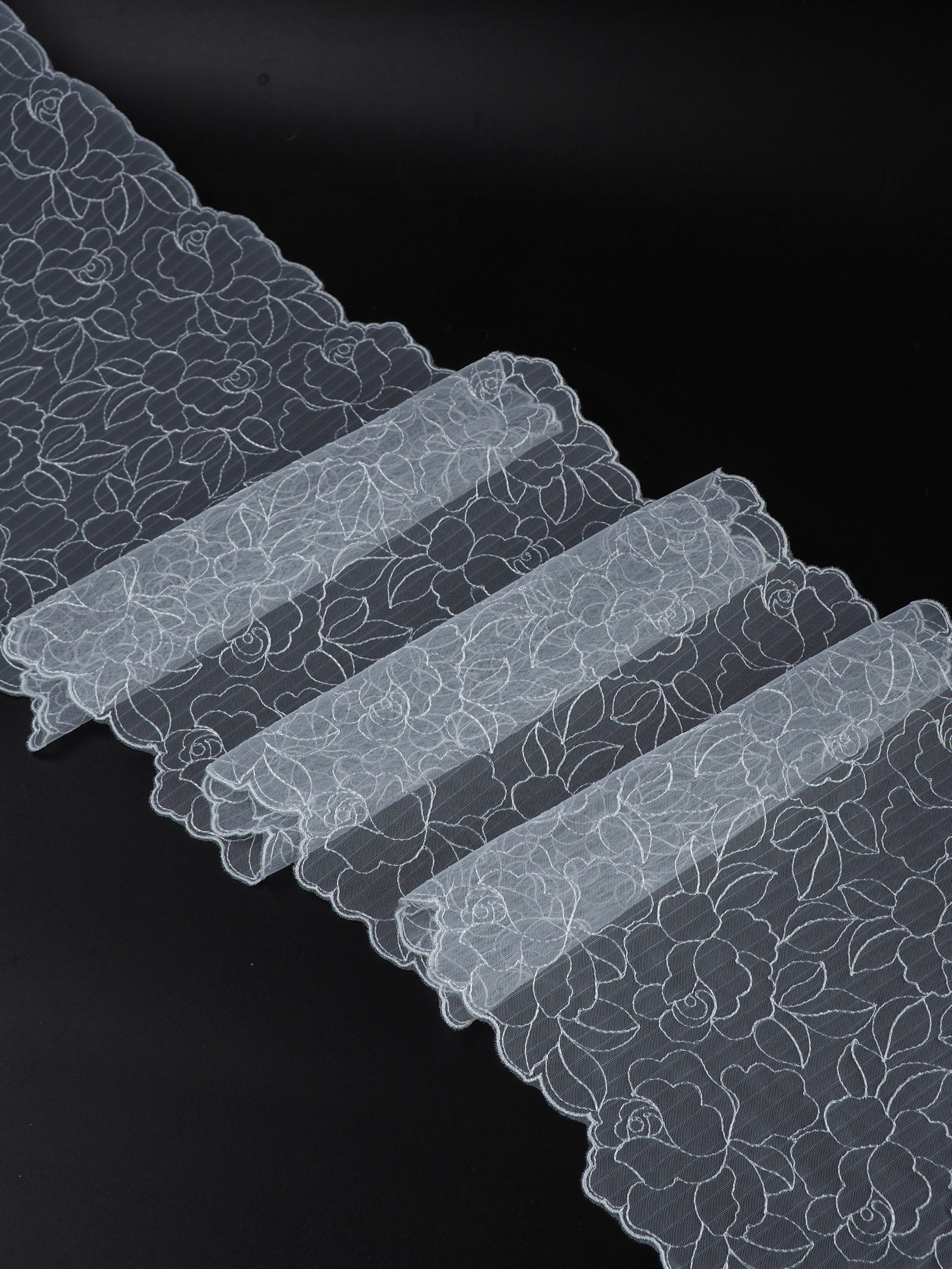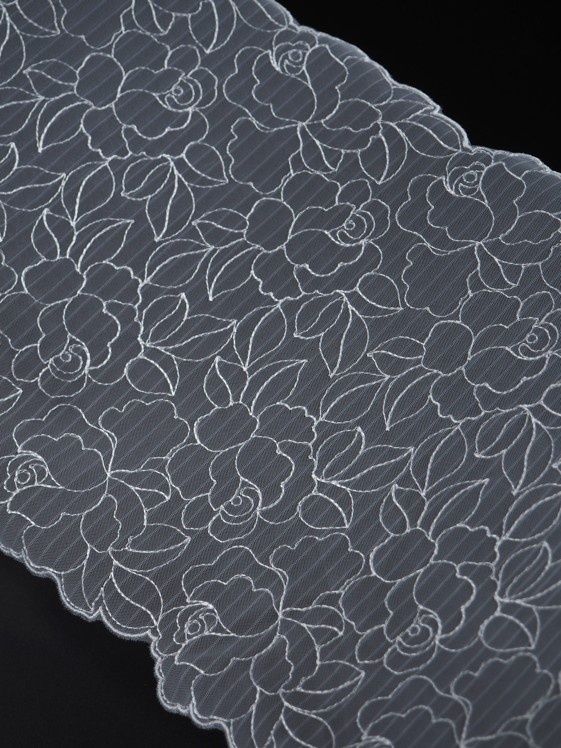 Кружево на сетке неэластичное с цветочным рисунком. Вышивка белого цвета на белой сетке.
