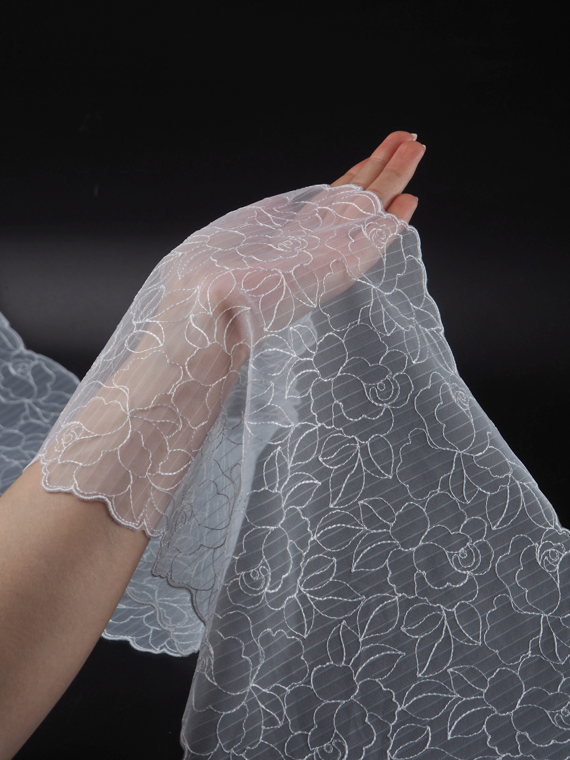 Вышивка на сетке холодная белая - удобная и красивая ткань для создания оригинального декора. Готовая основа с кружевными узорами и орнаментами - настоящая помощь рукодельницам. Вышивка на сетке великолепно держит форму, не осыпается по краям, отлично драпируется, отличается высокой прочностью на разрыв, весит очень мало, служит в течение многих лет. Используя кружево на сетке, вы легко создадите эффектное эксклюзивное изделие. Материал считается универсальным. Его можно использовать в пошиве нижнего белья, кофты, юбки, блузки, вечернего и свадебного платья.