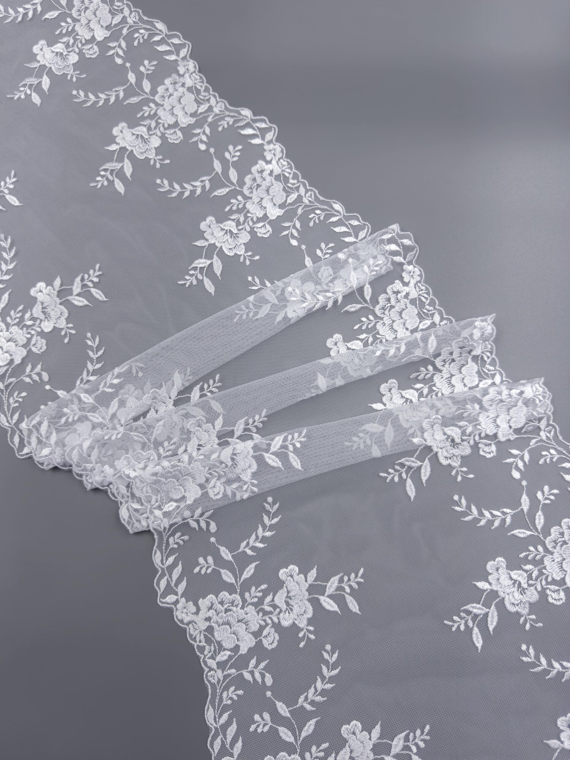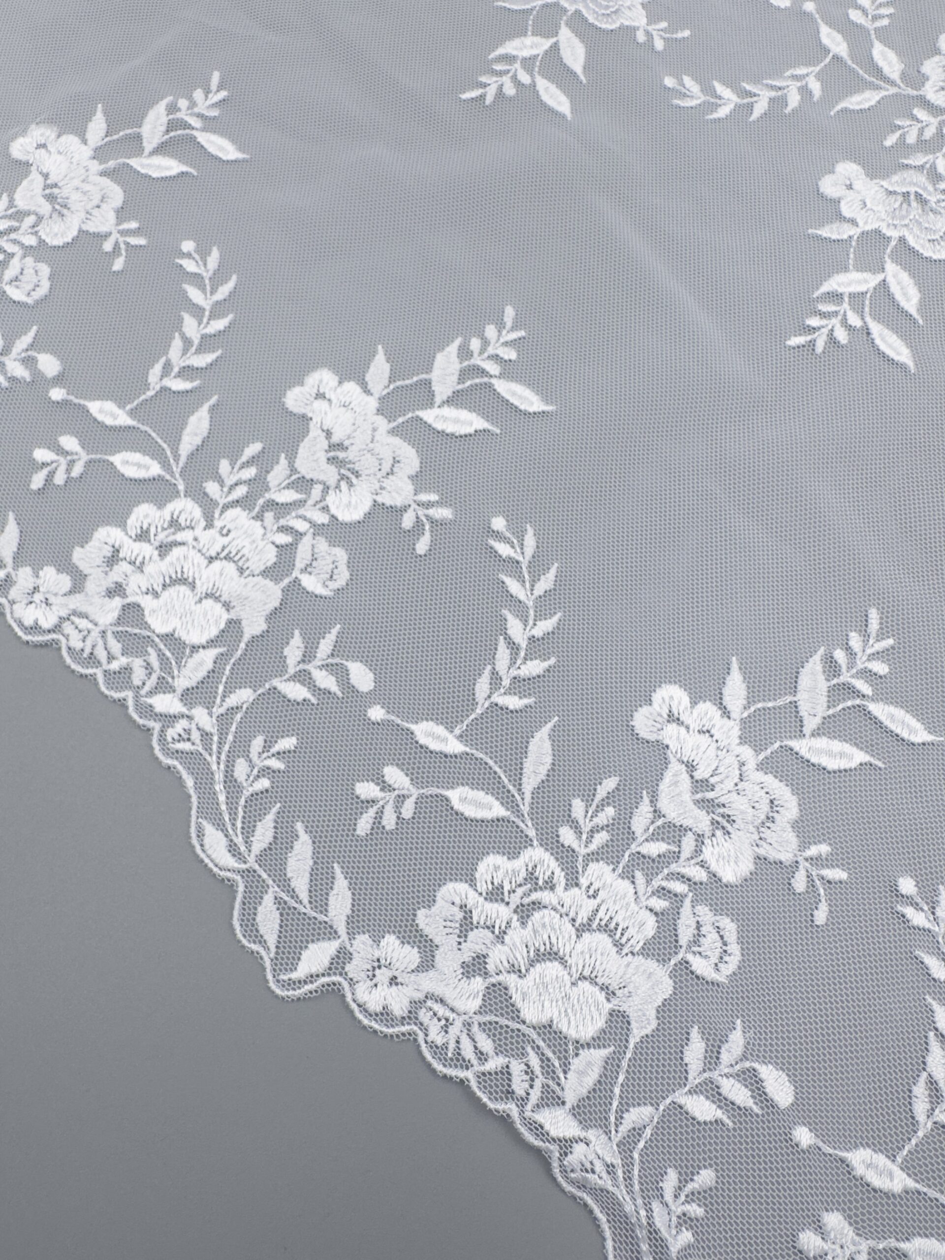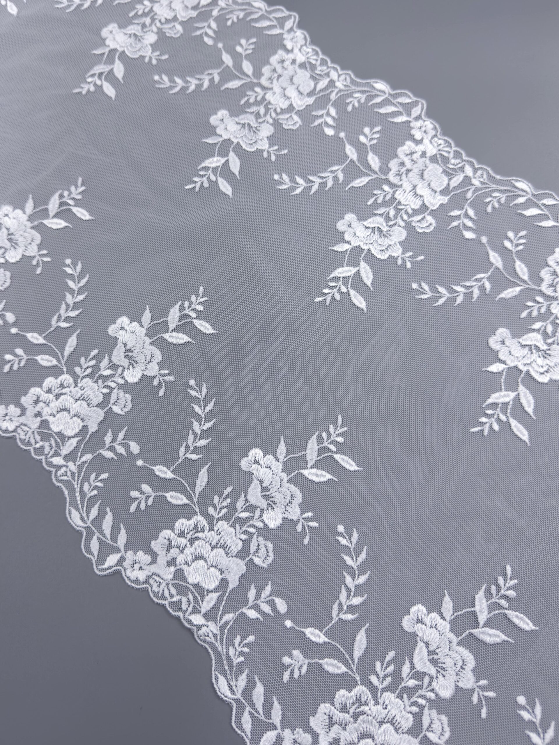 Кружево на сетке неэластичное холодного белого оттенка с цветочным рисунком. Вышивка белого цвета на белой сетке.