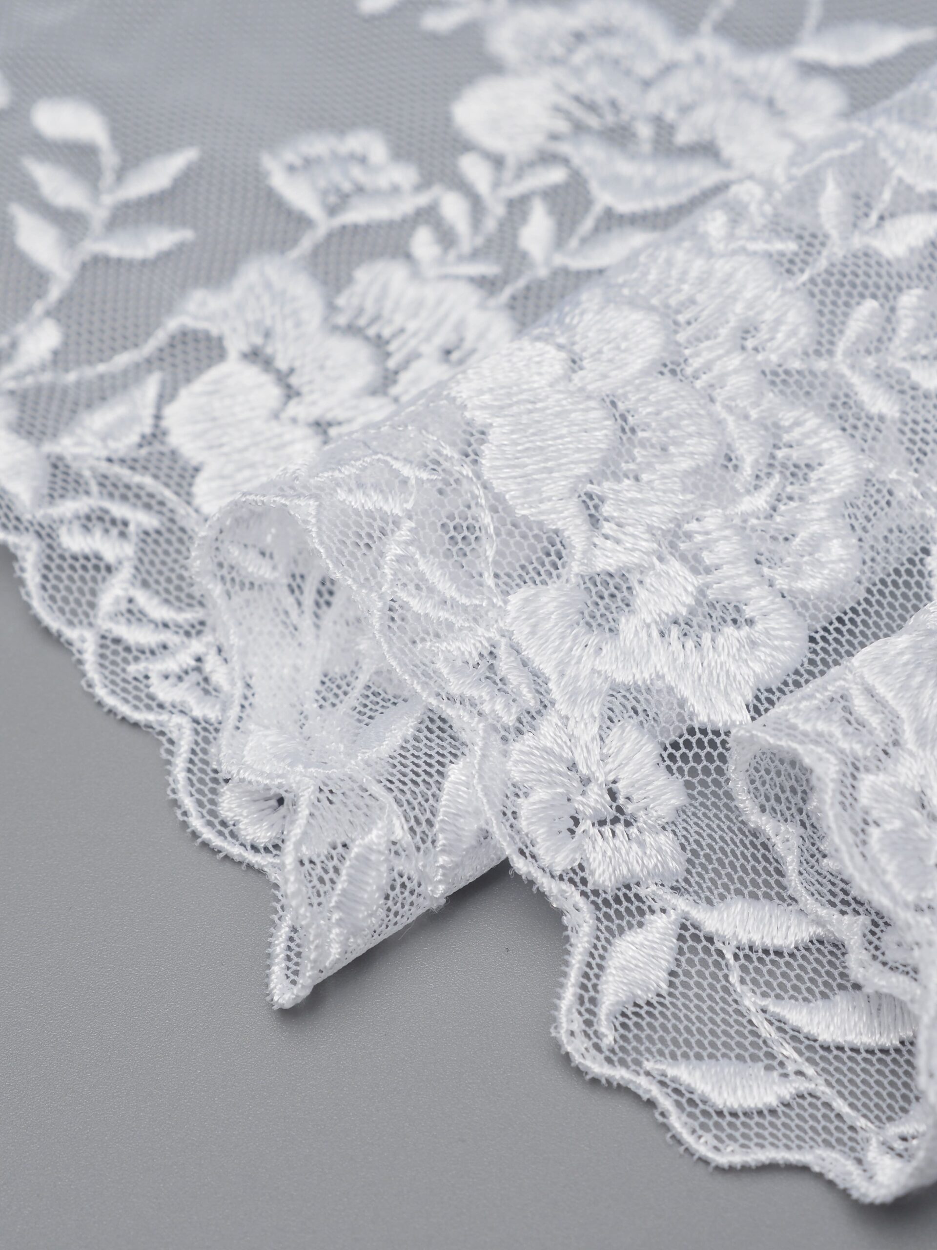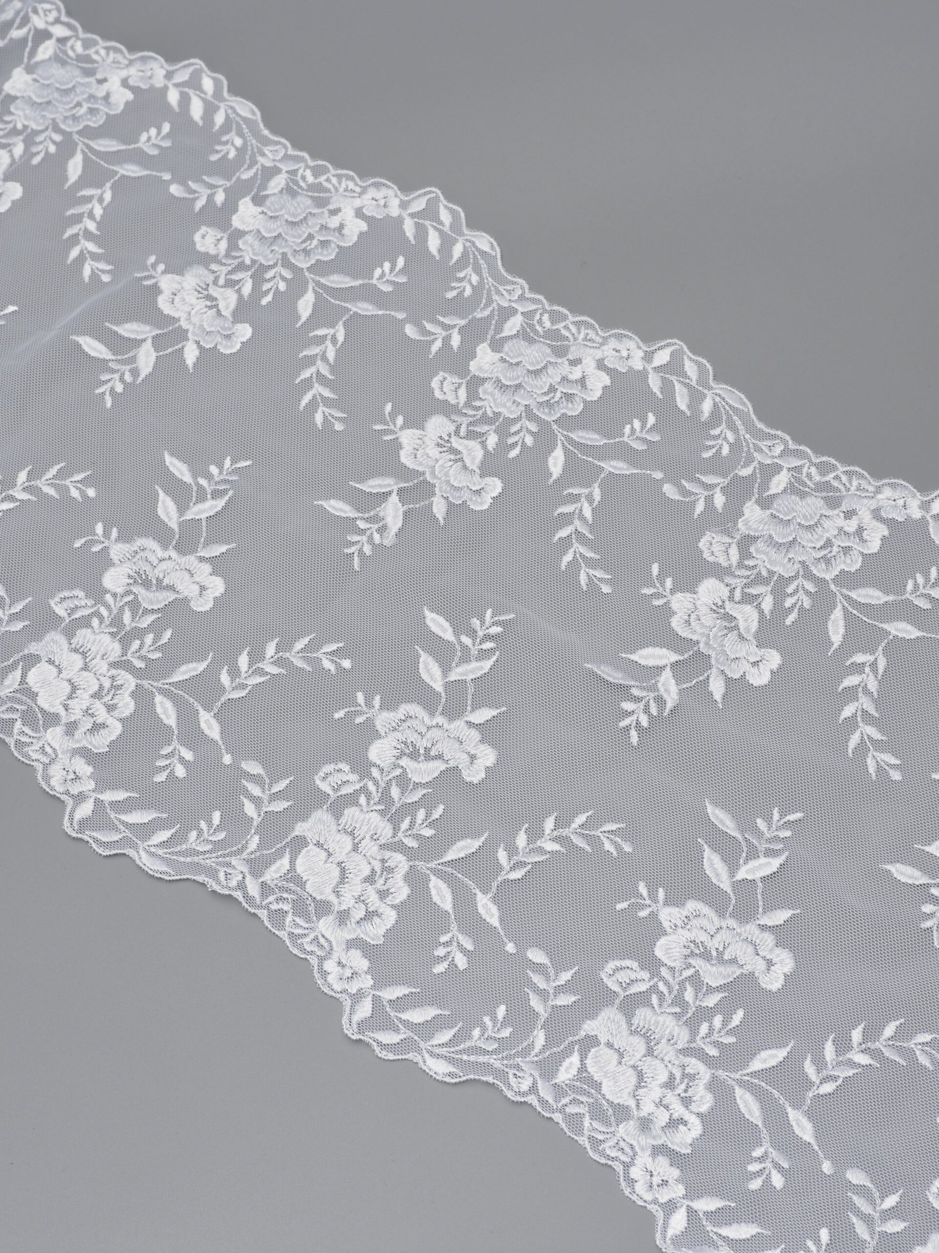 Кружево на сетке неэластичное кипельно-белого оттенка с цветочным рисунком. Вышивка белого цвета на белой сетке.