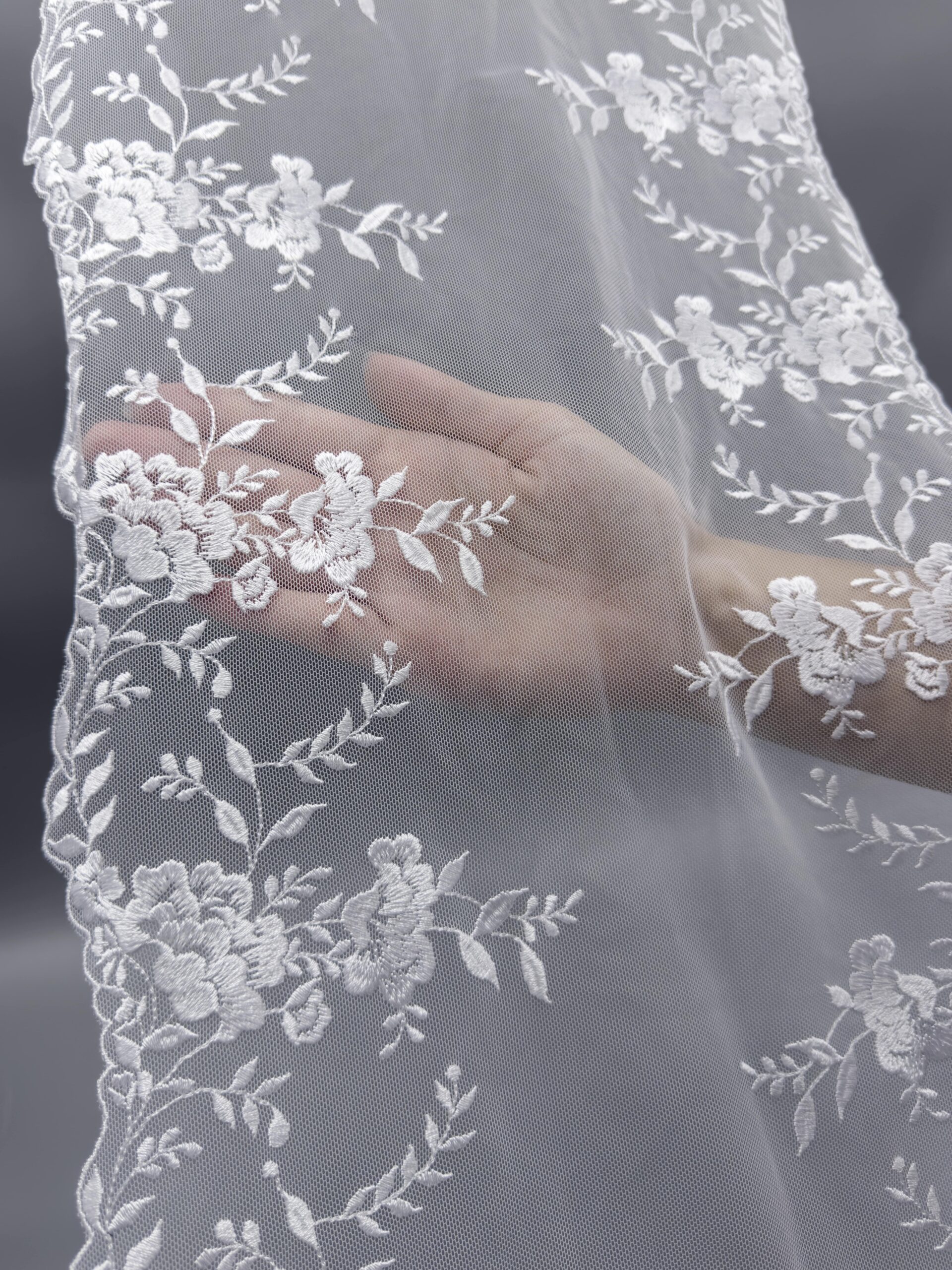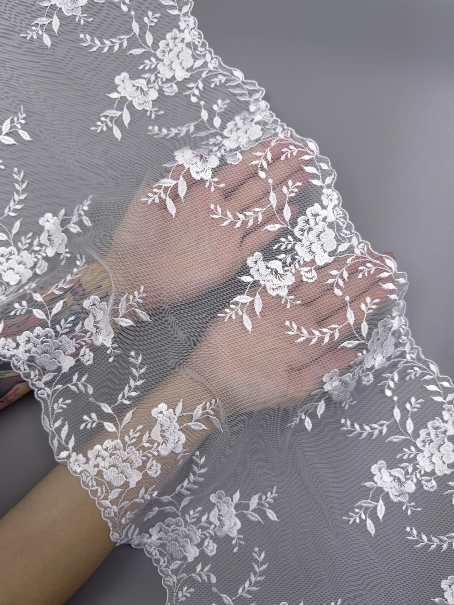 Кружево на сетке неэластичное холодного белого оттенка с цветочным рисунком. Вышивка белого цвета на белой сетке.