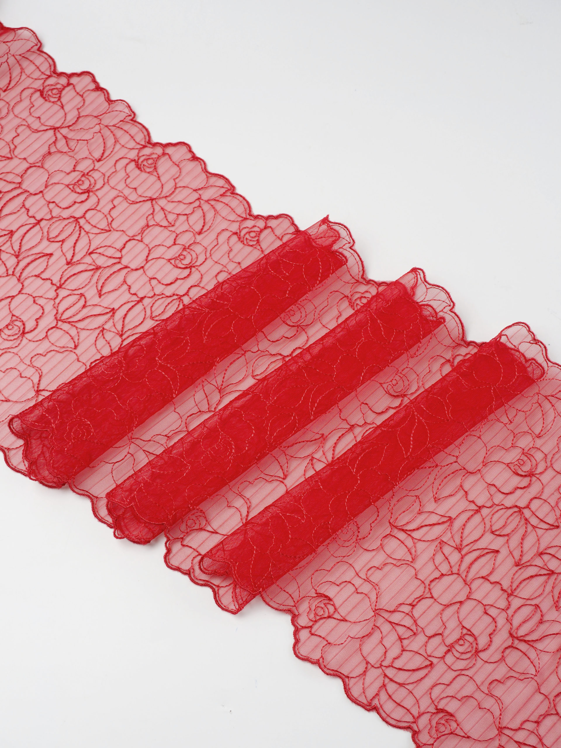Кружево на сетке неэластичное с цветочным рисунком. Вышивка красного цвета на красной сетке.