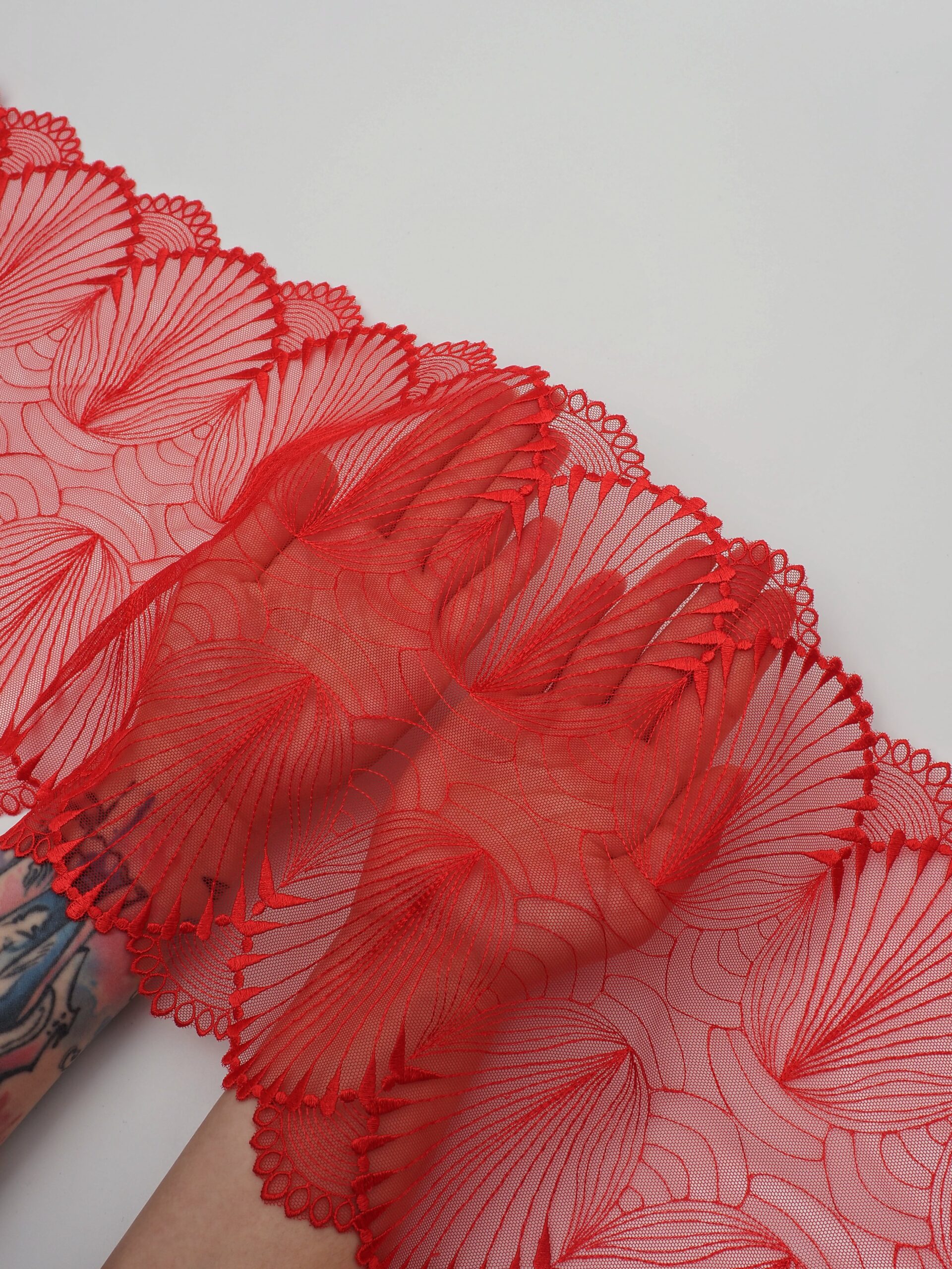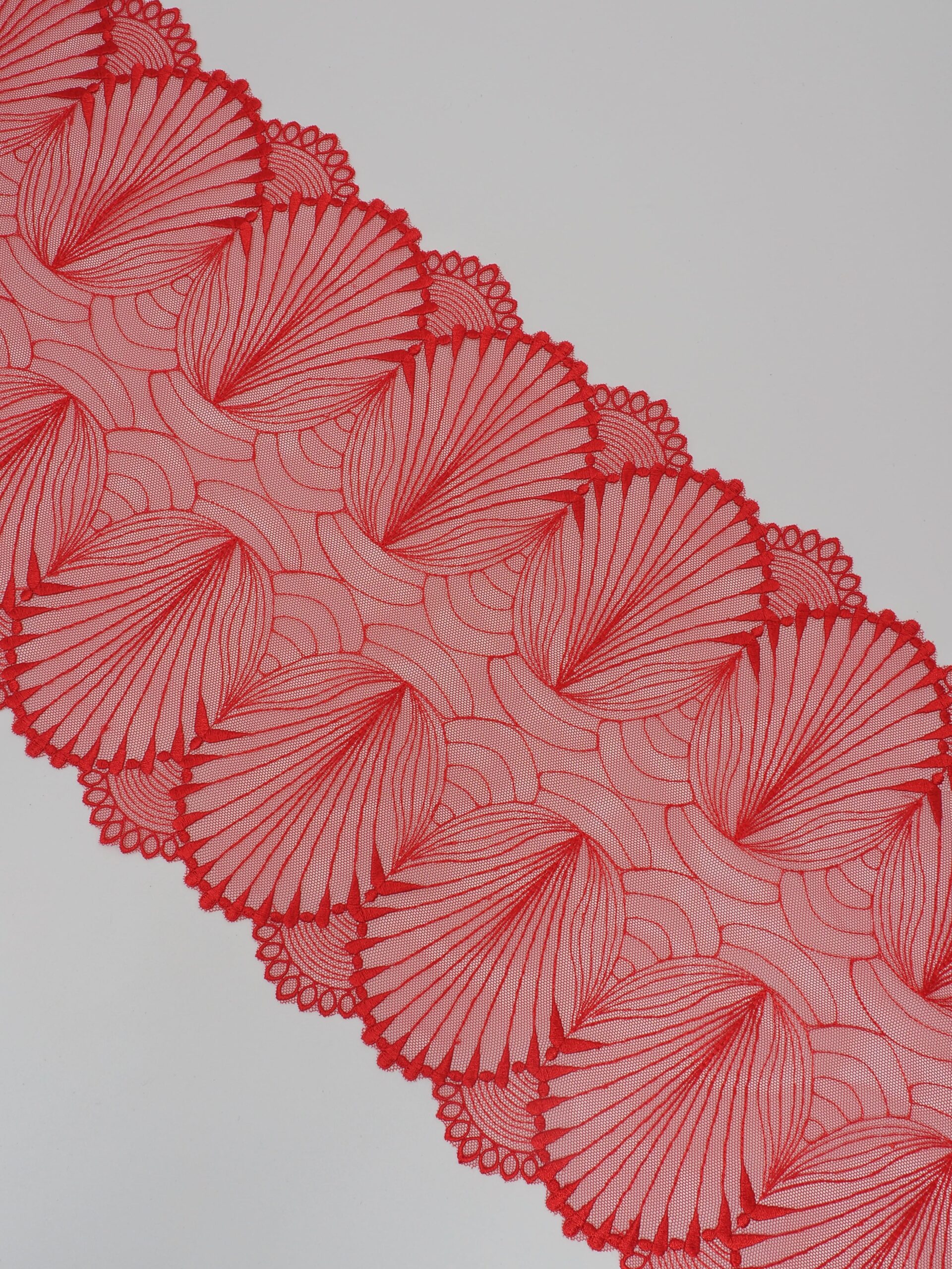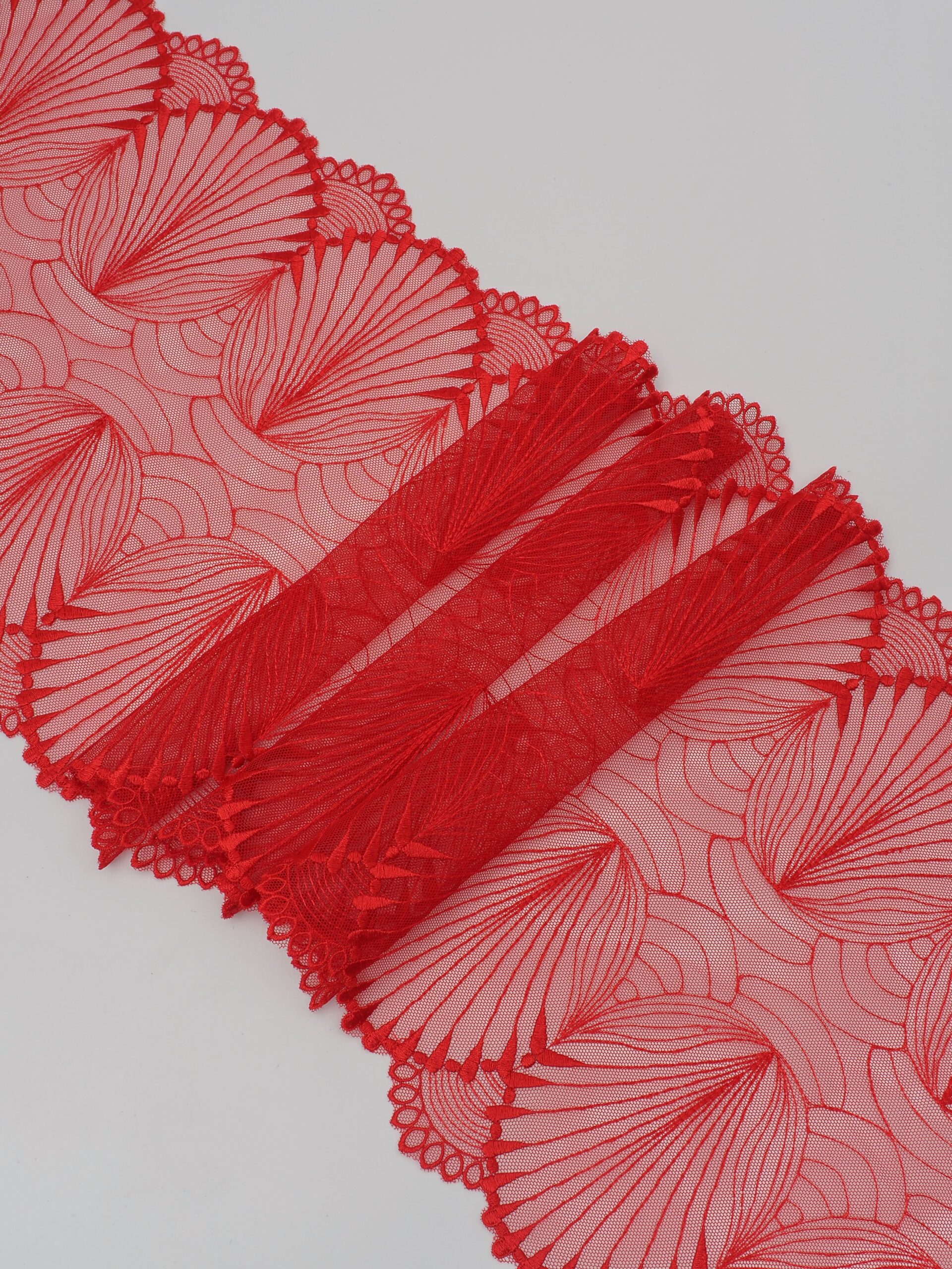 Кружево на сетке неэластичное красного цвета с узорчатой вышивкой. Вышивка на сетке красная.