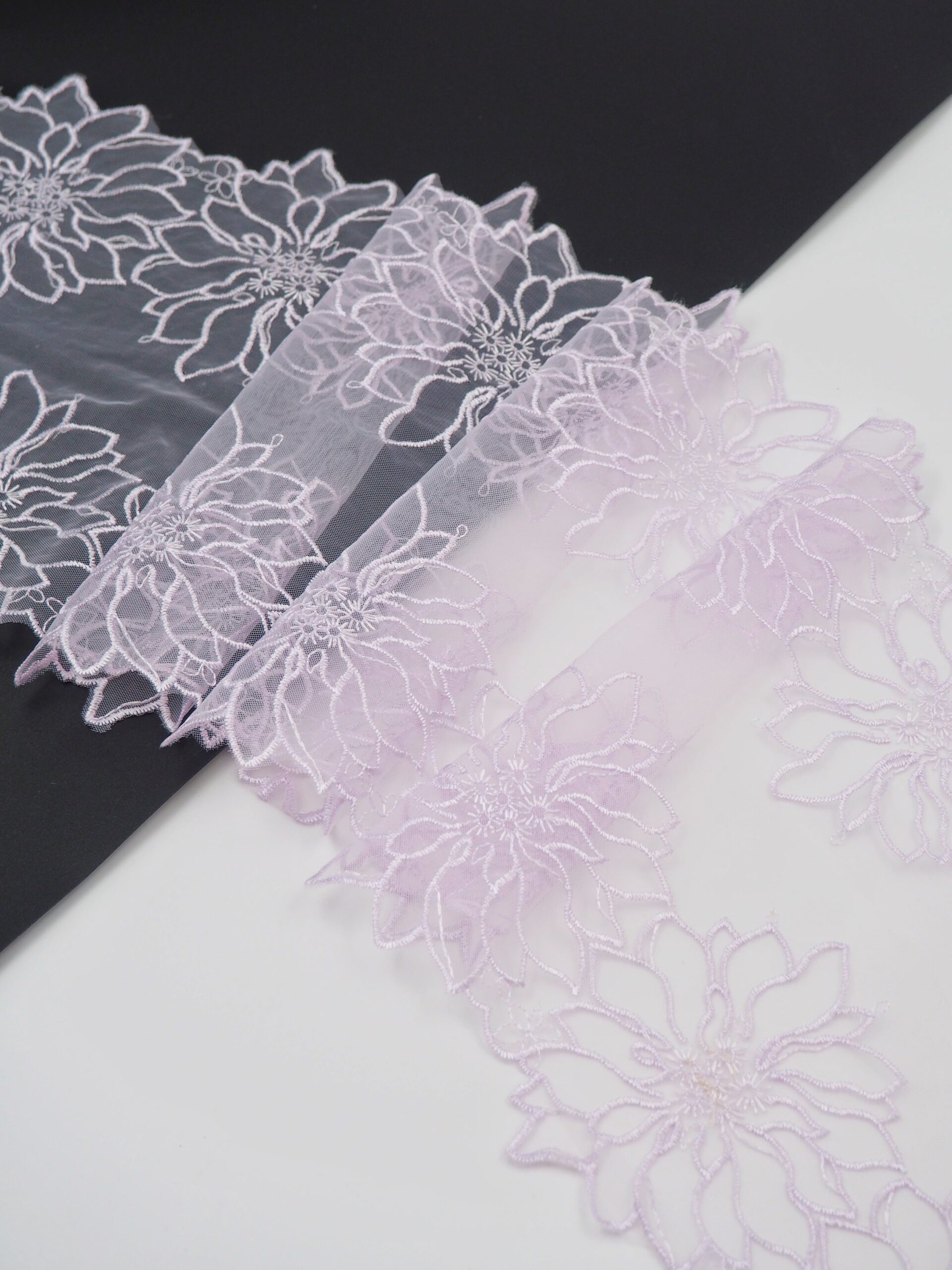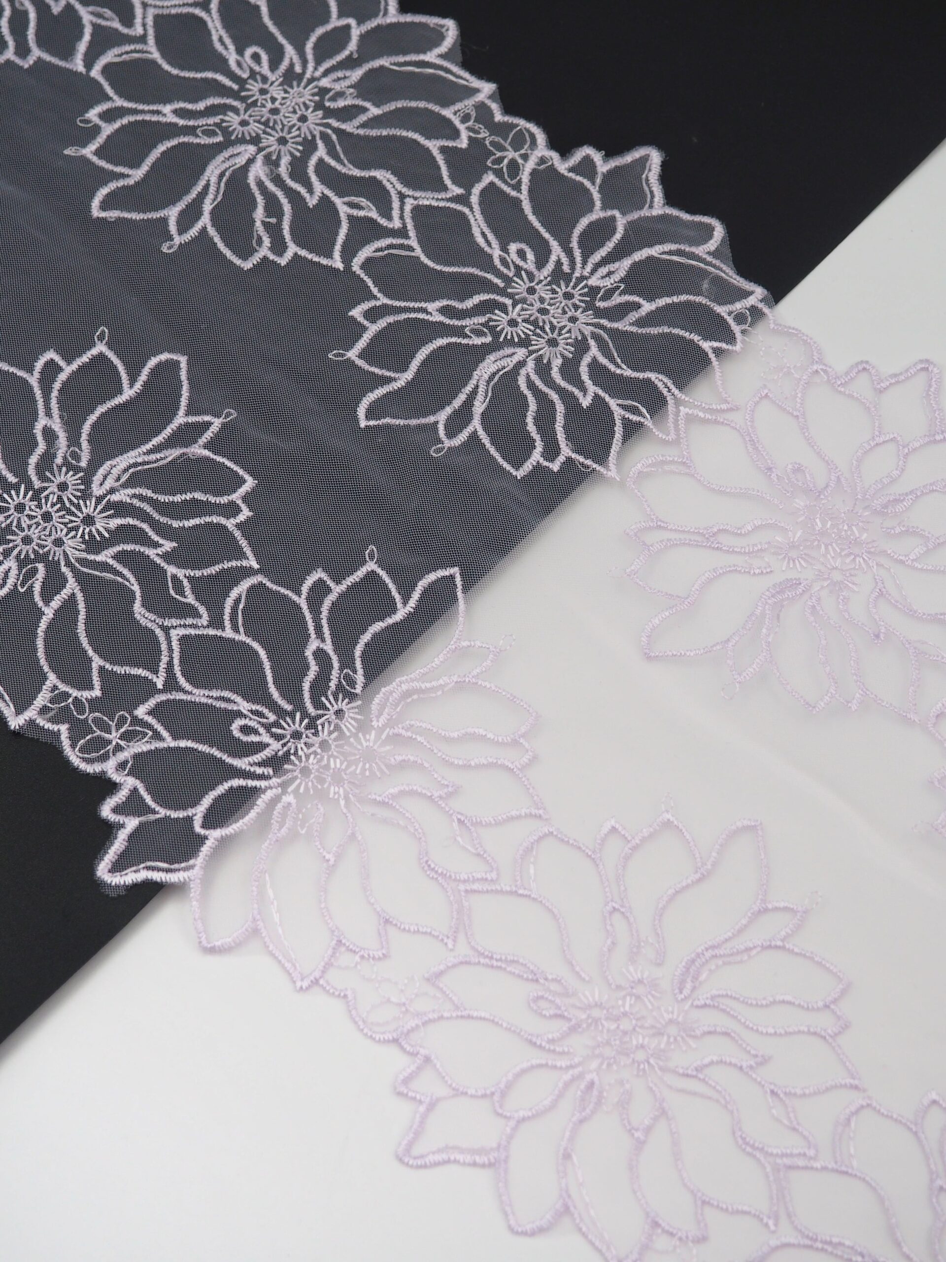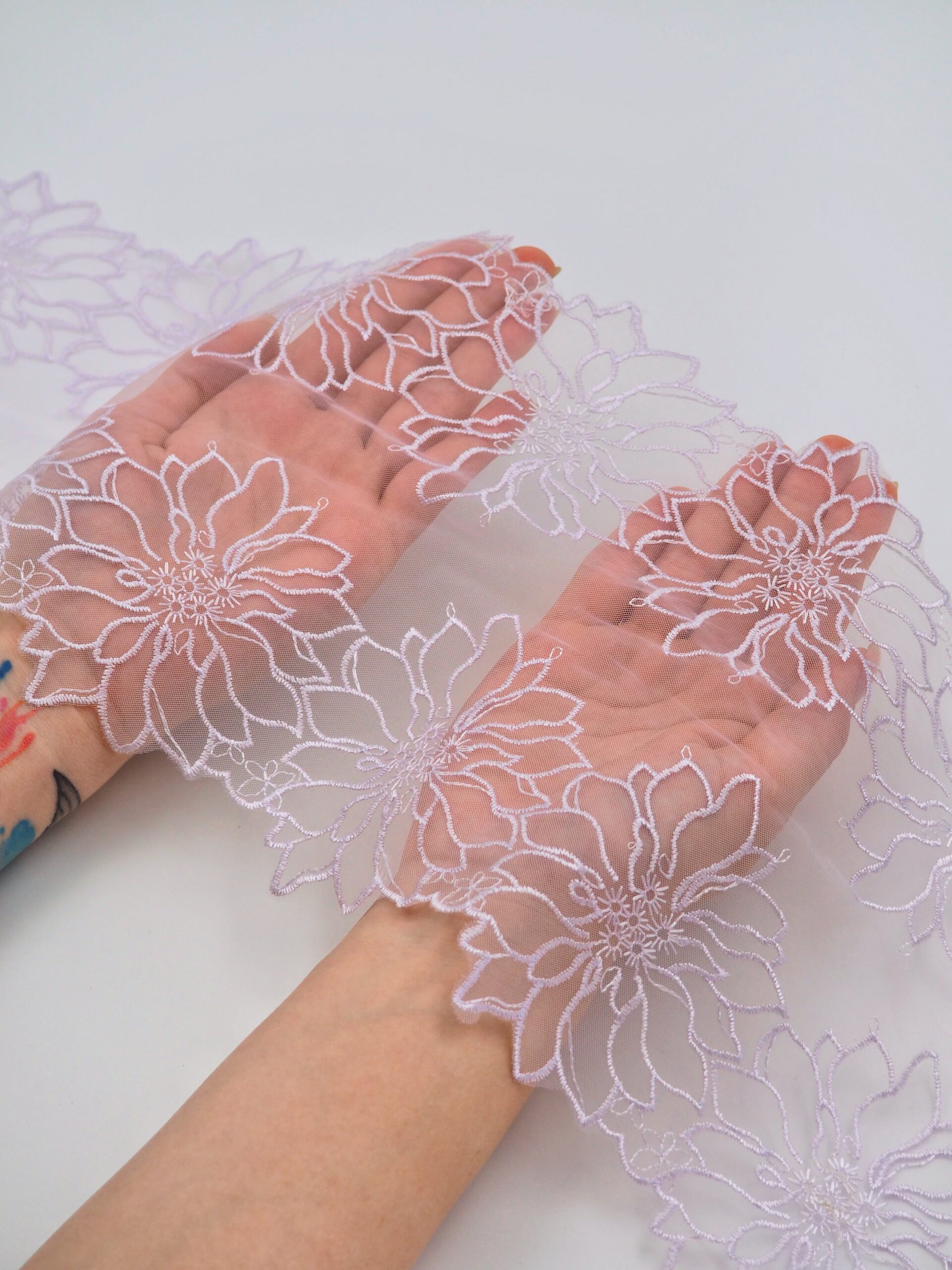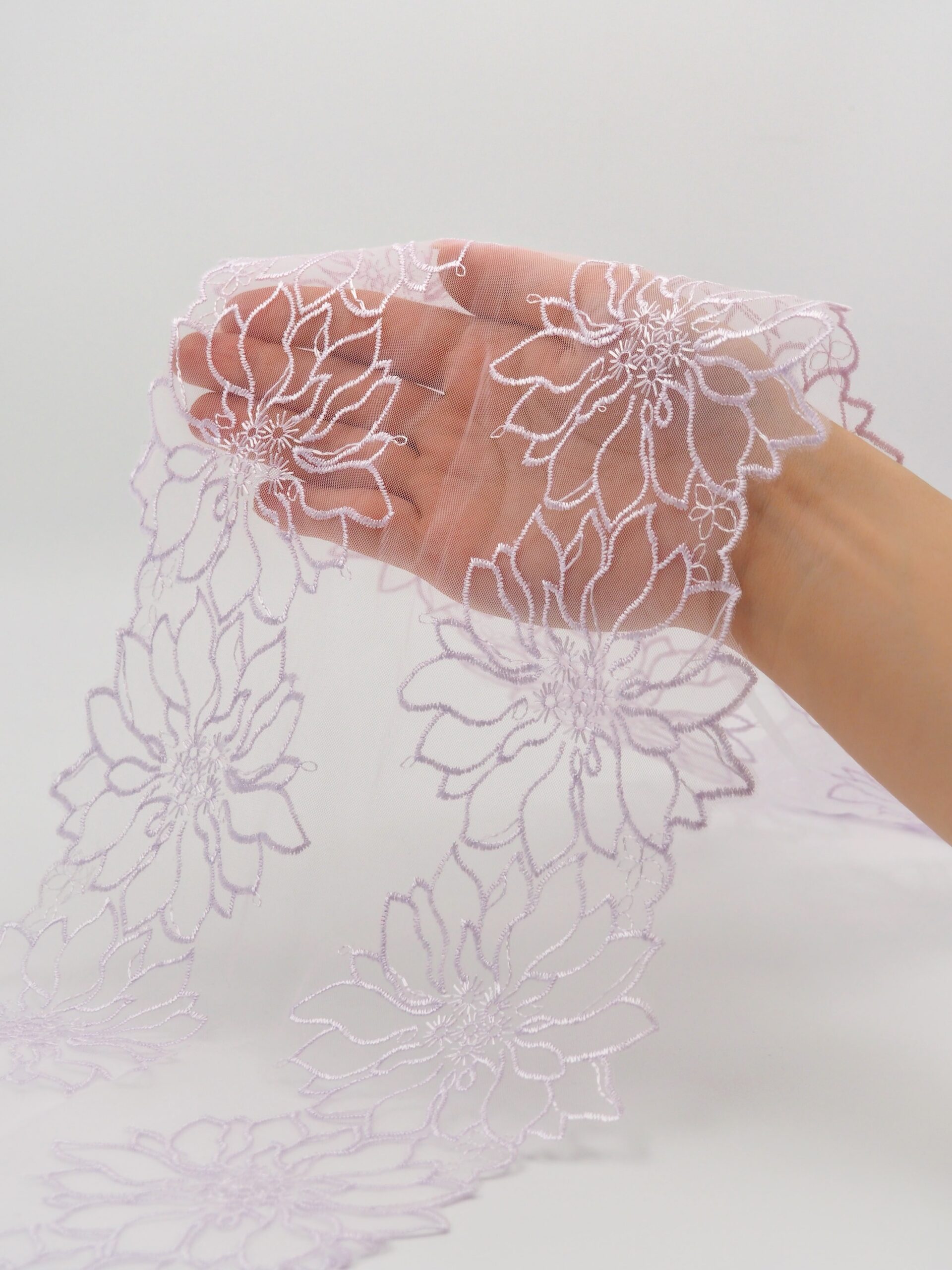 Кружево на сетке неэластичное фиолетового оттенка с цветочным рисунком. Вышивка на лавандовой сетке с лавандовыми цветами.